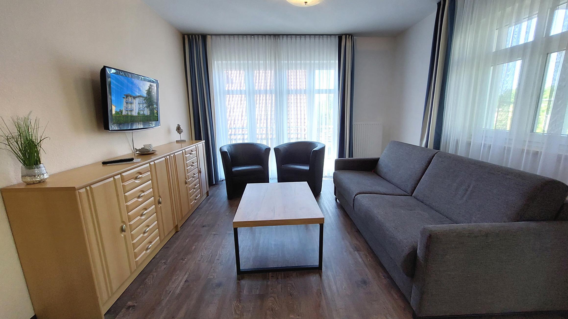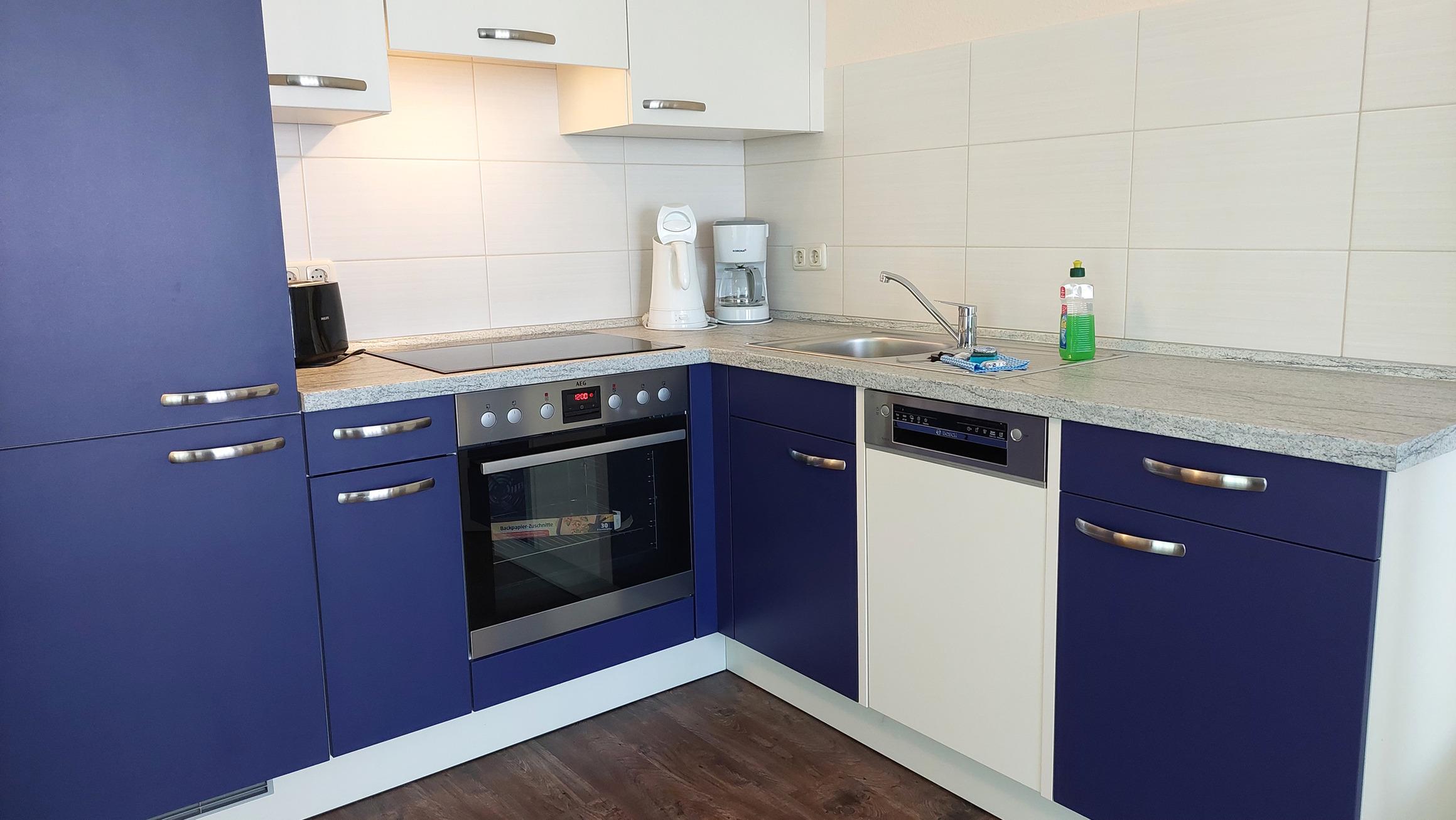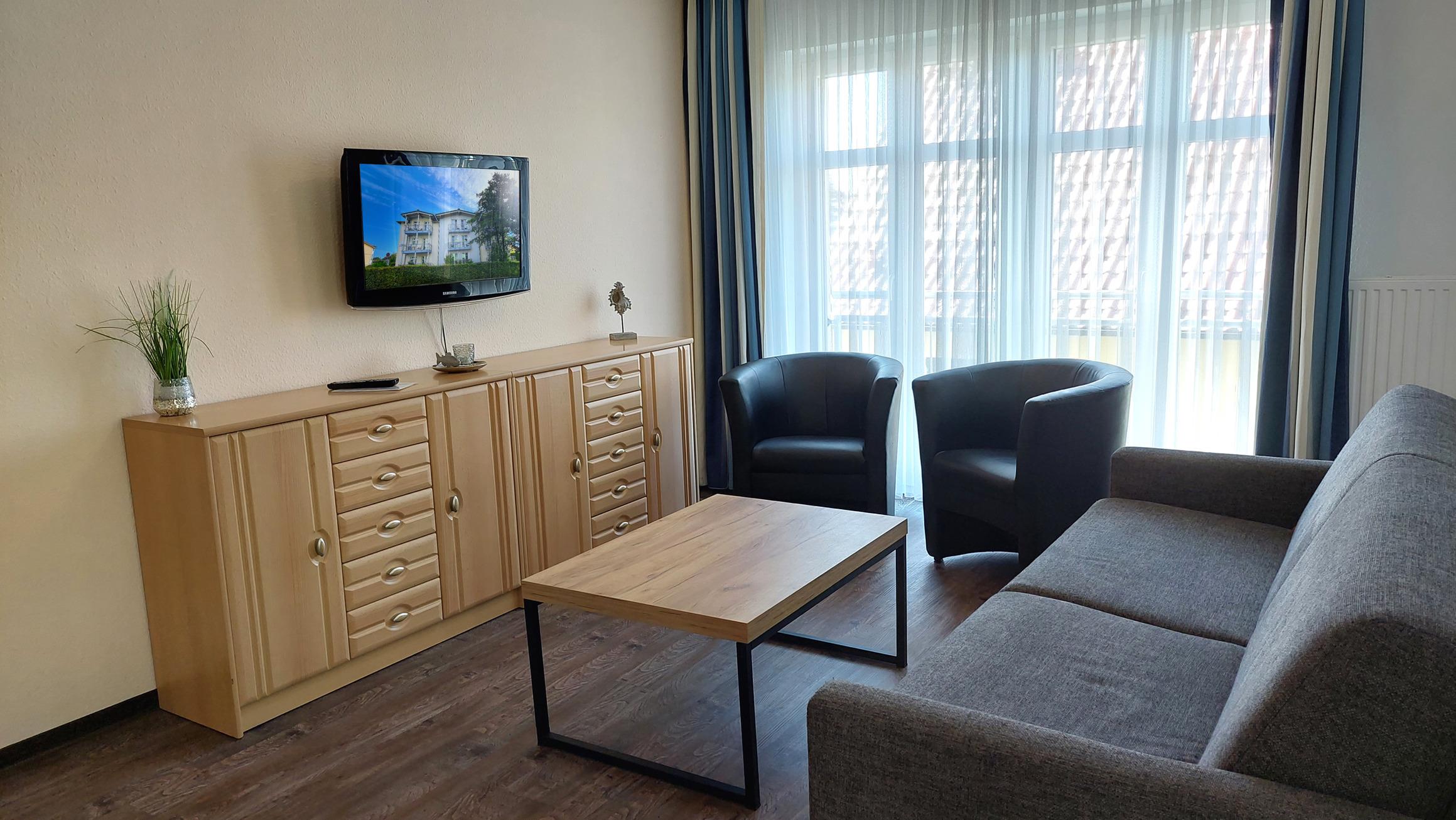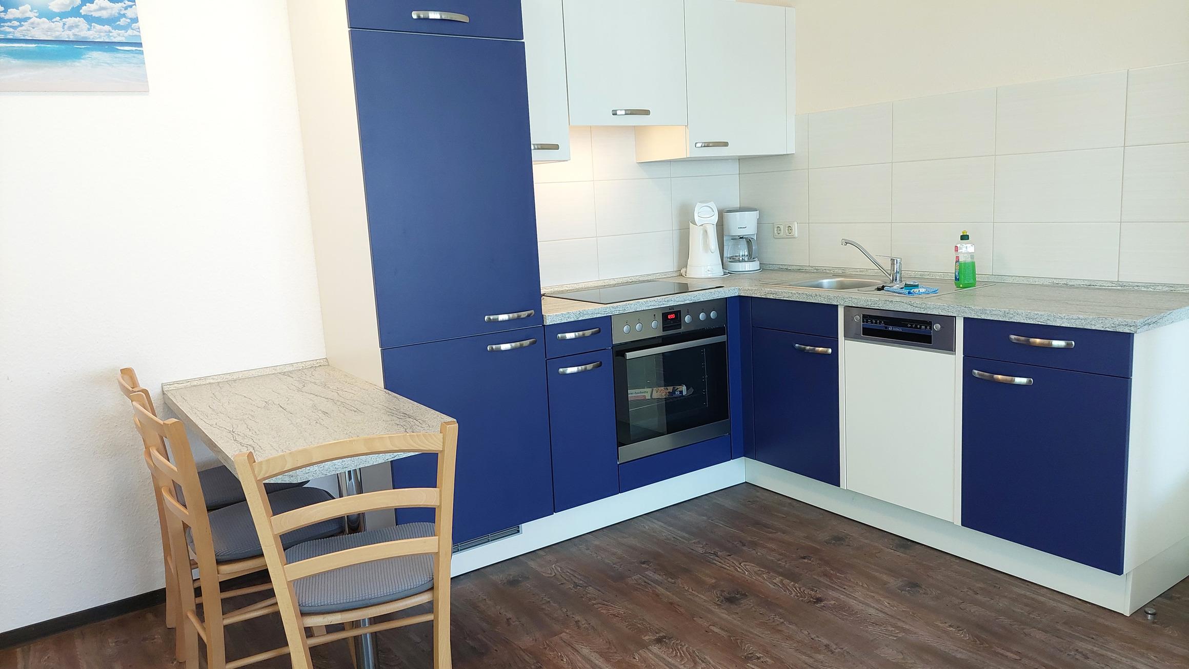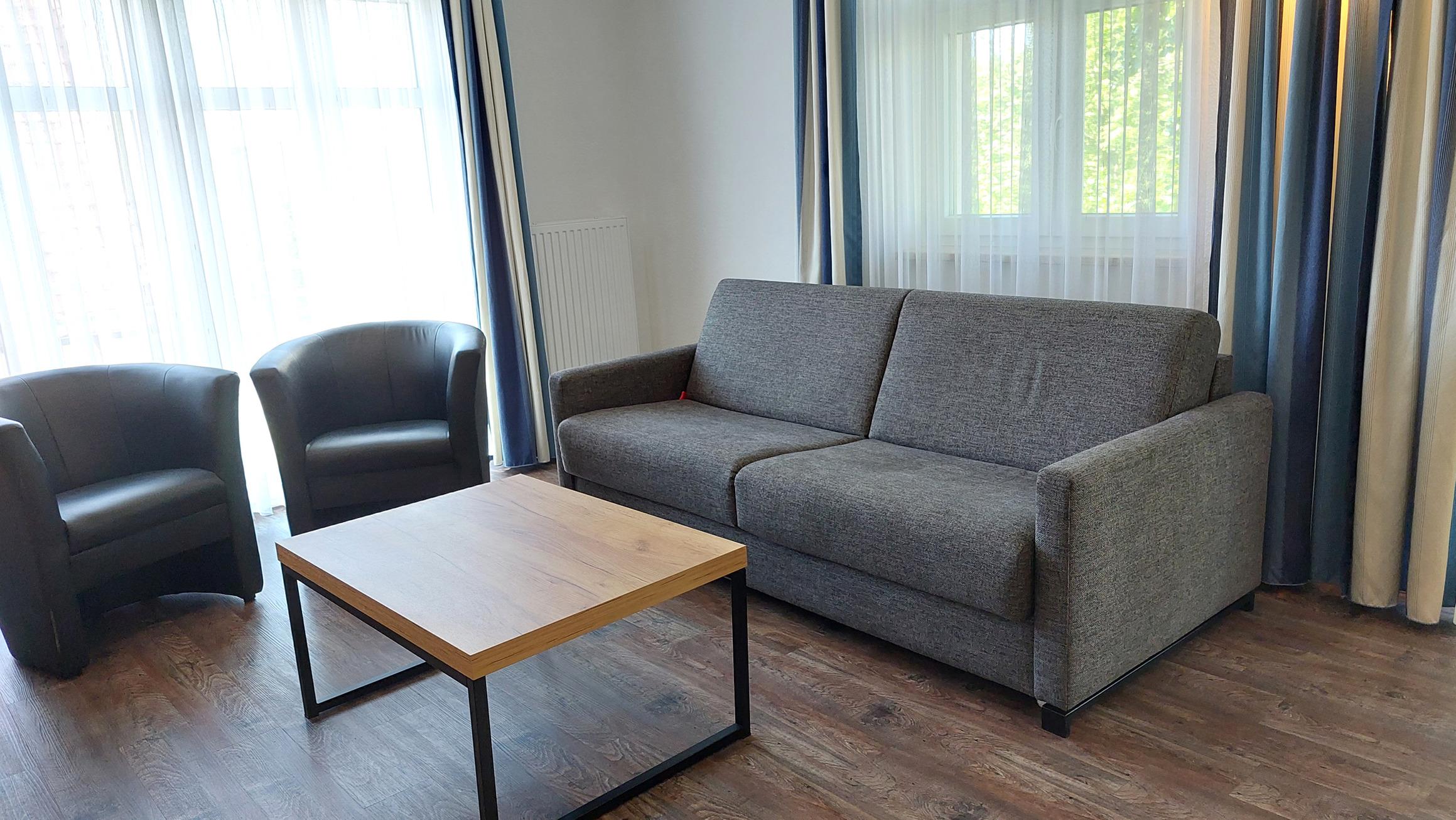 Diese freundliche Wohnung ist aufgeteilt in einen Wohnraum mit Balkon und integrierter Küchenzeile, ein Schlafzimmer ebenso mit Balkon und ein Duschbad mit Waschtisch und WC. Das Wohnzimmer begrüßt Sie mit einem Schlafsofa und Sessel sowie Flachbild-TV. Das Schlafzimmer verfügt über ein Doppelbett (1,80m x 2m) sowie einen Kleiderschrank. Die Küchenzeile ist mit Backofen, Geschirrspüler, Cerankochfeld, Kühlschrank mit kleinem Gefrierfach, Cerankochfeld, Mikrowelle, Kaffeemaschine, Wasserkocher und Toaster ausgestattet. Highlights: Kostenfreies WLAN sowie ein frei wählbarer PKW-Stellplatz direkt am Haus. Haustiere sind in dieser Wohnung herzlich willkommen.