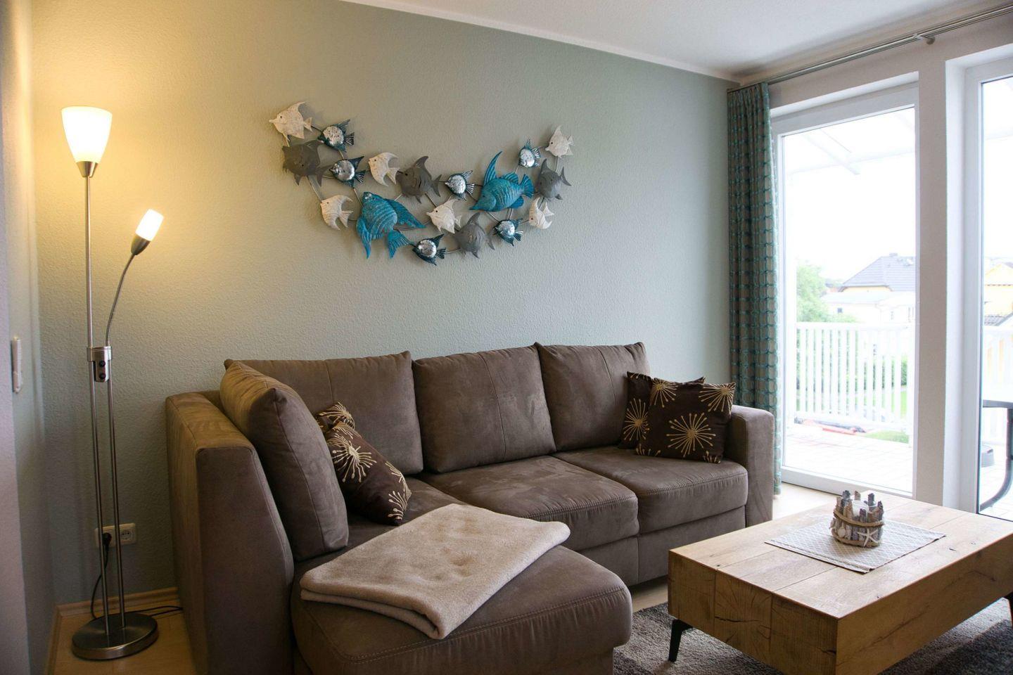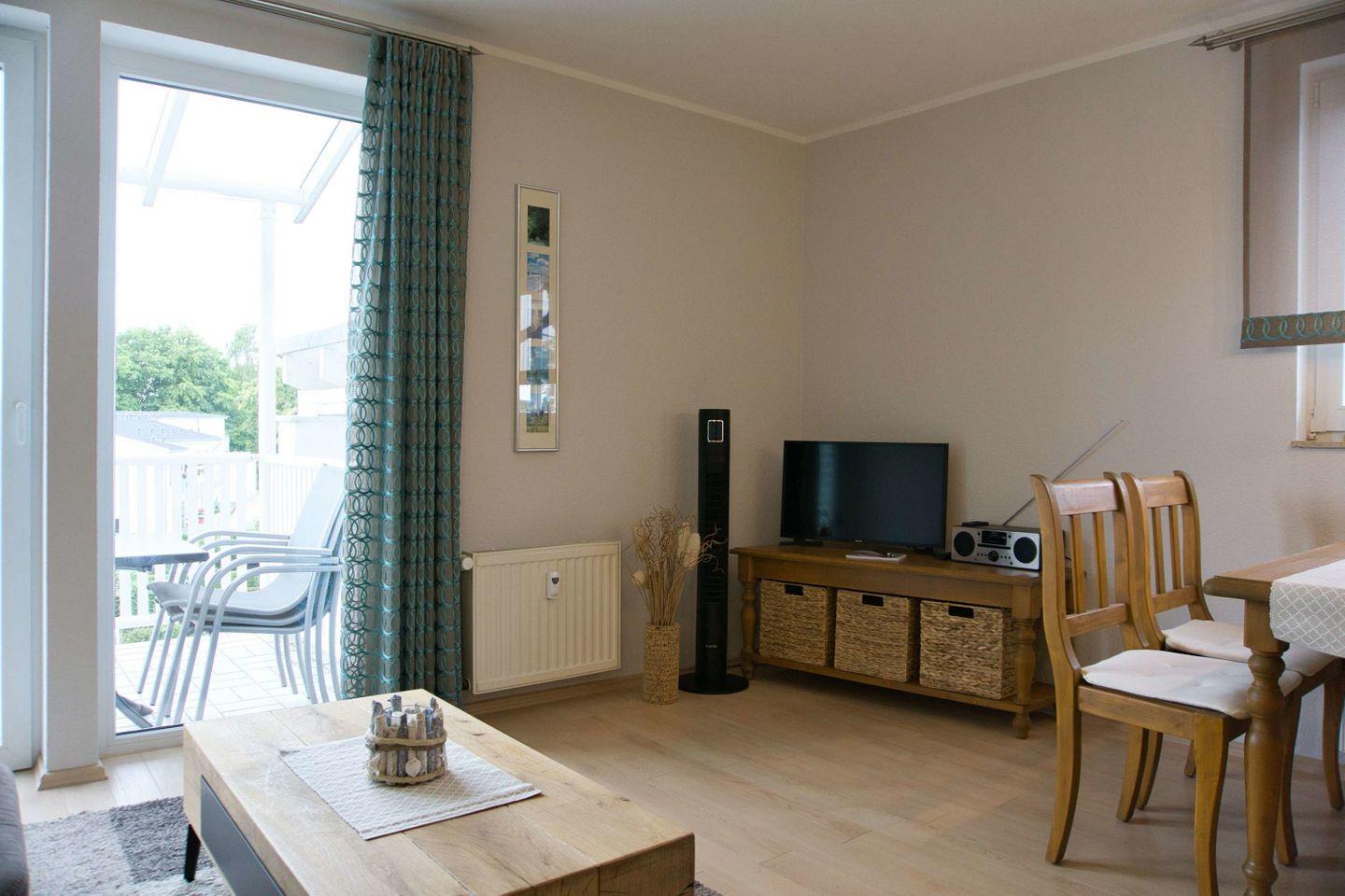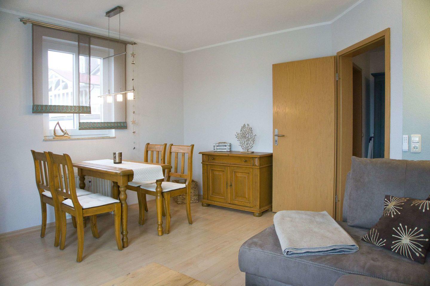 WOHNEN // Wohnraum mit Esstisch, Sitzgarnitur mit bequemer Schlafcouch, Flachbild-TV, DAB-Radio, Klimaanlage ++