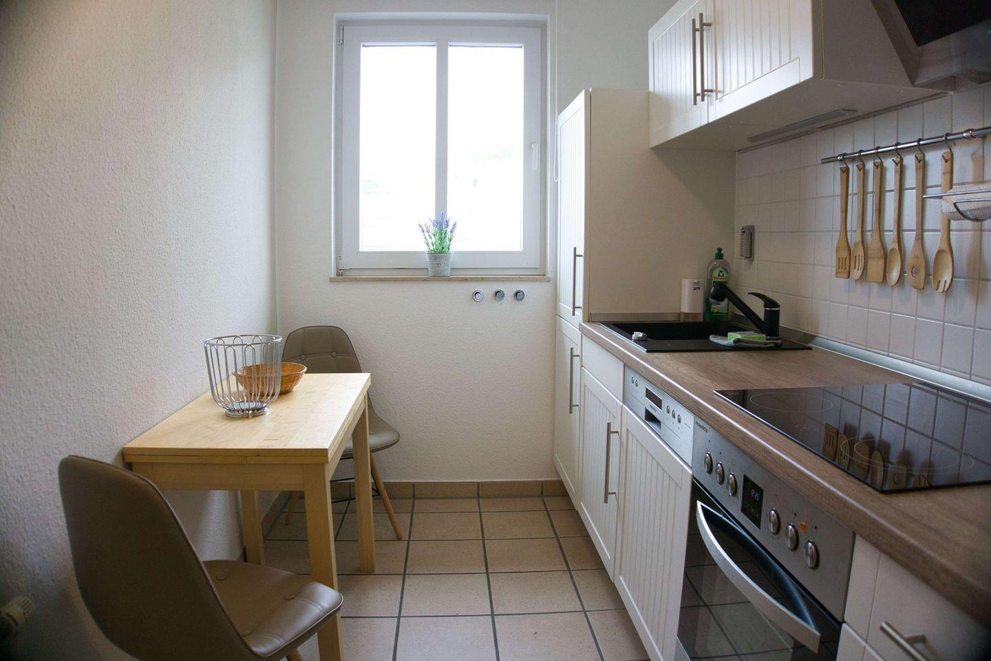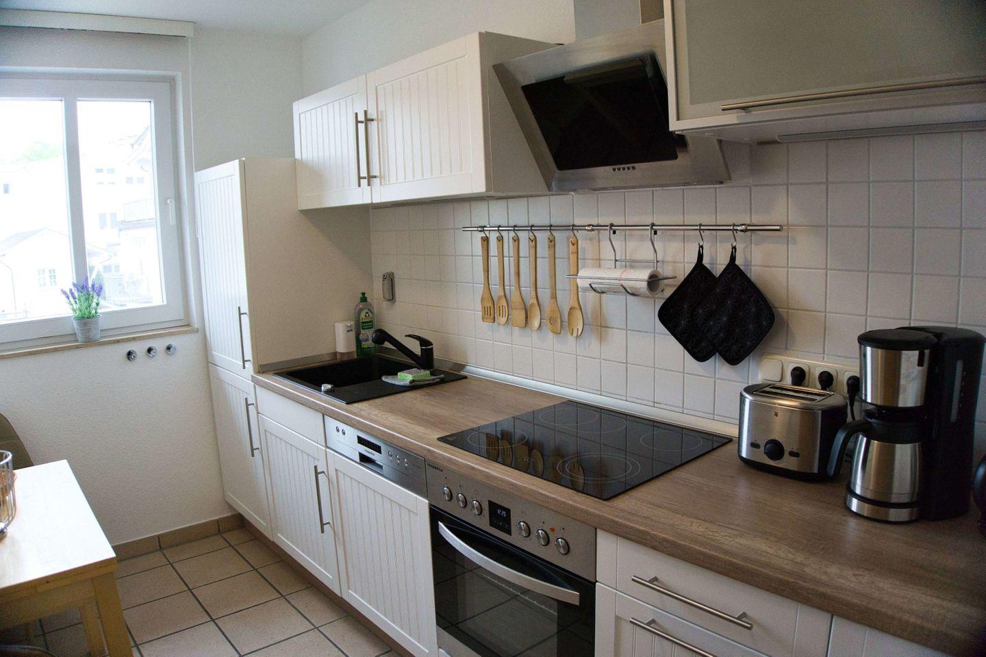 KÜCHE // geschlossene Küche, 4-Platten-Herd, Spülmaschine, Kühlschrank mit Gefrierfach, Backofen, Toaster, Wasserkocher, Kaffeemaschine, reichlich Besteck, Geschirr und Küchenutensilien ++