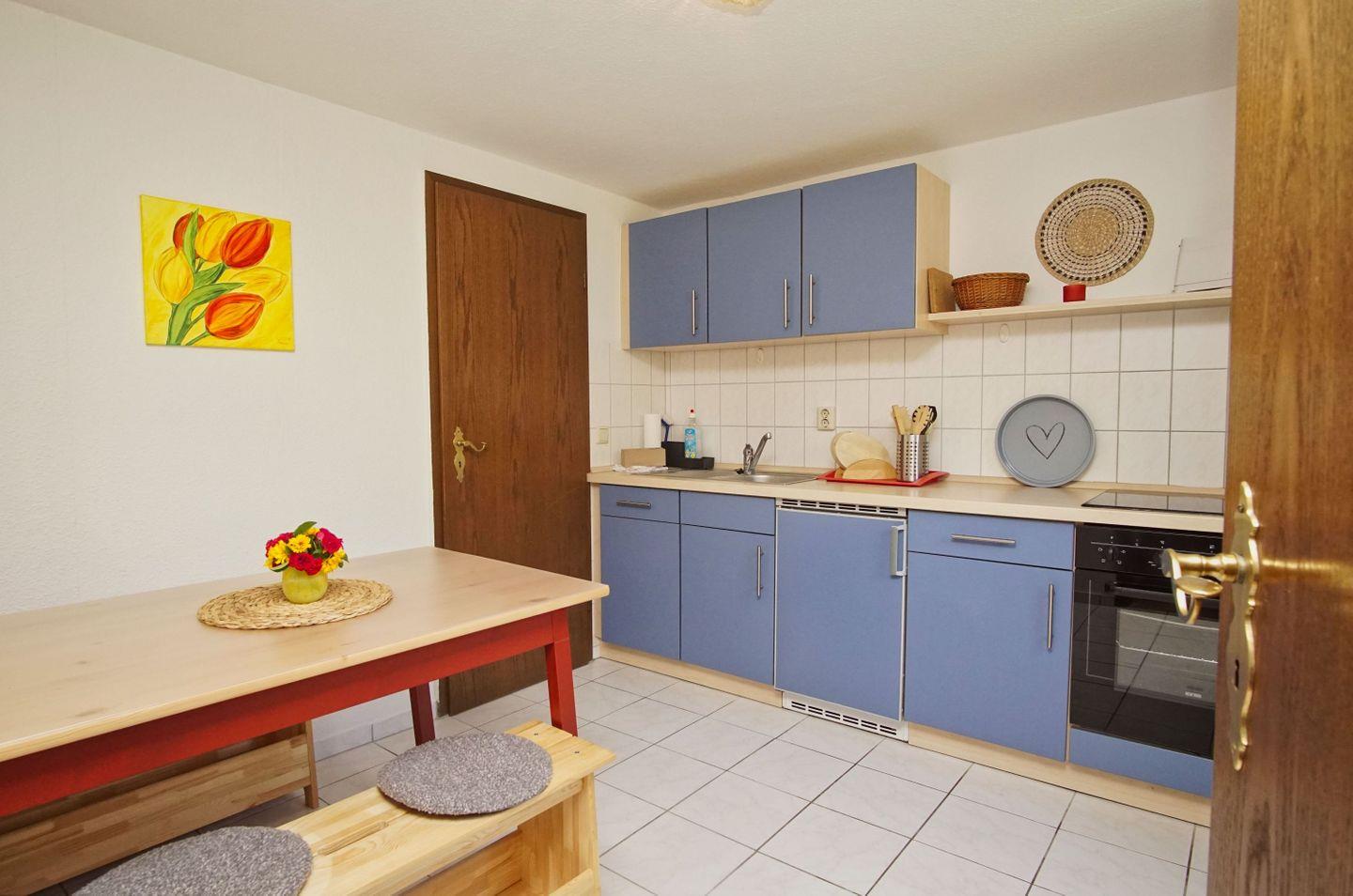 KÜCHE // separate Küche mit Esstisch, 4-Platten Ceranfeld, Geschirrspülmaschine, Kühlschrank, Backofen, Toaster, Wasserkocher, Kaffeemaschine, reichlich Besteck, Geschirr und Küchenutensilien ++
