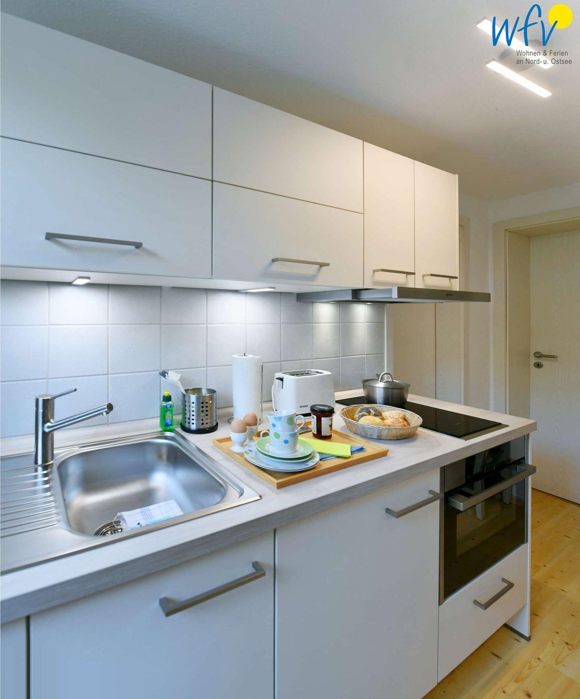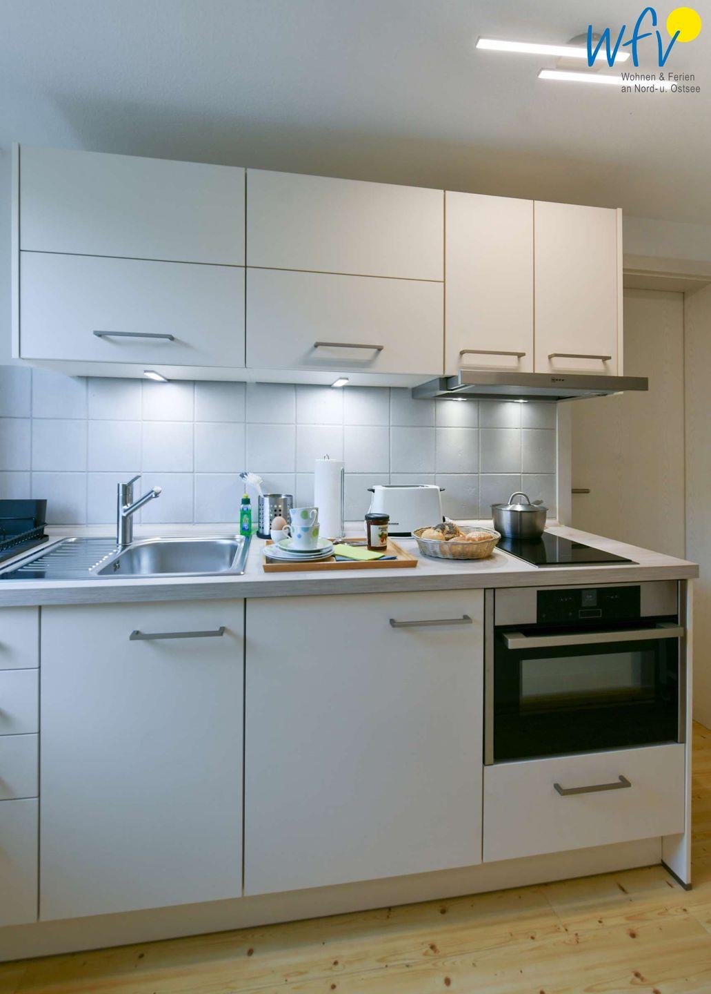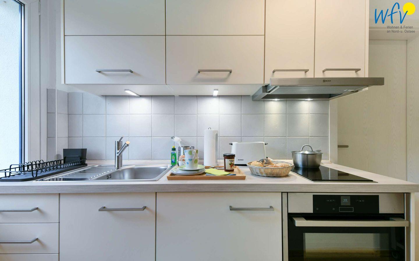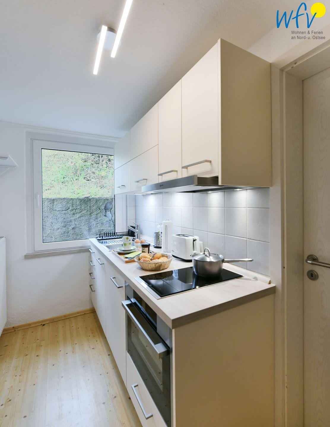 Bereits beim Ferienfrühstück genießen Sie vom Essplatz am Fenster aus eine herrliche Aussicht auf die Ostsee! Kaffee und warme Brötchen lassen sich bequem in der modernen Küchenzeile zubereiten. Ebenso wie Snacks für die bevorstehende Wanderung oder das ausgiebige Dinner am Abend. (Der Backofen kann auch als Mikrowelle genutzt werden.)