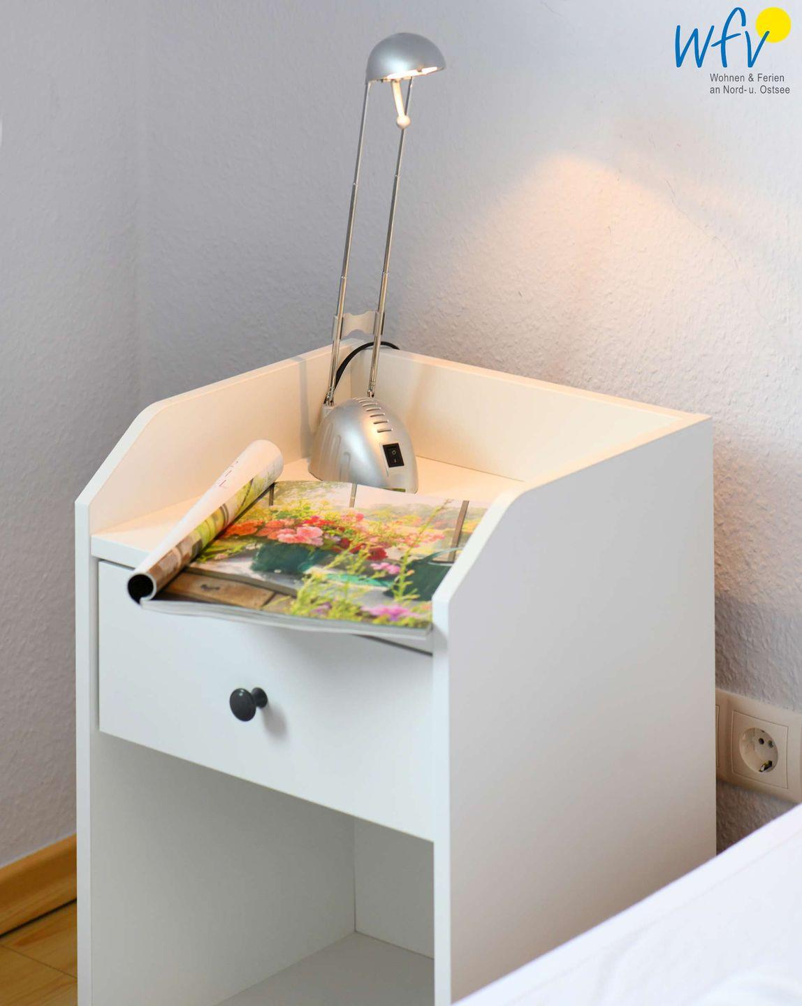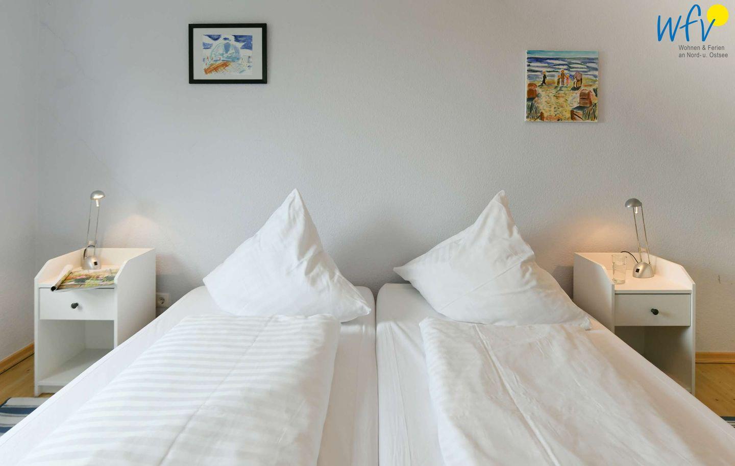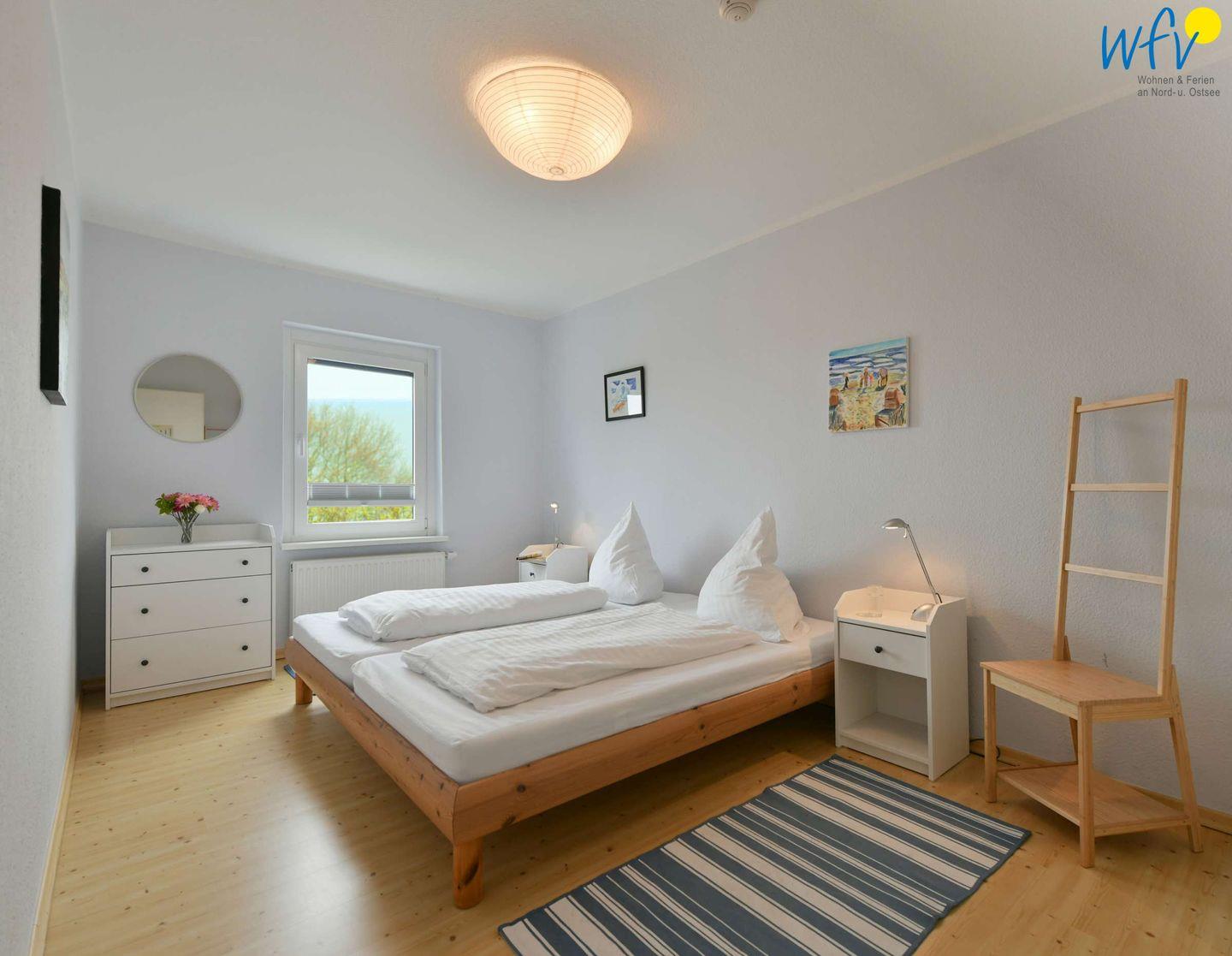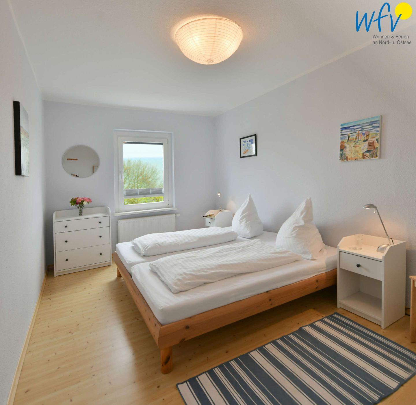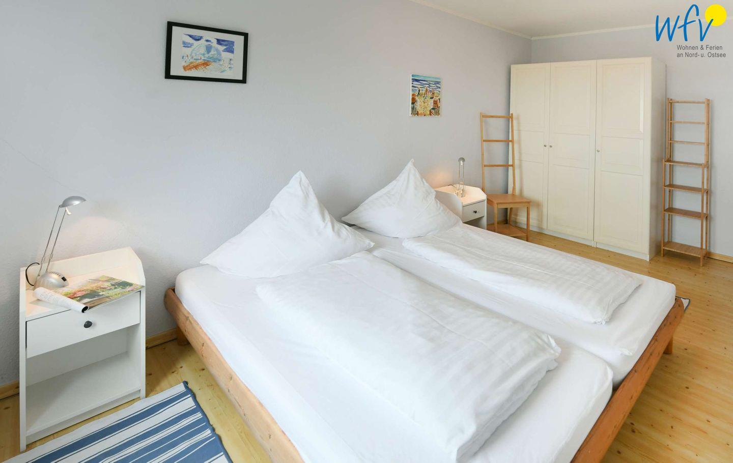 Wenn auf Rügen die Sonne untergeht, wartet in dem separaten Schlafzimmer ein komfortables Doppelbett (1 m x 2 m) auf Sie. Die Bettwäsche ist mit allergieneutralen Polyesterhohlfasern gefüllt.