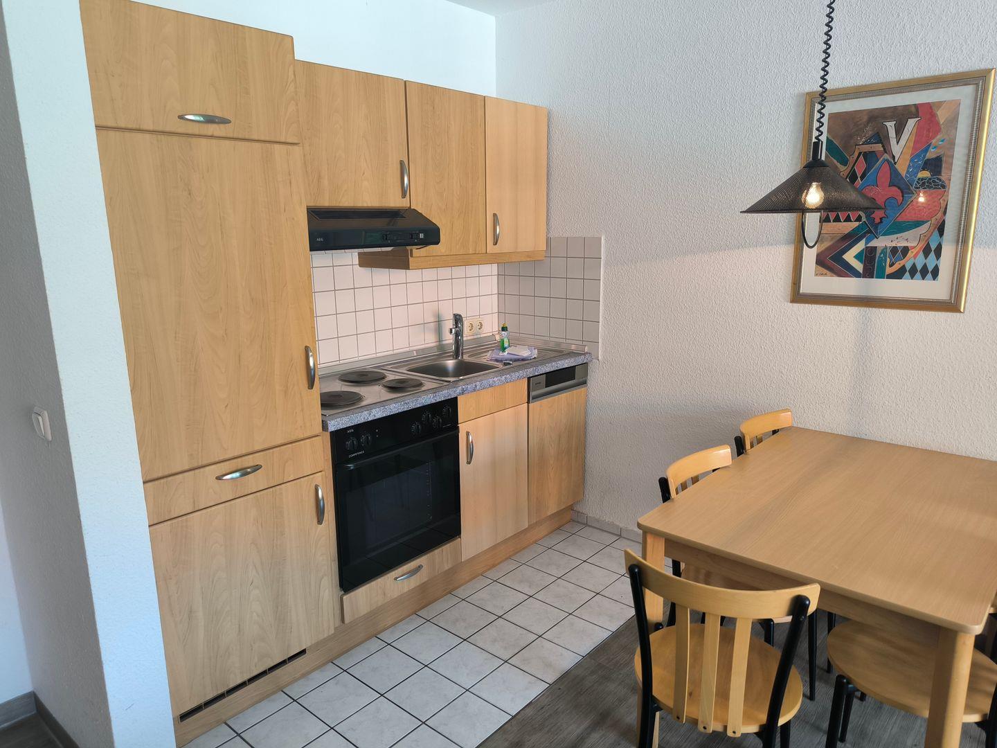 integrierte Einbauküche mit 4- Platten- Kochfeld, Backofen, Kühlschrank, Geschirrspüler, Toaster, Kaffeemaschine, Wasserkocher und Küchenutensilien