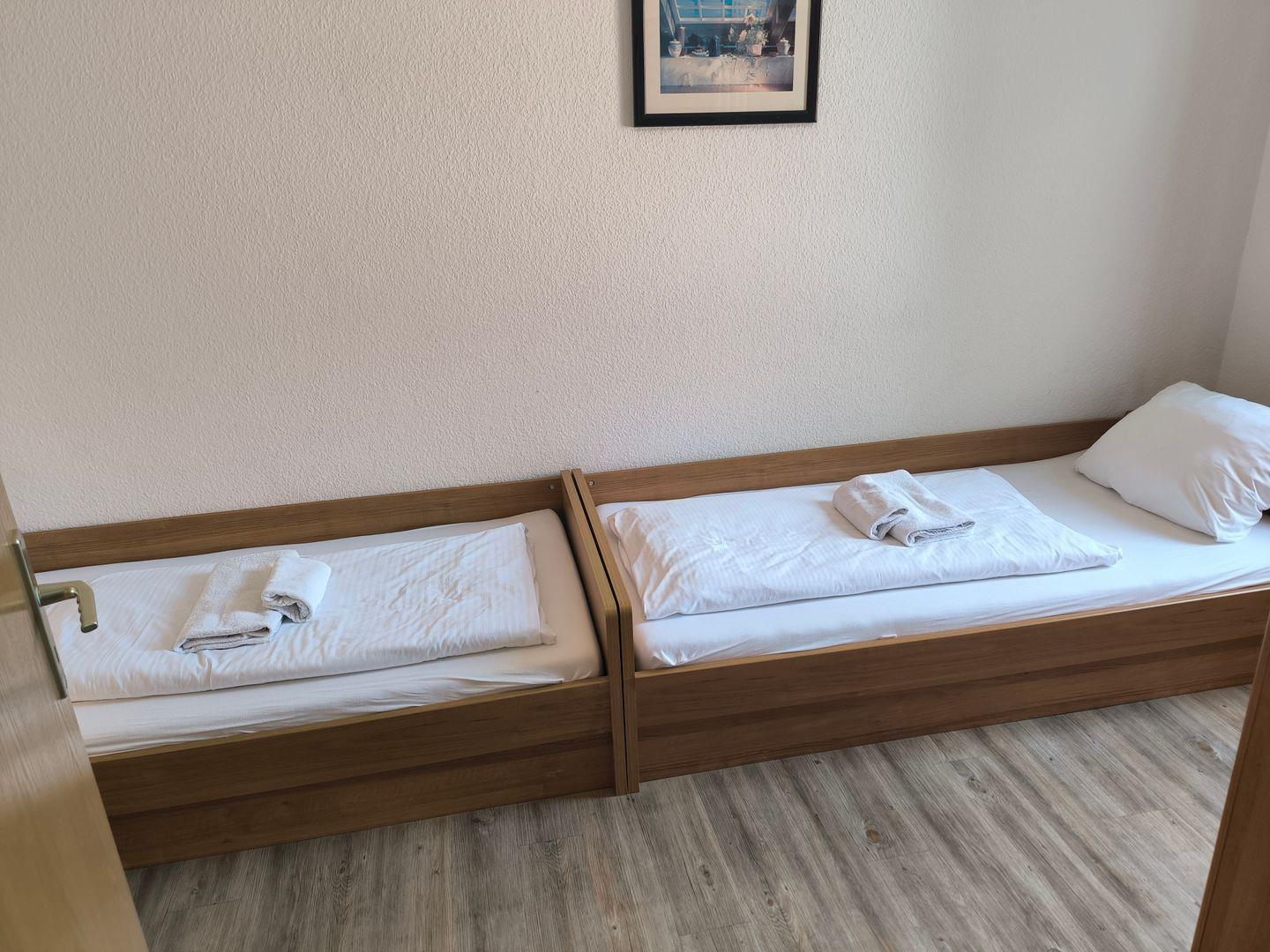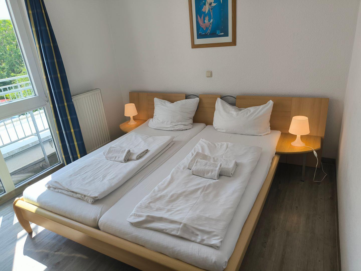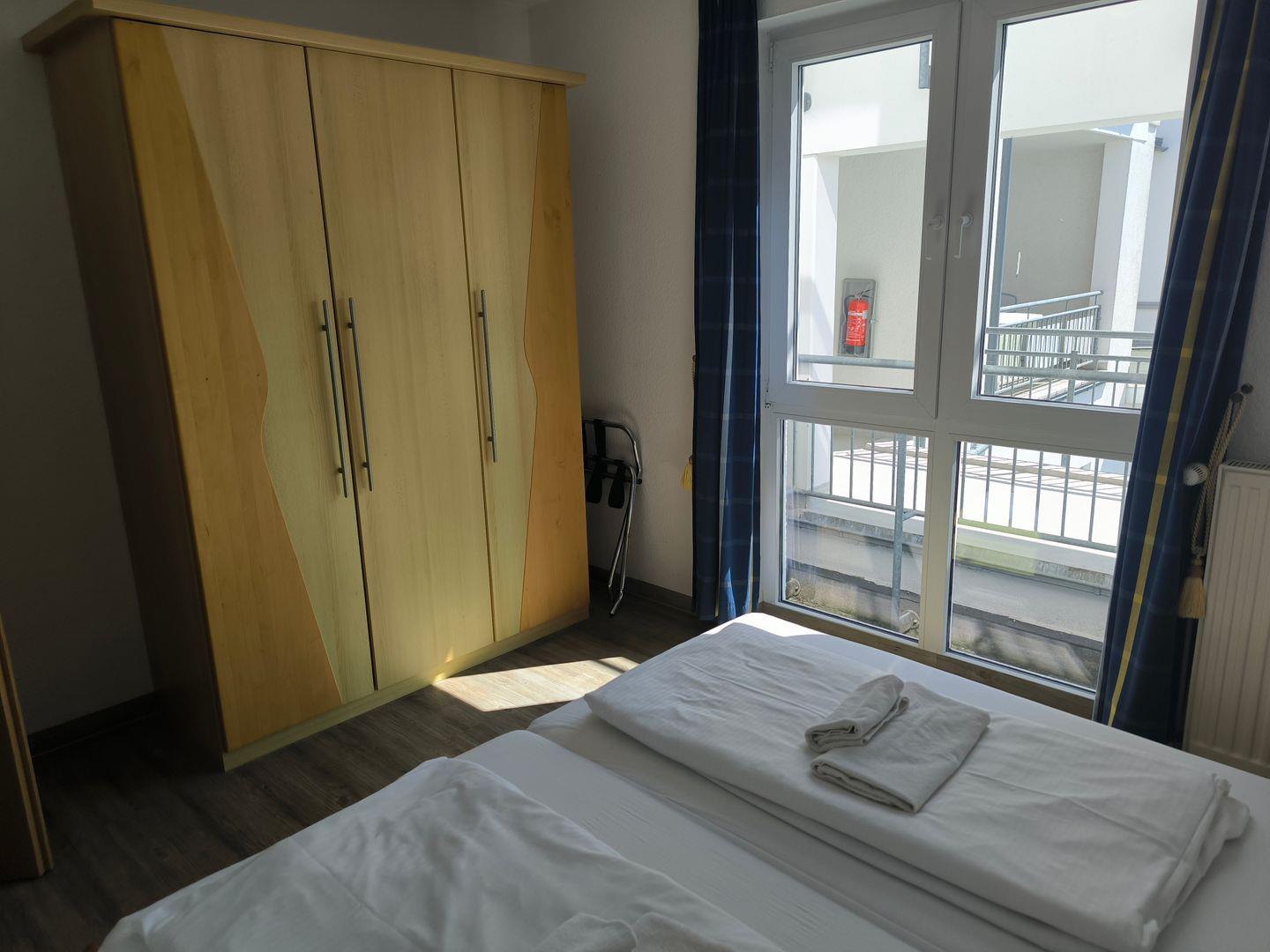 Schlafzimmer mit 2 Einzelbetten (90 x 200 cm ), großem Kleiderschrank, Tisch und Stühlen