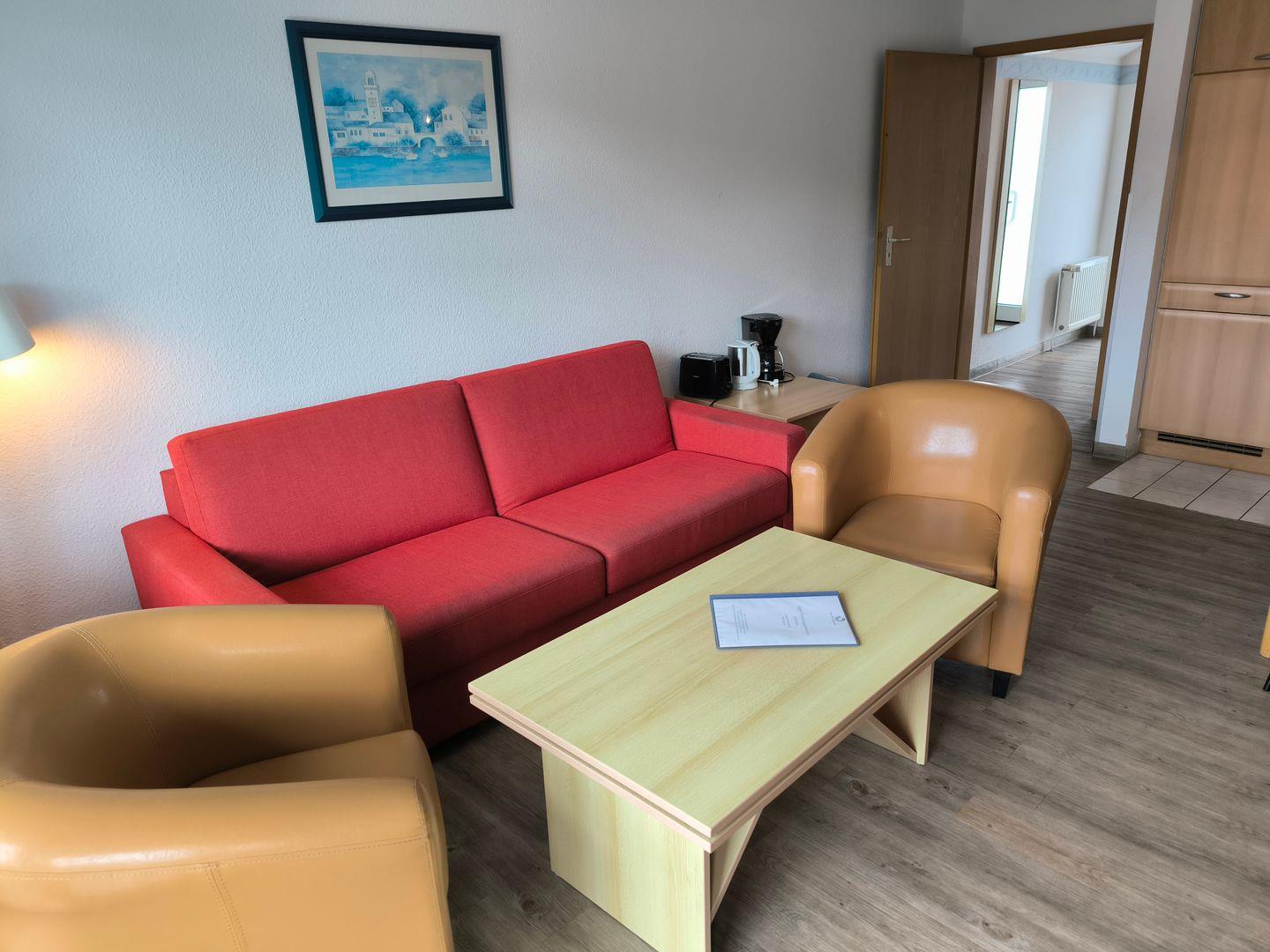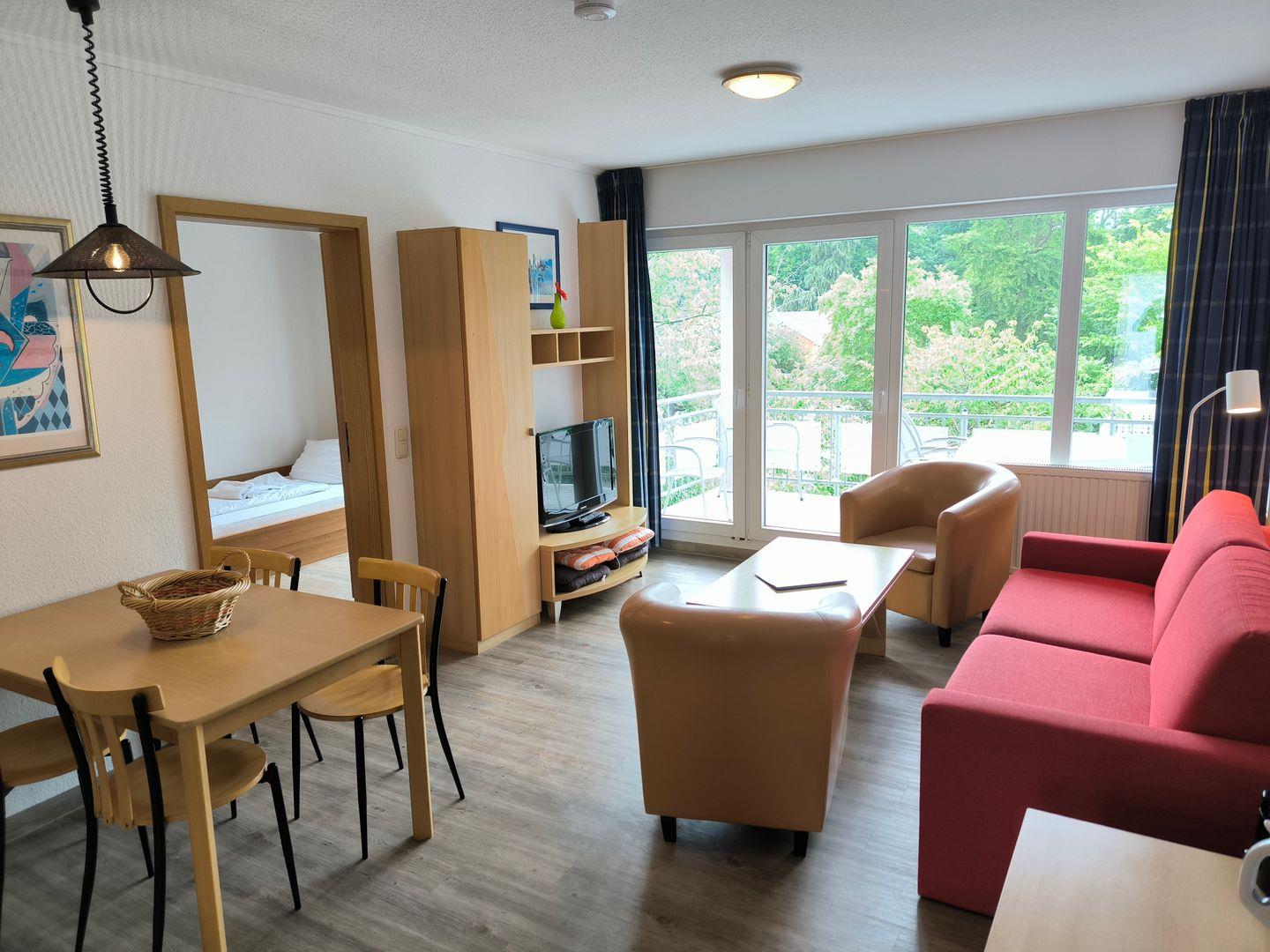 Wohnbereich mit moderner Wohnlandschaft, Couchtisch, TV mit Radiofunktion und Esstisch mit 4 Stühlen