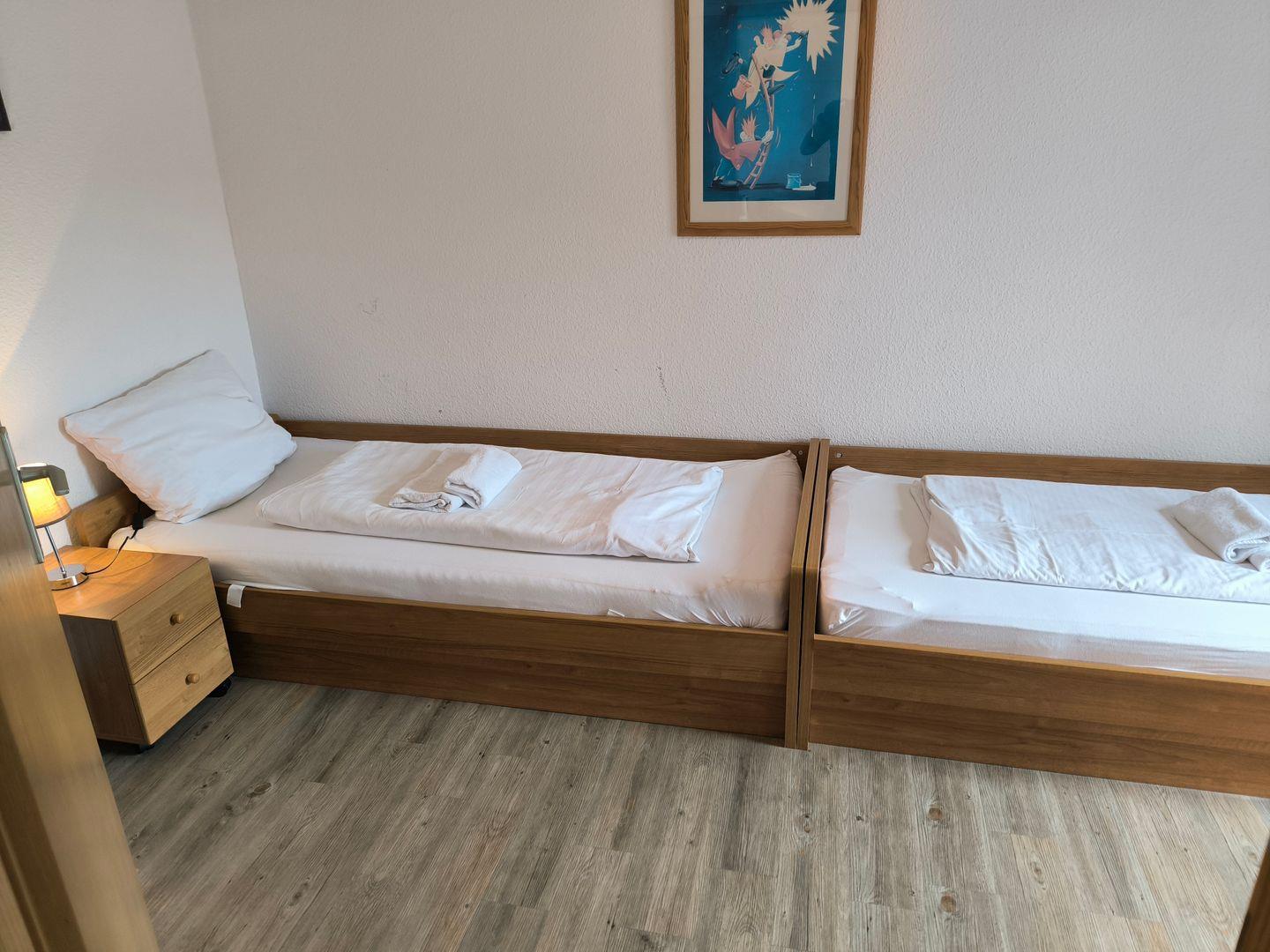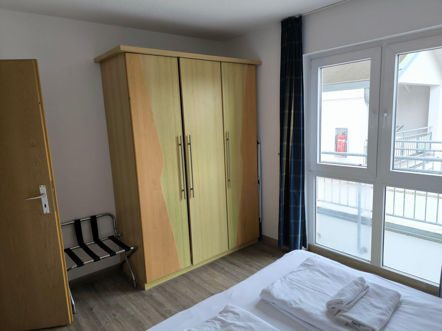 Schlafzimmer mit 2 Einzelbetten (90 x 200 cm ), großem Kleiderschrank, Tisch und Stühlen