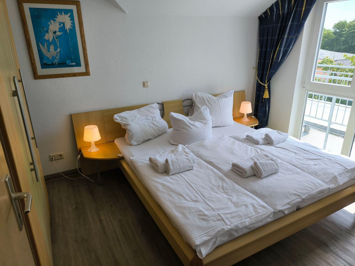 Schlafzimmer mit einem Doppelbett (180 x 200 cm) und großem Kleiderschrank