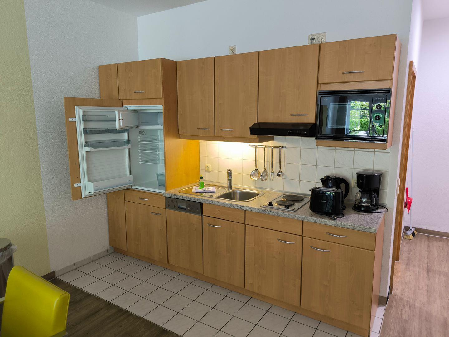 Im Wohnraum integrierte Einbauküche, ausgestattet mit: 2-Platten-Kochfeld, Mikrowelle, Dunstabzugshaube, Kühlschrank mit Gefrierfach, Geschirrspüler, Toaster, Kaffeemaschine, Wasserkocher und Küchenutensilien