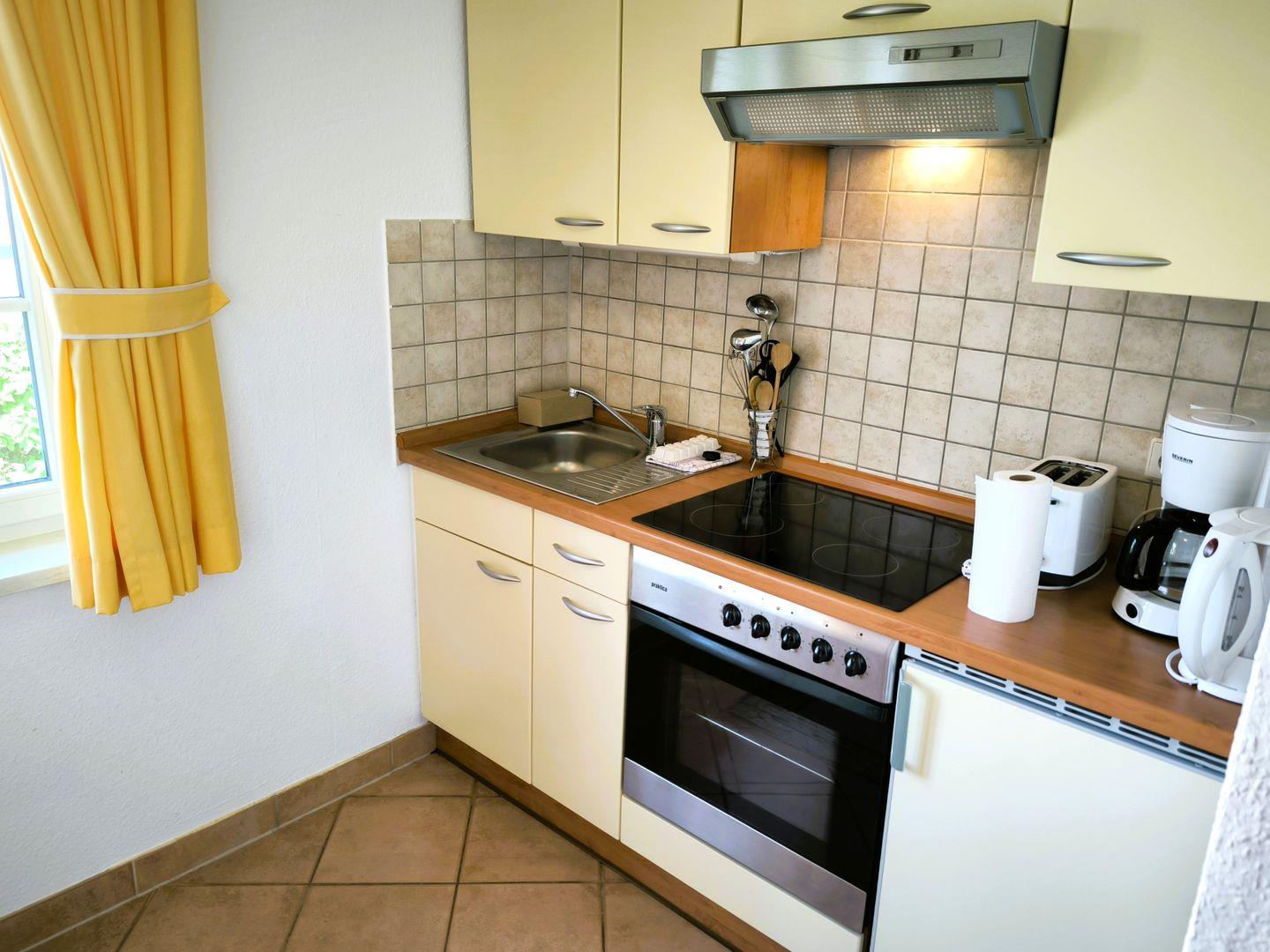 separate Küche mit 4- Platten- Kochfeld, Backofen, Kühlschrank, Toaster, Kaffeemaschine, Wasserkocher und Küchenutensilien