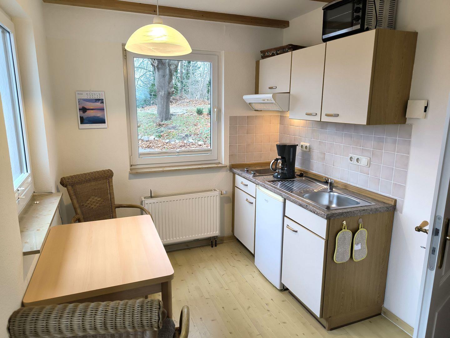 integrierte Küchenzeile 2- Platten- Kochfeld, Backofen, Kühl- Gefrierkombination, Toaster, Kaffeemaschine, Wasserkocher und Küchenutensilien