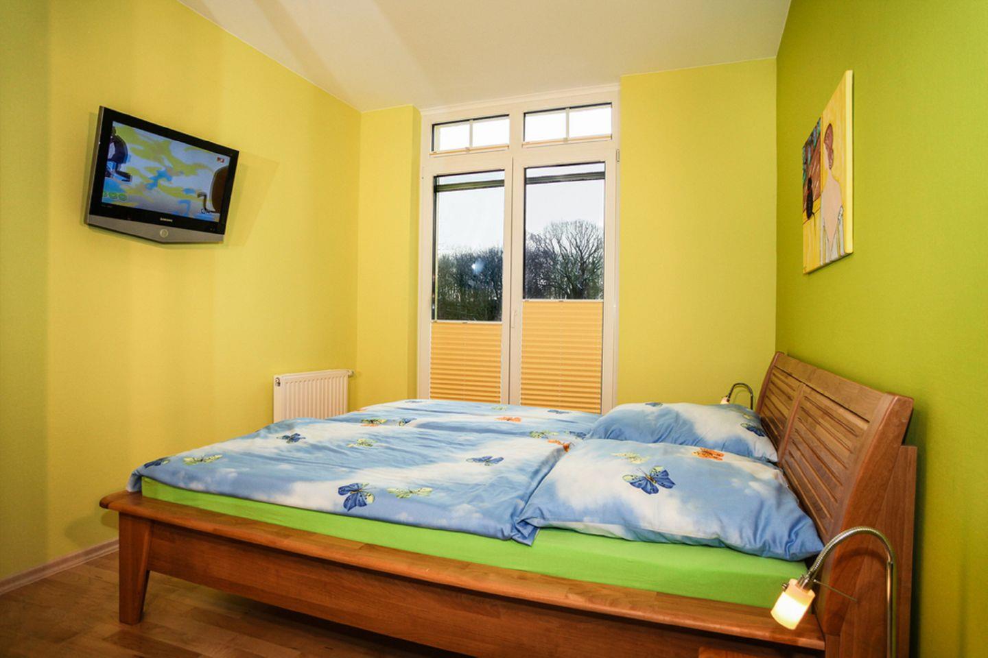 SCHLAFEN // ein Schlafzimmer mit Doppelbett, Kleiderschrank, Flachbild-TV und bodentiefe Fenster, ein Schlafzimmer mit Kleiderschrank und Etagenbett (untere Liegefläche 1,40 x 2,00 m, obere Liegefläche 0,90 x 2,00 m) ++