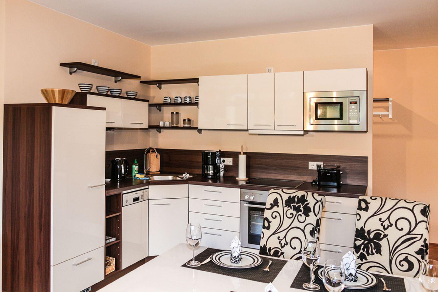 KÜCHE // offene Küche, Ceranfeld, Spülmaschine, Kühlschrank mit Gefrierfach, Mikrowelle, Kaffeemaschine, Toaster, Wasserkocher, reichlich Besteck sowie Geschirr und diverse Küchenutensilien ++
