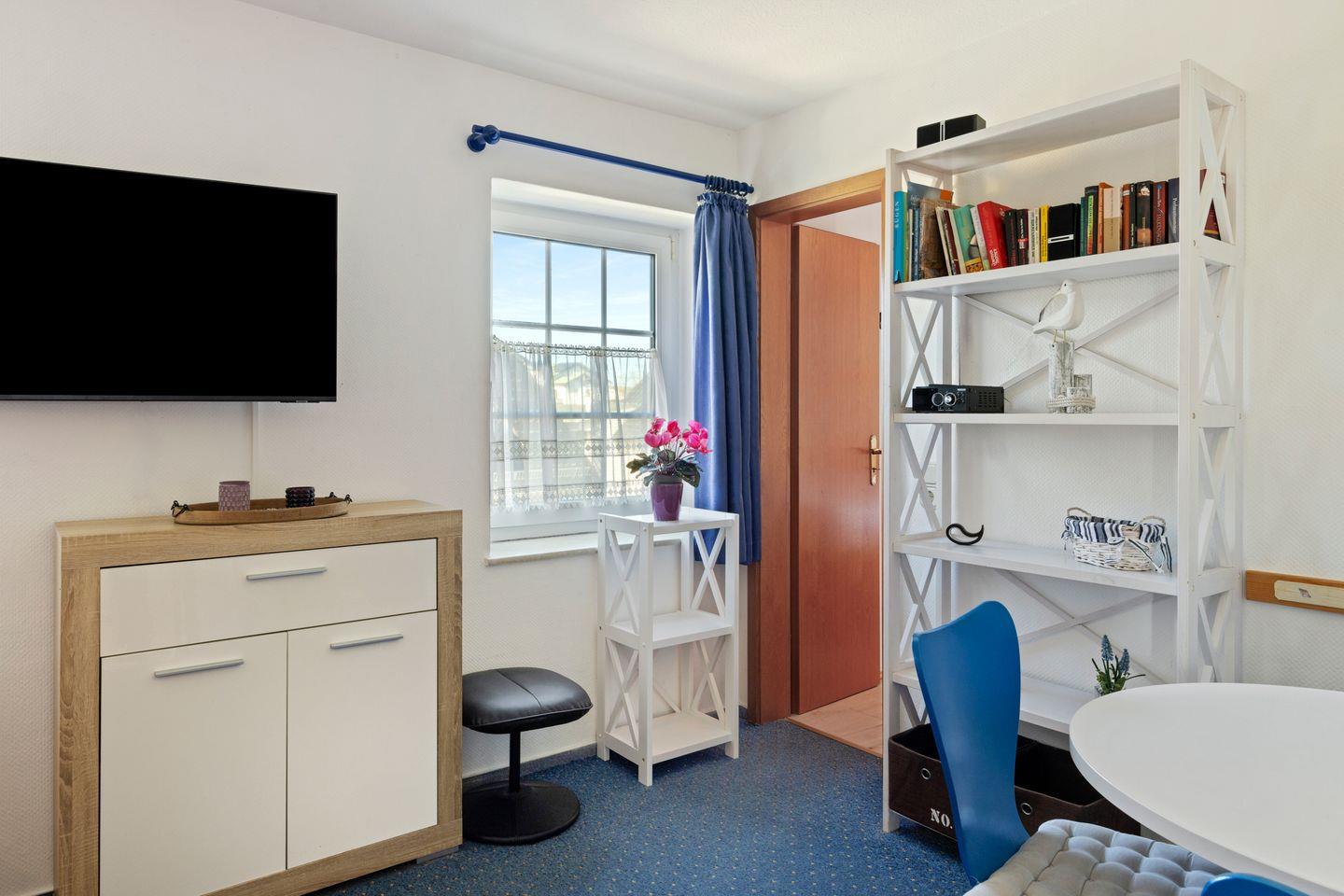 Im Innenbereich erwartet Sie ein funktional und komfortabel ausgestatteter Wohnbereich mit Esstisch, Garderobe, TV mit digitalem Anschluss und WLAN. Die offene Küche ist in den Wohnraum integriert und bietet mit 2-Platten-Herd, Kühlschrank, Kaffeemaschine, Toaster, Wasserkocher, Küchenutensilien sowie Geschirr und Besteck eine praktische Ausstattung für die unkomplizierte Selbstversorgung.