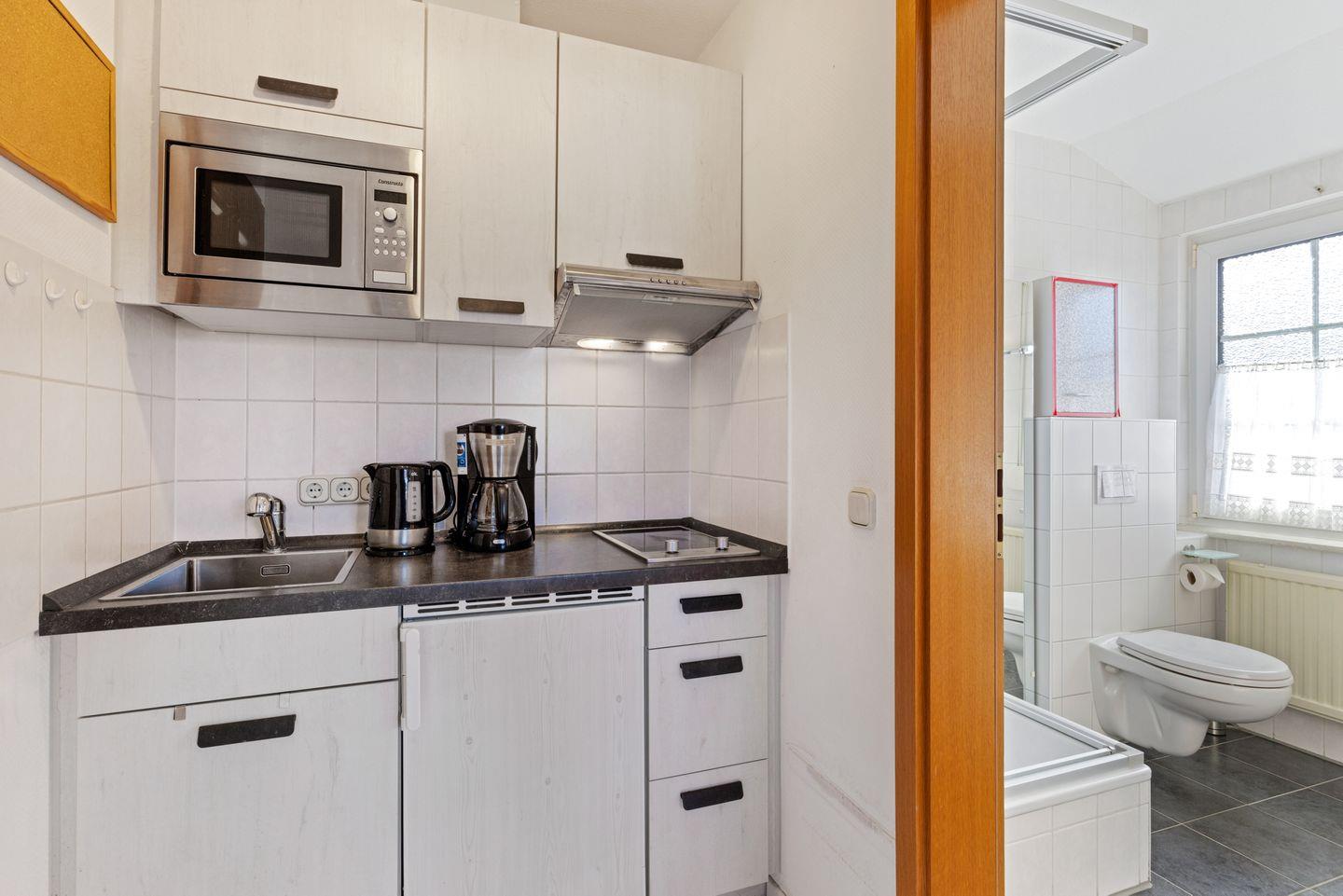 Das Badezimmer verfügt über eine bodengleiche Dusche, ein WC, warmes Wasser, Waschbecken, Spiegel und ein Fenster. Für entspannte Stunden im Freien stehen Ihnen Gartenmöbel zur Verfügung, hinzu kommt ein Gartenblick, der den Aufenthalt angenehm ergänzt.