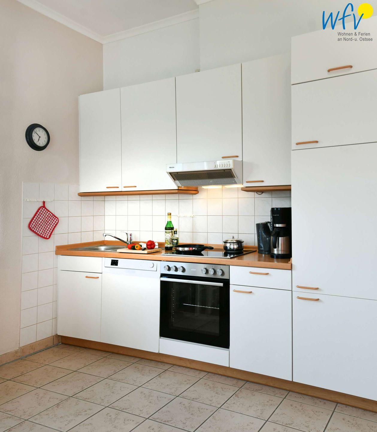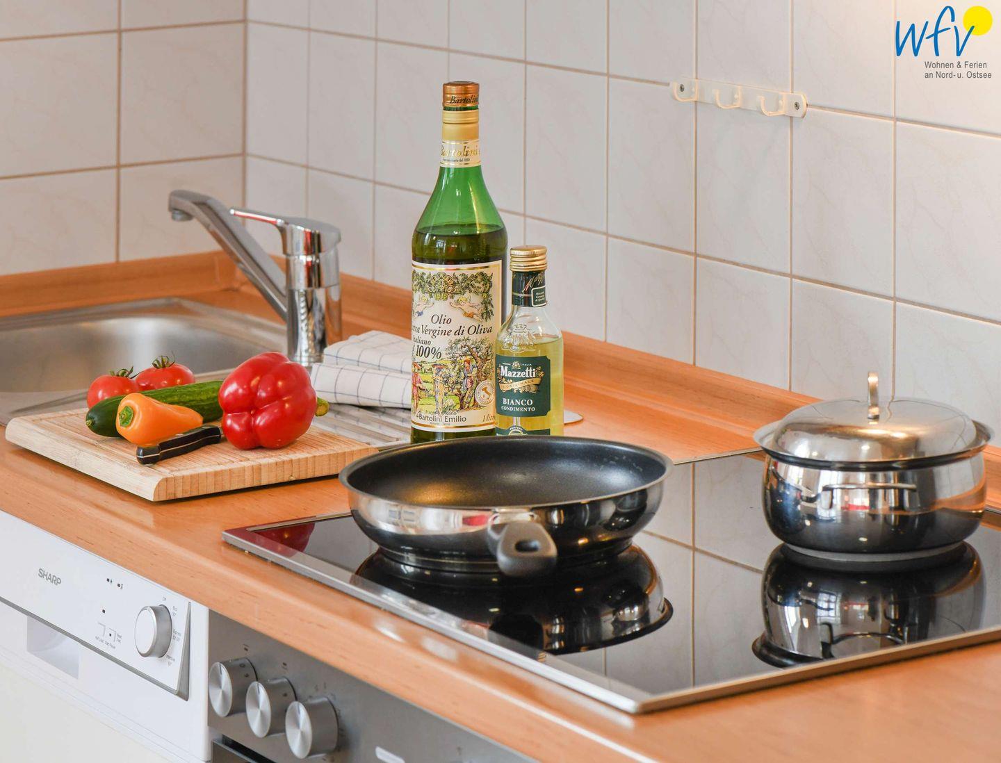 Für eine bequeme Selbstverpflegung ist die Küchenzeile der Ferienwohnung u.a. mit einem 4-Plattenherd, Backofen und Kühlschrank mit Gefrierfach, Mikrowelle und Geschirrspüler sowie Kaffeemaschine, Wasserkocher und Toaster ausgestattet.