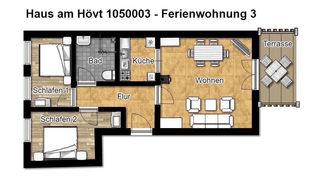 Auf 66 m² Wohnfläche erwarten Sie drei Zimmer – aufgeteilt in einen großzügigen Wohnraum mit Sitzecke, Esstisch und offener Küche und zwei separate Schlafzimmer mit Doppelbett.
