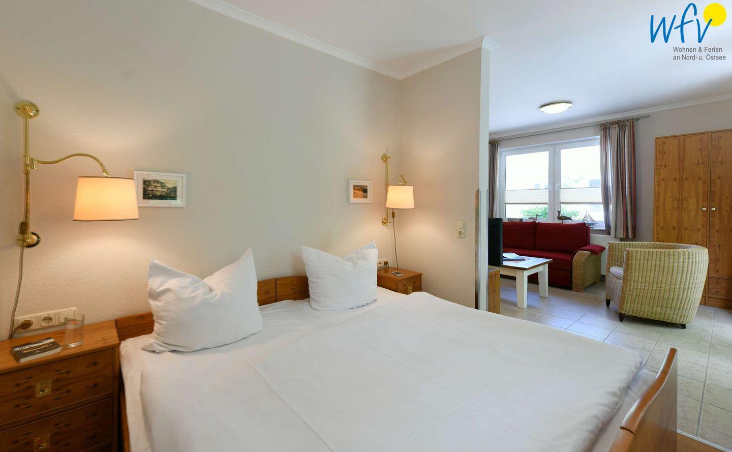 Schlafmöglichkeiten bestehen durch ein Doppelbett (1,80 m x 2 m). Eine Aufbettung ist möglich (auf Anfrage).