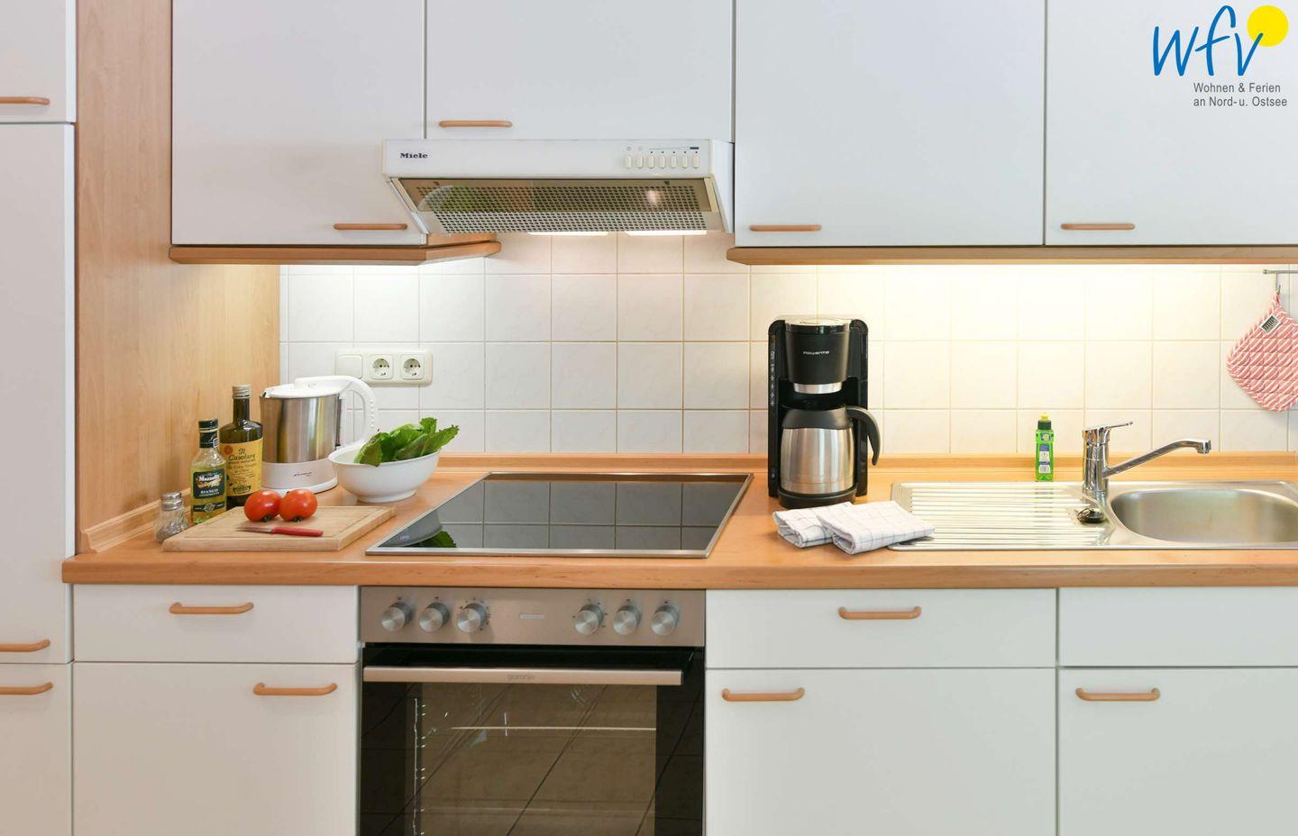 Damit Sie sich in Ihrem Urlaub auf Rügen bequem selbst verpflegen können, verfügt die Ferienwohnung über eine gut ausgestattete Küchenzeile u.a. mit Herd, Backofen, Kühlschrank mit Gefrierfach sowie Kaffeemaschine, Wasserkocher und Toaster.
