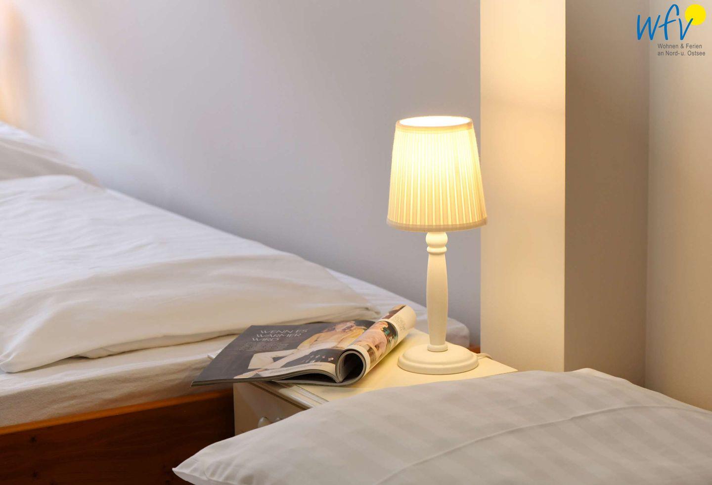 Die zwei separaten Schlafzimmer der Rügener Ferienwohnung sind mit einem Doppelbett (1,80 m x 2 m) bzw. zwei Einzelbetten (90 cm x 2 m) ausgestattet. Eine Aufbettung ist möglich (auf Anfrage).