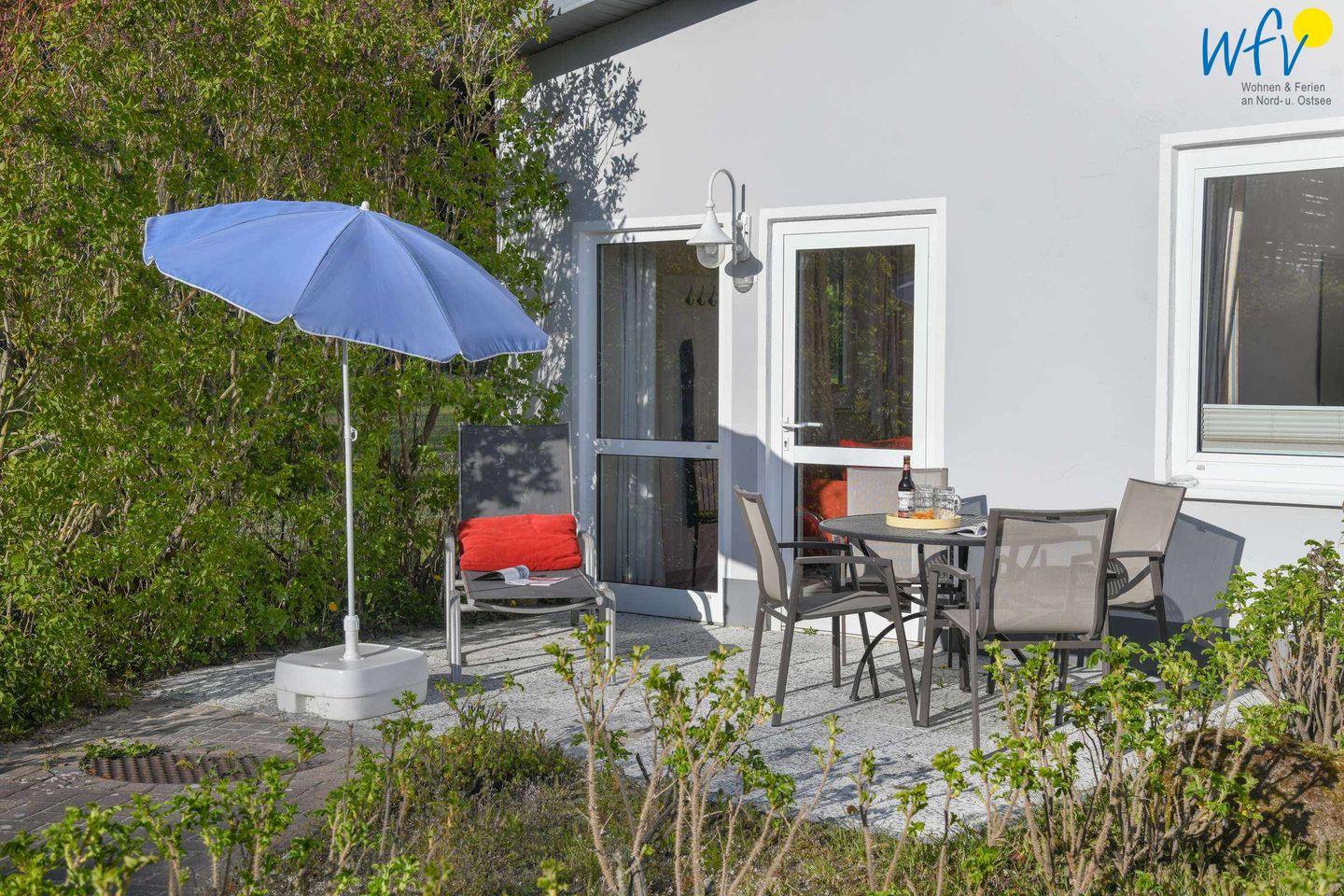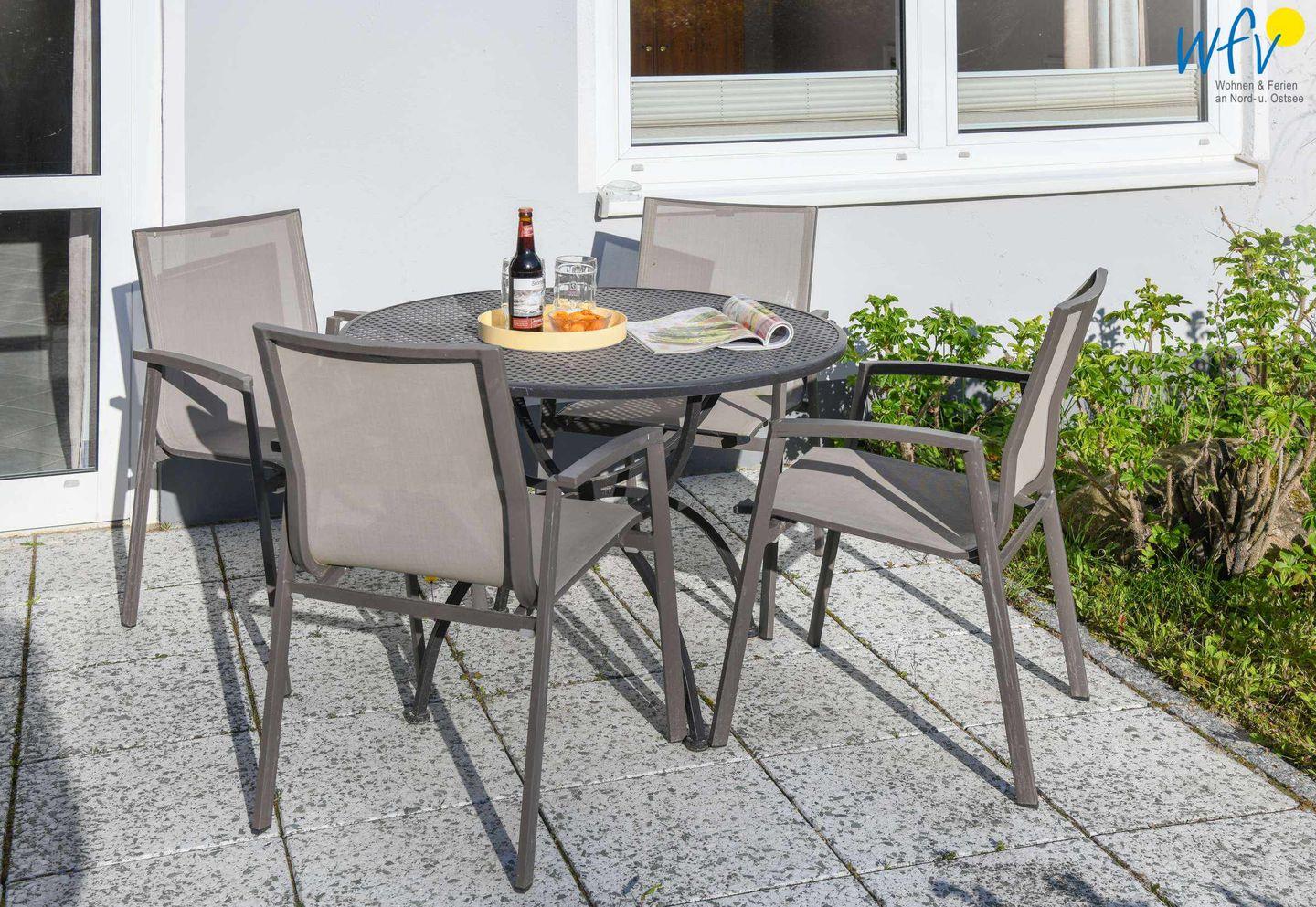 Wunderbar relaxen können Sie vor allem auf der möblierten Westterrasse! Zu der Ferienanlage „Haus am Hövt“ gehört zudem ein großer Gemeinschaftsgarten mit Grillplatz, Tischtennisplatte und Spielmöglichkeiten, den Sie gerne nutzen dürfen.