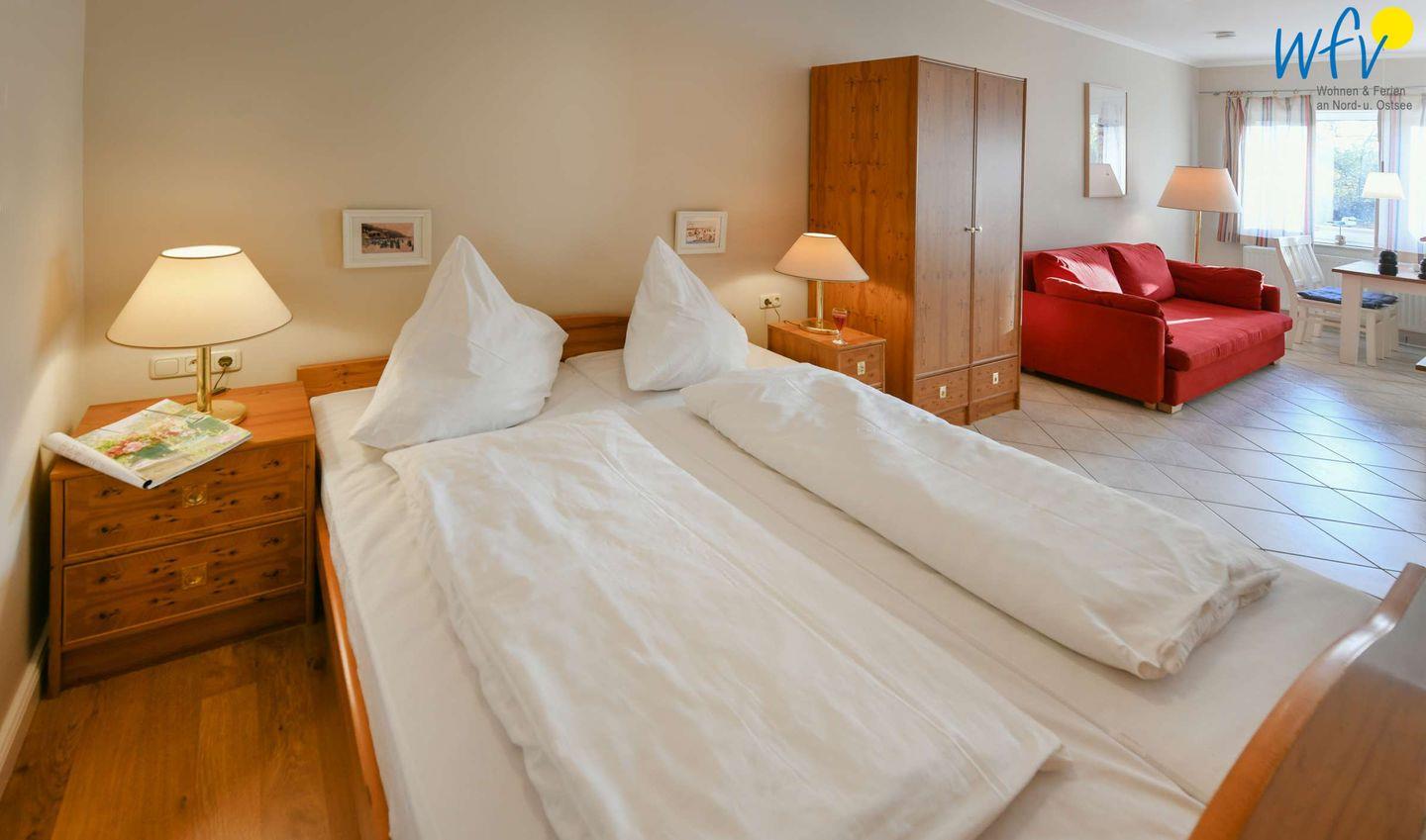 Schlafmöglichkeiten bestehen im Schlafbereich des Wohnraums durch ein Doppelbett (1,80 m x 2 m). Eine Aufbettung ist möglich (auf Anfrage).