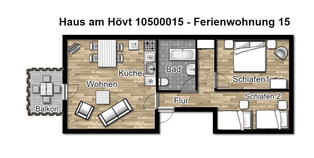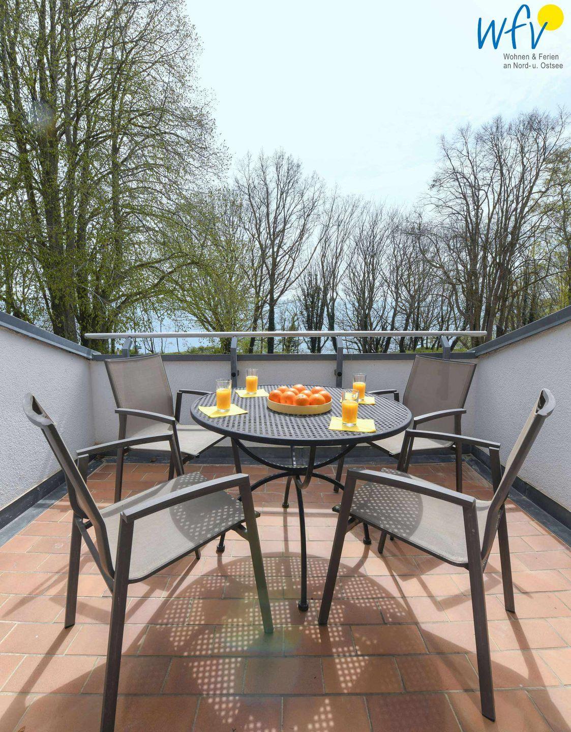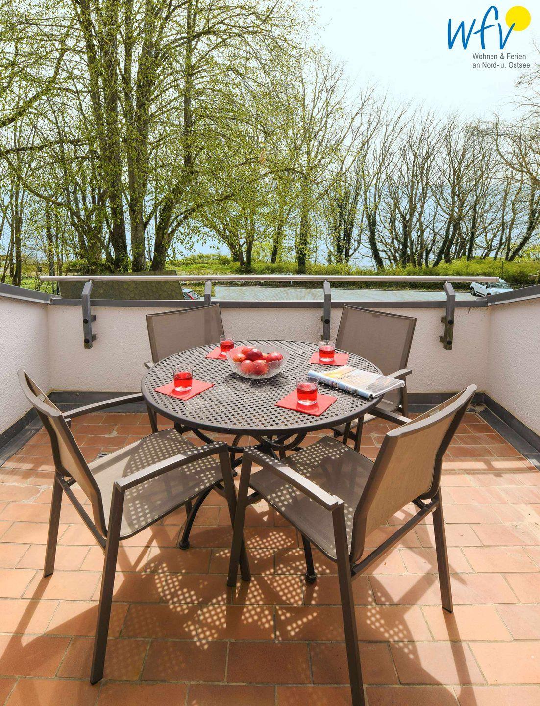 Genießen Sie wohltuende Sonnenstunden auf den beiden möblierten Süd-Balkonen! Zu der Ferienanlage „Haus am Hövt“ gehört außerdem ein großer Gemeinschaftsgarten mit Grillplatz, Tischtennisplatte und Spielmöglichkeiten, den Sie gerne nutzen dürfen.