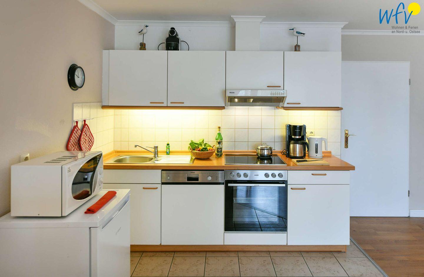 Damit Sie sich in Ihrem Urlaub auf Rügen bequem selbst verpflegen können, sind beide Küchenzeilen voll ausgestattet - u.a. mit Herd, Backofen, Kühlschrank mit Gefrierfach, Mikrowelle und Geschirrspüler sowie Kaffeemaschine, Kaffee-Vollautomat (Kapseln), Wasserkocher und Toaster.