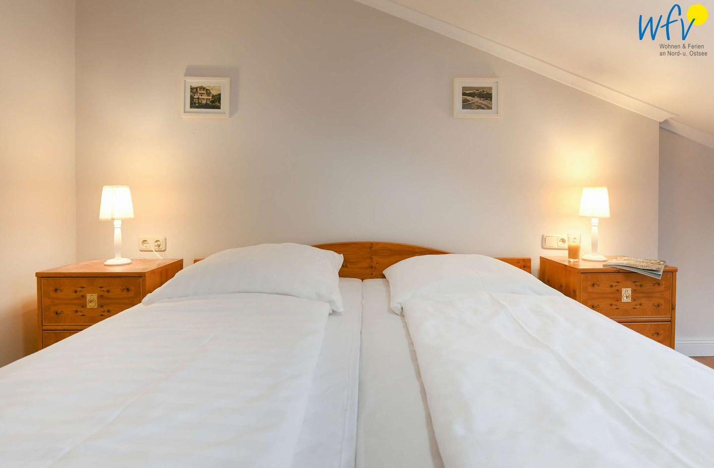 Zwei der vier separaten Schlafzimmer der Rügener Ferienwohnung sind mit einem Doppelbett (1,80 m x 2 m) ausgestattet, eines mit einem Stockbett und eines mit zwei Einzelbetten (0,90 m x 2m). Eine Aufbettung ist möglich (auf Anfrage).