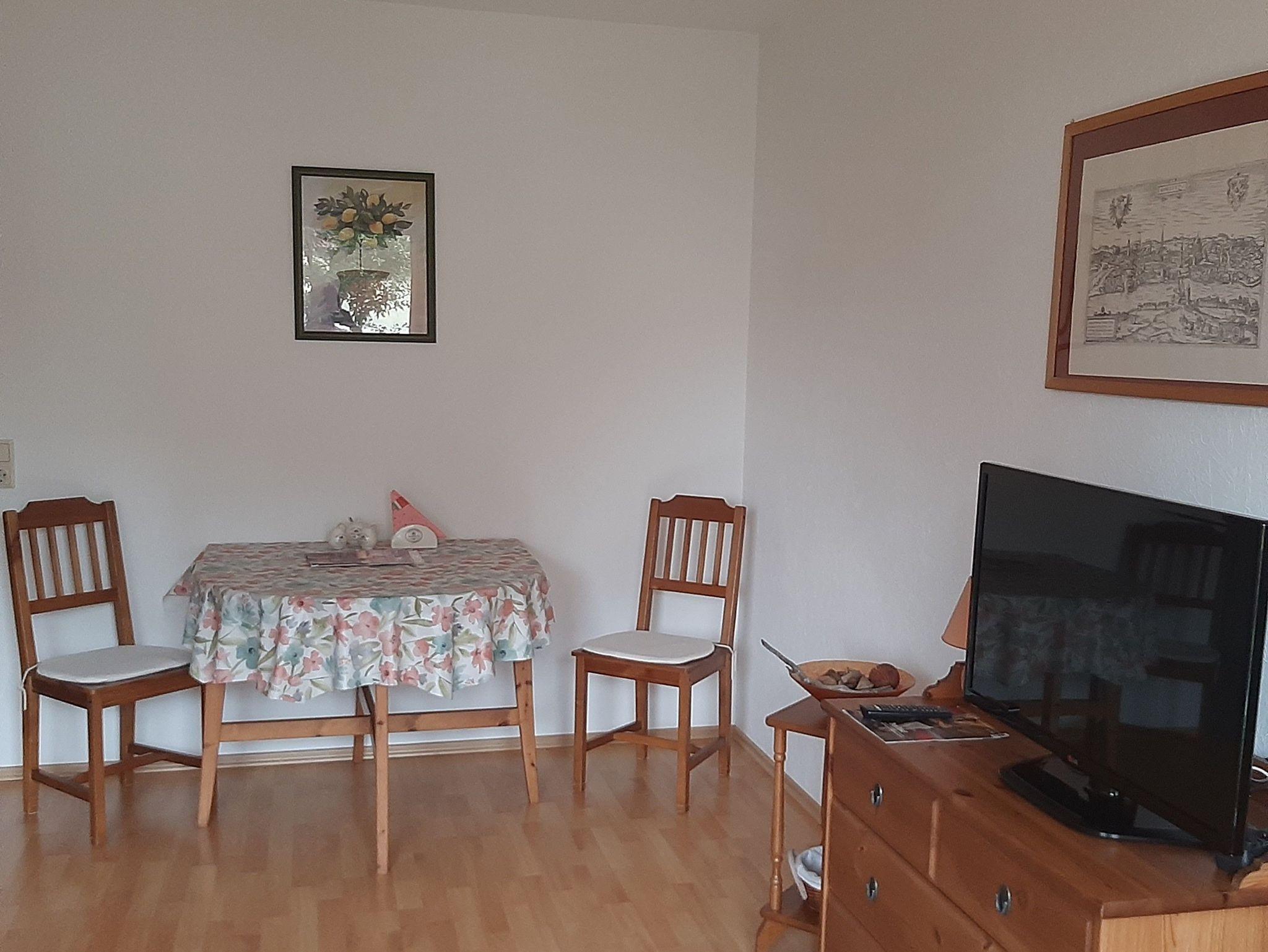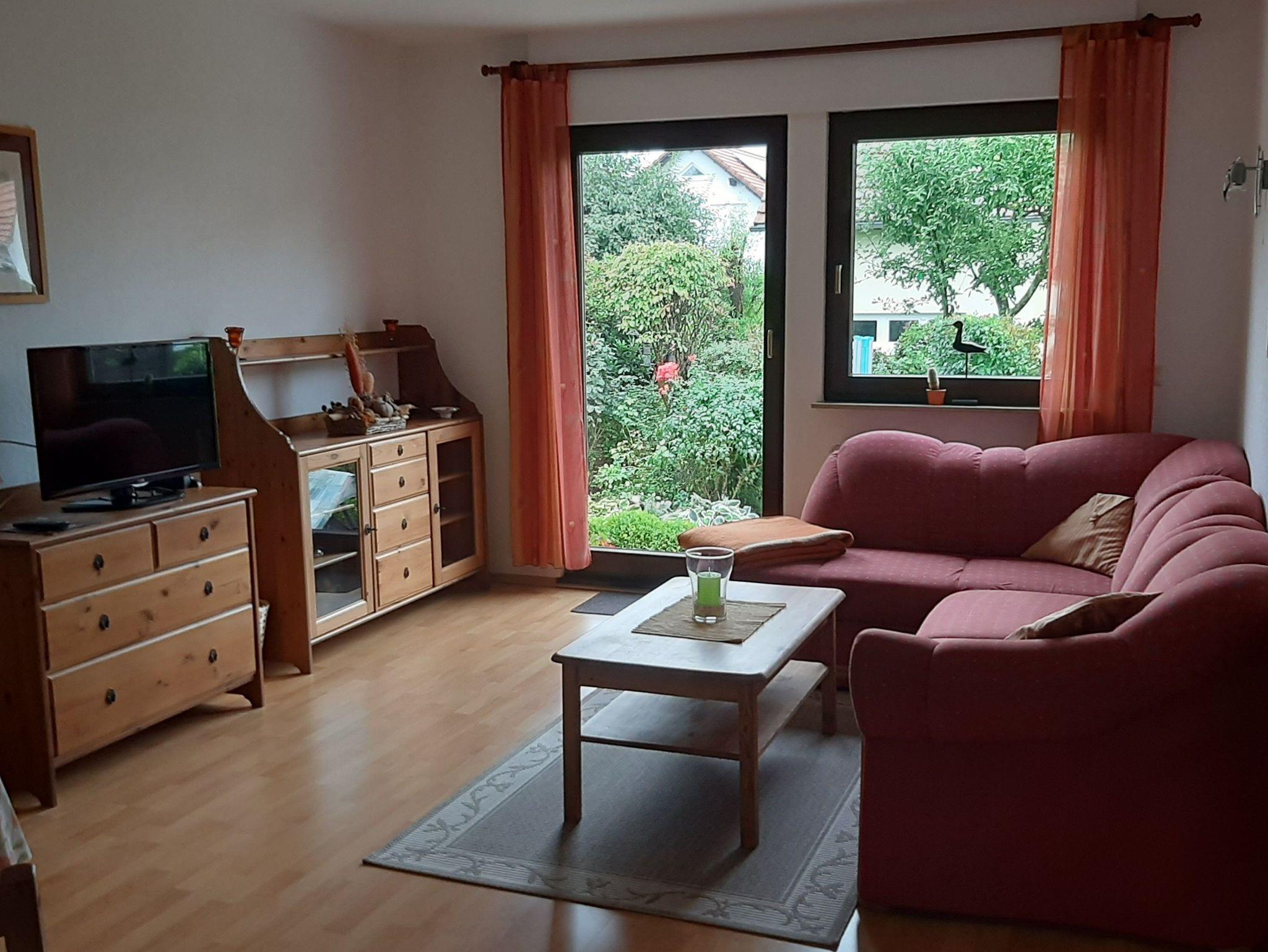 Die Ferienwohnung befindet sich in einem freistehenden Haus mit separatem Eingang für die Wohnung. Vom Wohnzimmer und der Terasse haben Sie einen schönen Blick in den Garten des Hauses. Auf der Terrasse befindet sich eine Sitzecke, die durch die Gäste benutzt werden kann.