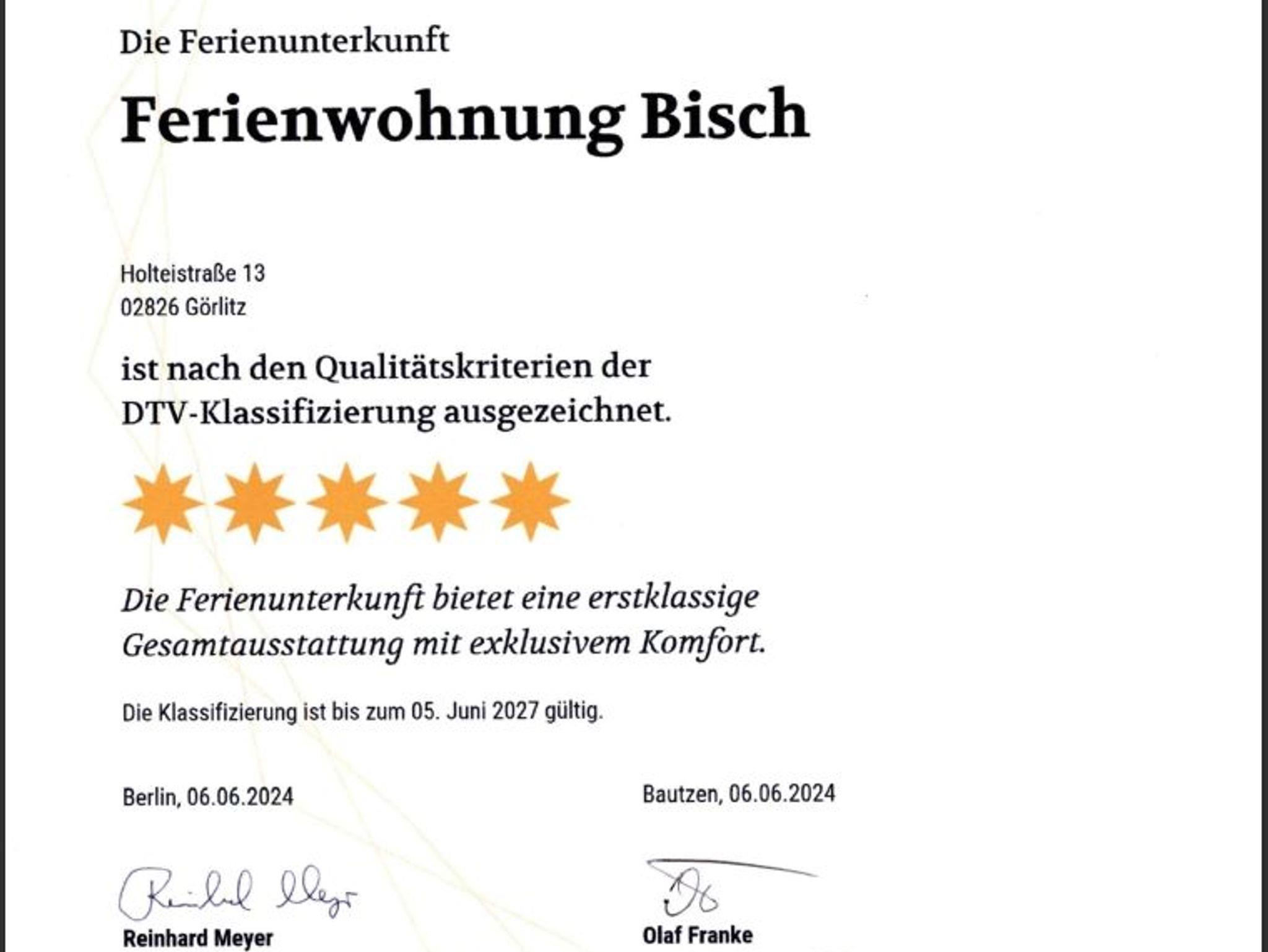 Die Wohnung ist nach den Qualitätskriterien der DTV-Klassifizierung mit 5 Sternen ausgezeichnet