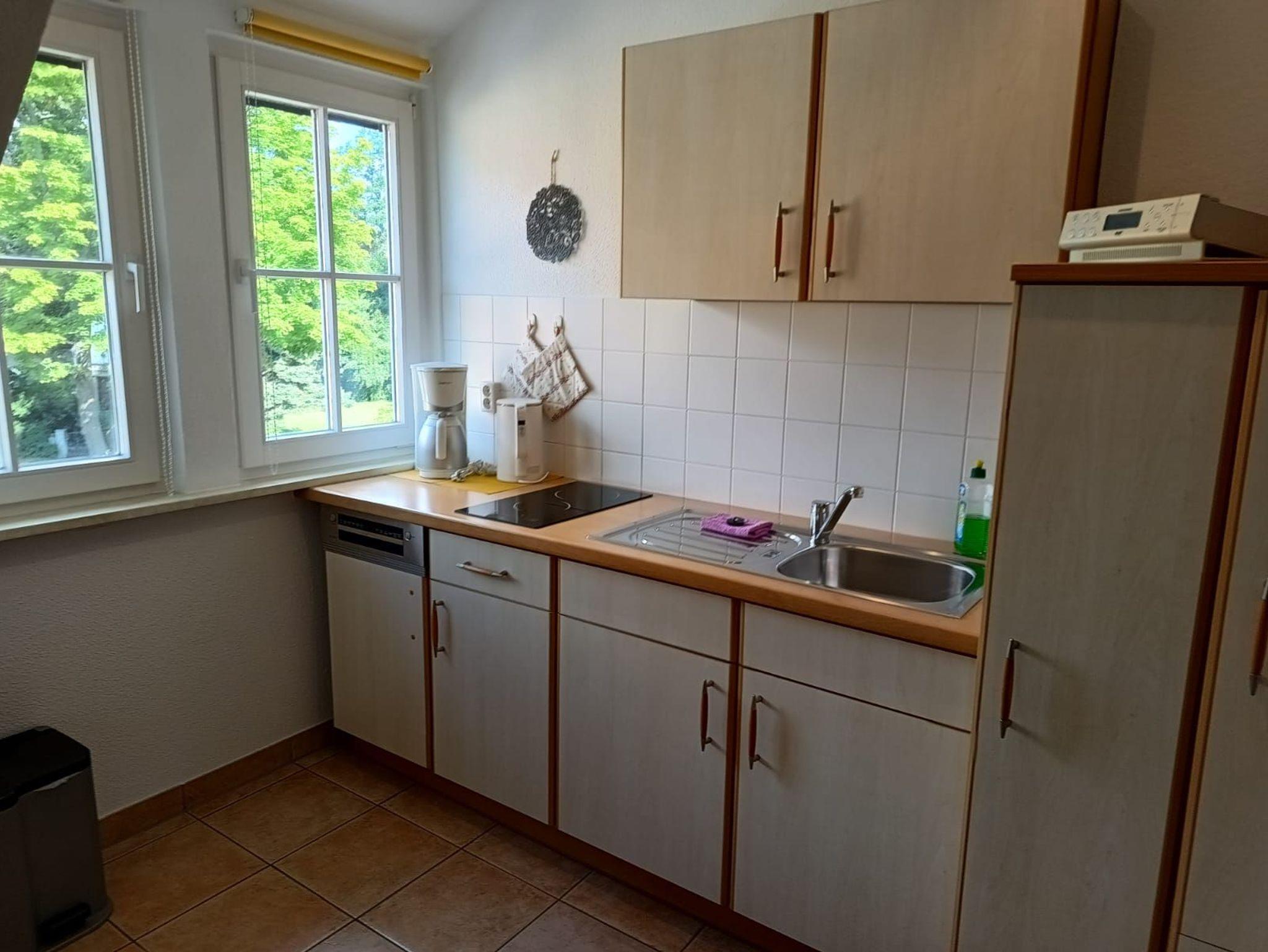 Die 7 m² große Küche beinhaltet einen Essplatz sowie eine Küchenzeile bestehend aus Ober- und Unter-schränken, Elektroherd (2-flammig), Spülbecken mit Abtropffläche, Kühlschrank, Kaffeemaschine, Toaster, Geschirrspüler und Geschirr.