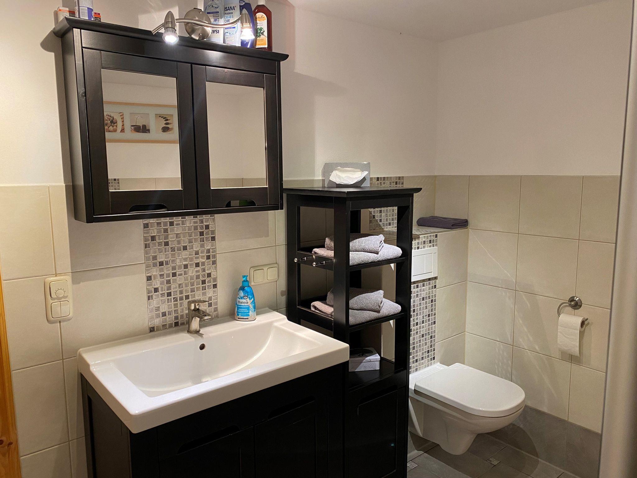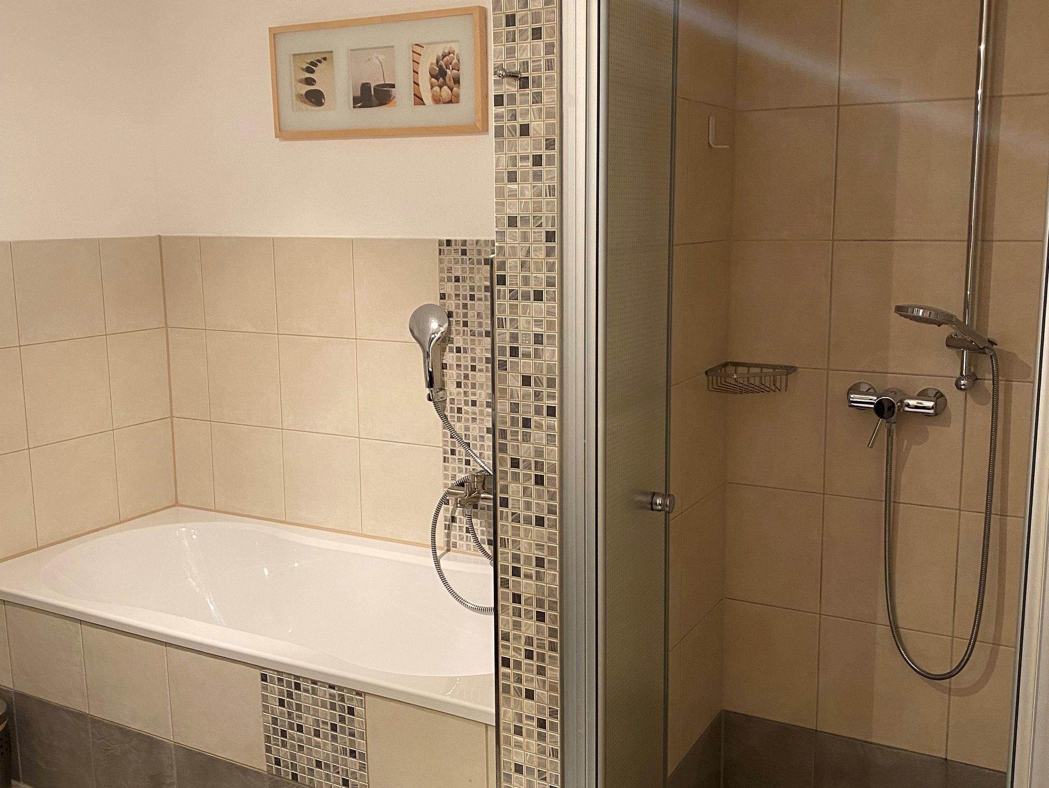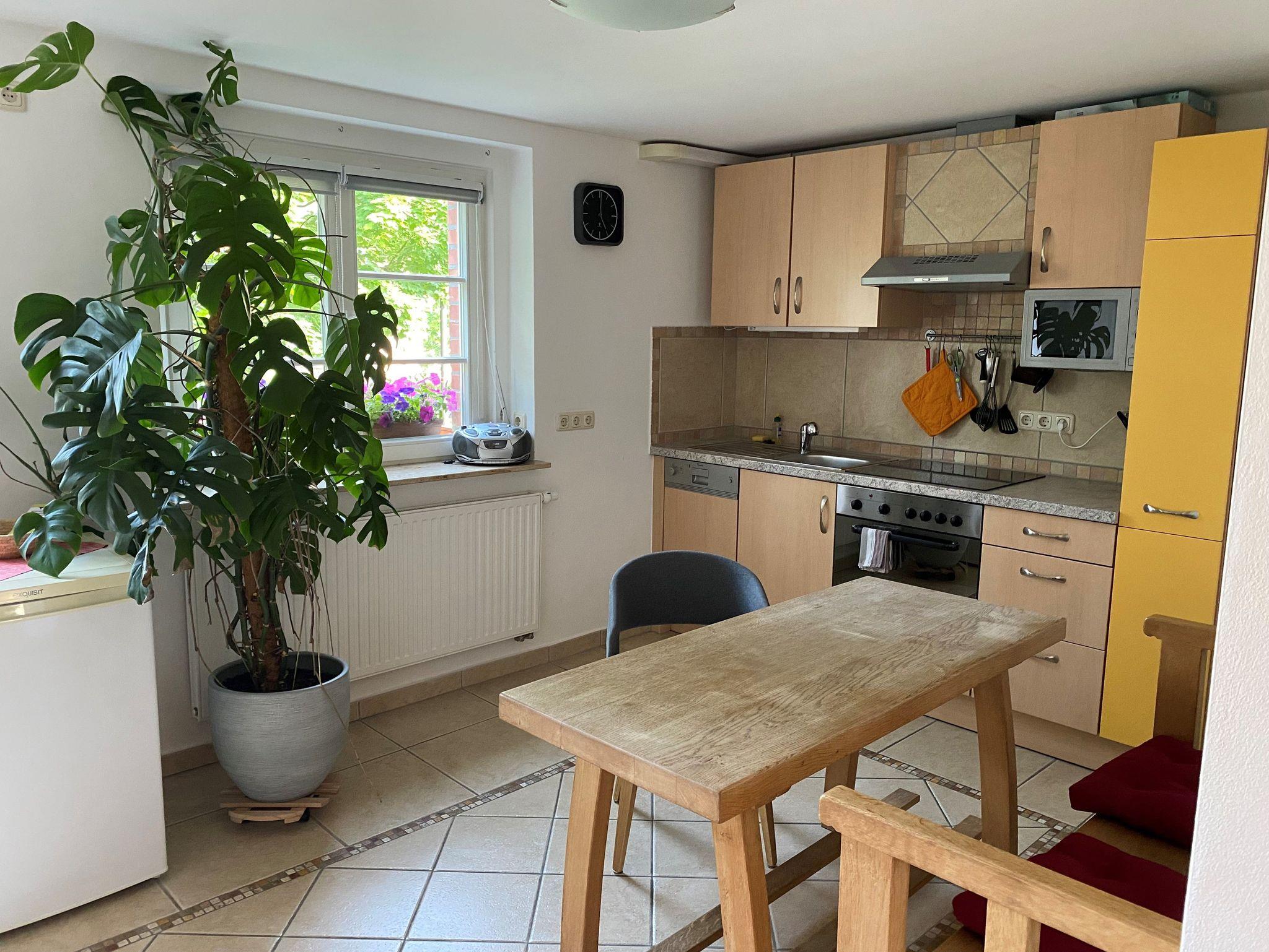 Komplett modern eingerichtet Ferienwohnung in ruhiger grüner Lage mit einer Wohnküche und einem Schlafraum. Das Badezimmer befindet sich in der unteren Etage der Wohnung und verfügt über Badewanne, Dusche, Fön und Handtücher. Die Terrasse im Grünen darf mit benutzt werden. Es gibt kostenfreies WLAN. Waschmaschine, Geschirrspüler, Kühlschrank mit Gefrierfach, 4-flammiger Herd mit Backofen und alle elektrischen Küchengeräte sind vorhanden. Ausreichende Parkmöglichkeiten in der Nähe.