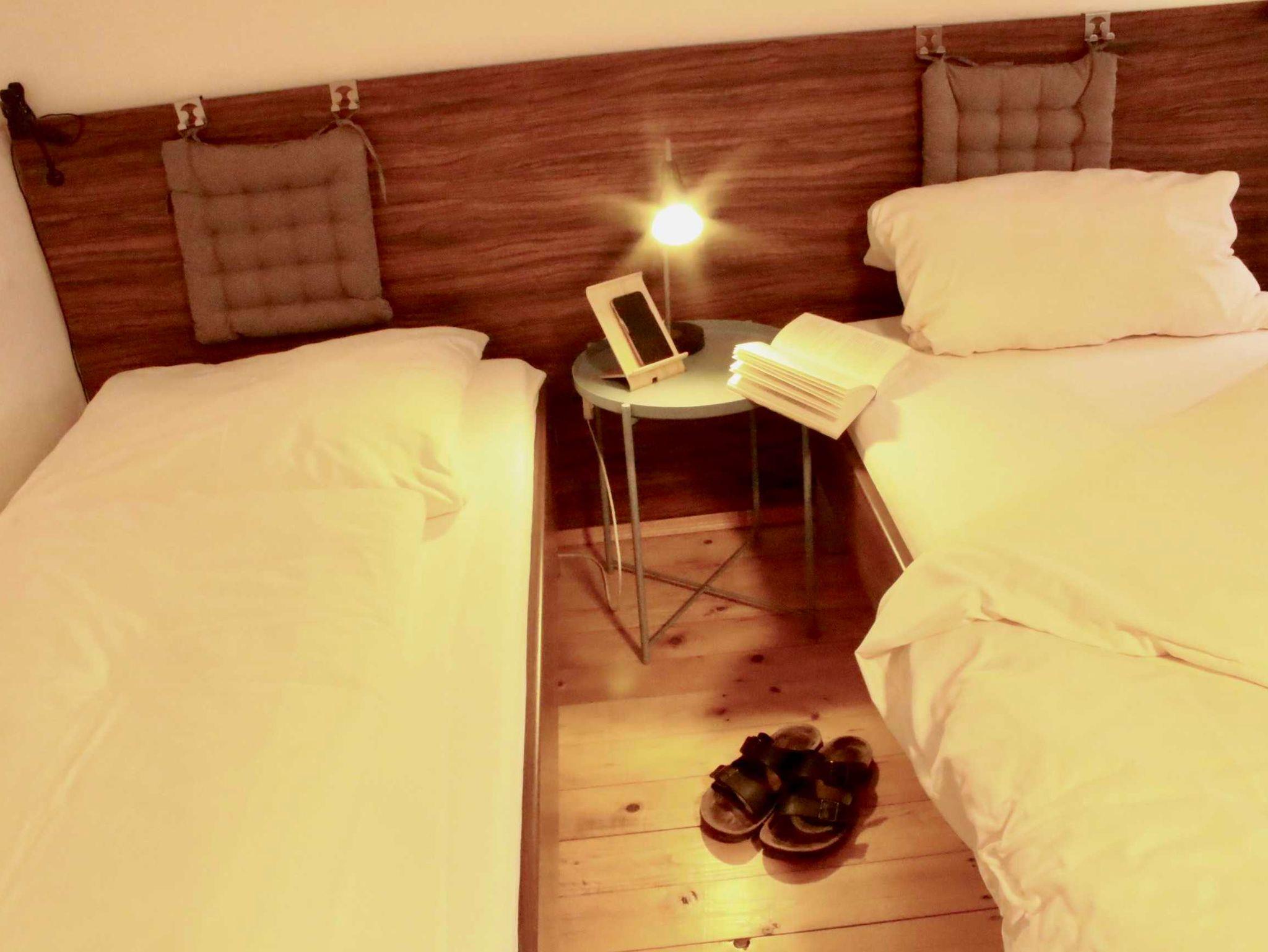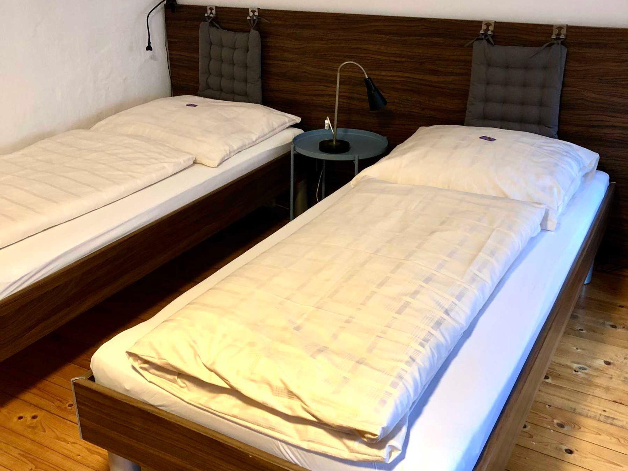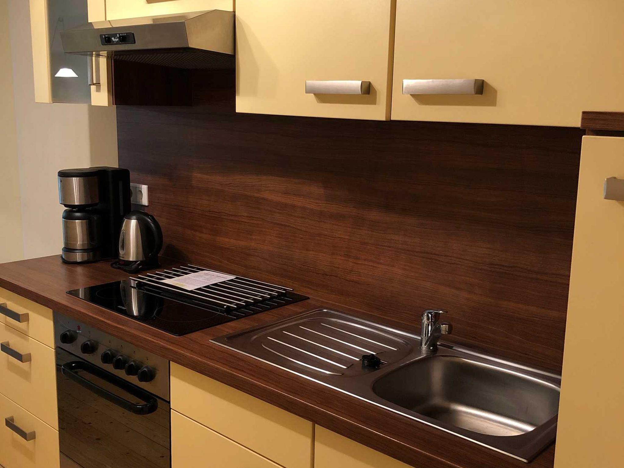 2 Einzelbetten 90x200, eine Schlafcouch, komplette Küchenzeile mit Mikrowelle und Herd, in der FeWo Altstadtbrücke befindet sich eine Dusche in der Badewanne -