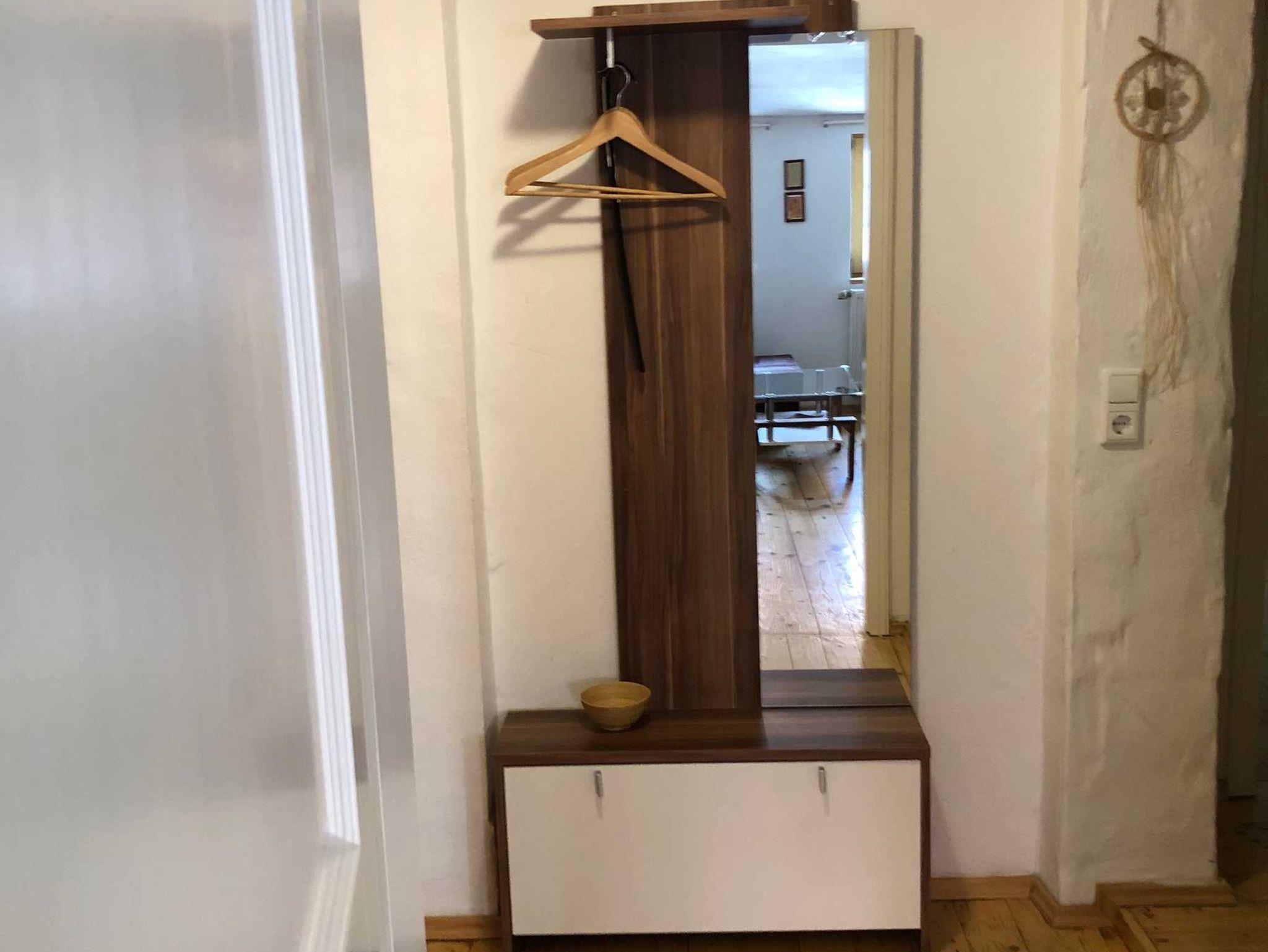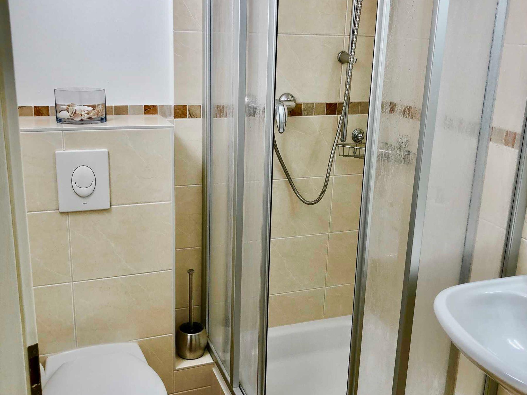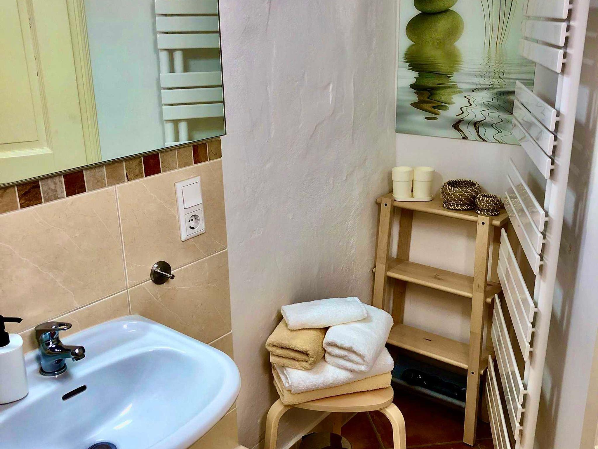 in der FeWo Peterskirche eine Dusche. Beide Wohnungen sind baugleich, in der FeWo Altstadtbrücke ist die historische Holzbalkendecke freigelegt...