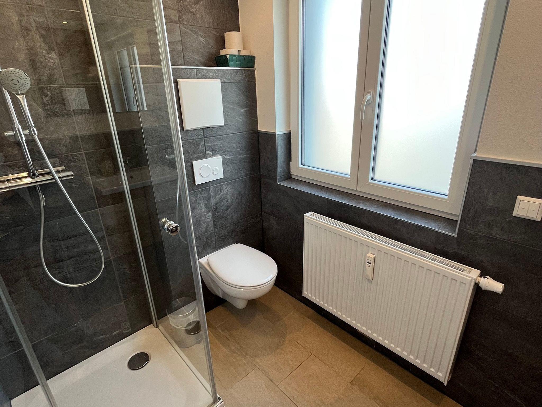 Das kleine Bad mit Waschbecken, Spiegel, Dusche und WC ist saniert und modern eingerichtet.