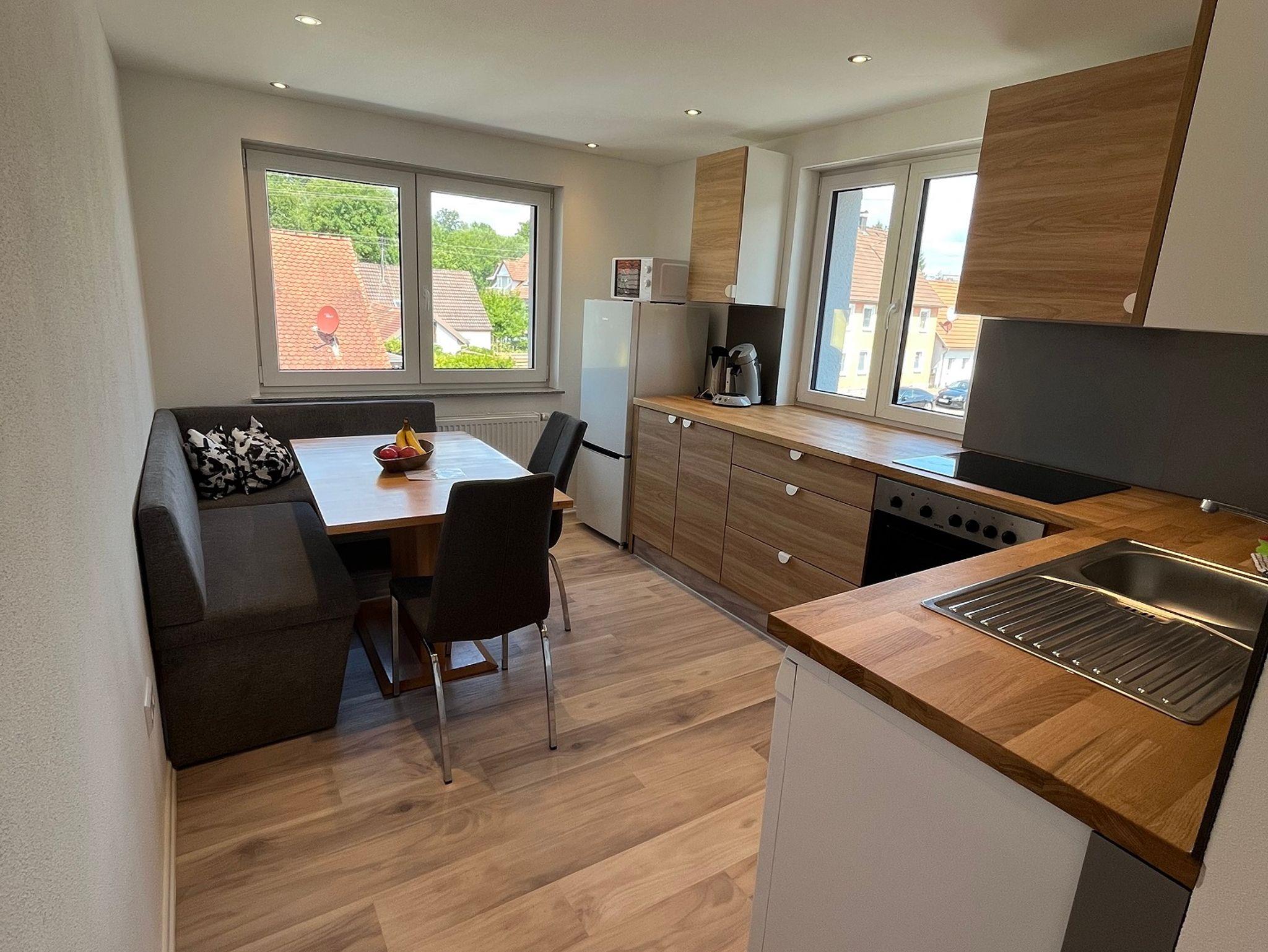 Die komplett ausgestattete Küchemit Geschirrspüler, Kühlschrank, Herd, Backofen, Kaffeepadmaschine, Toaster und Wasserkocher lässt keine Wünsche offen. Hier befindet sich auch ein Essbereich für 4 Personen und einem optionalen Kinderstuhl.