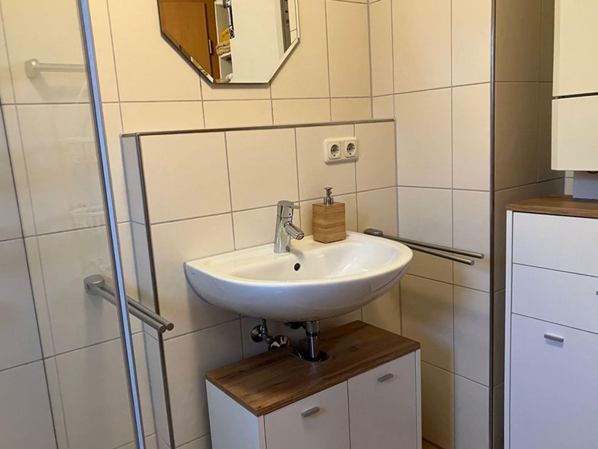 1 Schlafzimmer mit Stockbett. Modernes Tageslichtbad mit Dusche und WC.