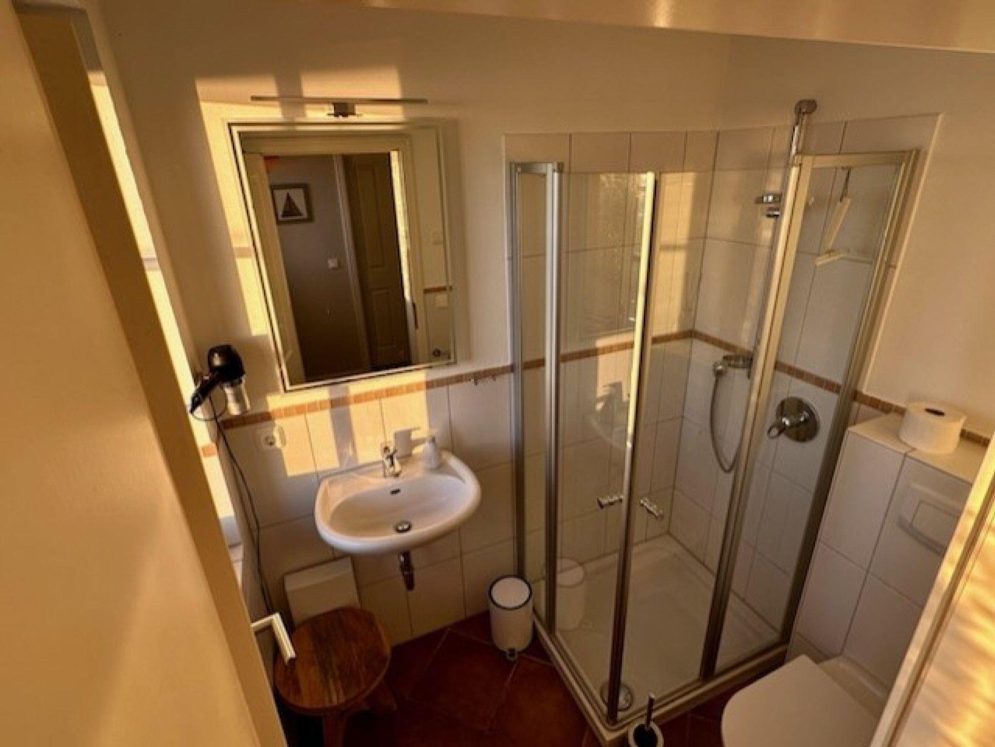 Ein großer, drehbarer Fernseher kann sowohl vom Essbereich und der Küche als auch direkt vom Sofa aus genutzt werden. Zusätzlich stehen ein DVD-Player, eine Stereoanlage, eine Auswahl an Büchern sowie Spiele zur Verfügung. Verbringen Sie gemeinsam Zeit am großen Esstisch oder kochen Sie in der voll ausgestatteten offenen Küche mit Kühl-Gefrierkombination, Cerankochfeld, Dunstabzugshaube, Geschirrspüler, Toaster, Mikrowelle, Wasserkocher und Filterkaffeemaschine. Das Schlafzimmer mit Blick auf den Bodden verfügt über zwei Einzelbetten und einen Fernseher. Das separate Duschbad befindet sich gegenüber dem Schlafzimmer. Unter der Treppe befindet sich ein kleiner Abstellraum.