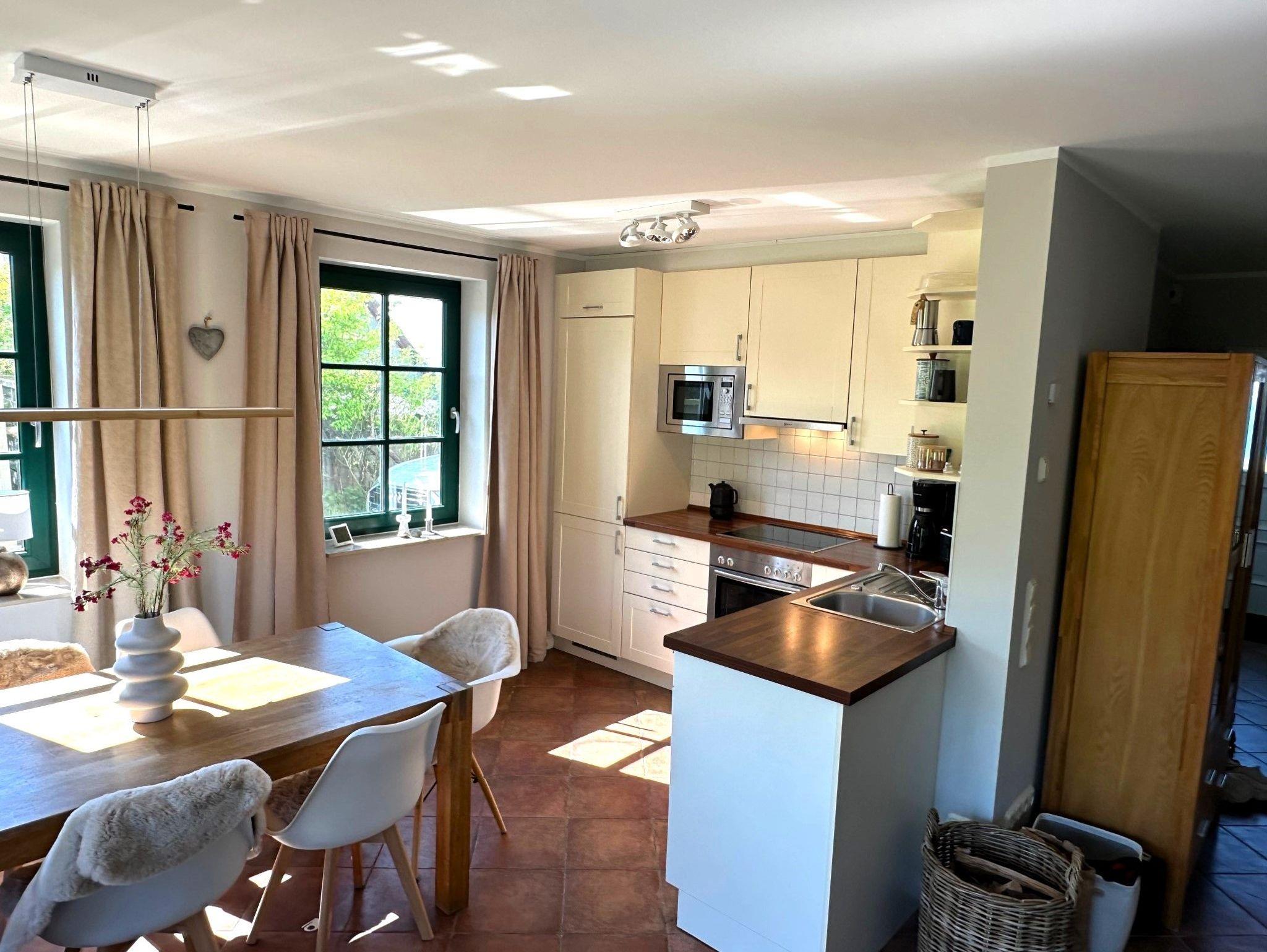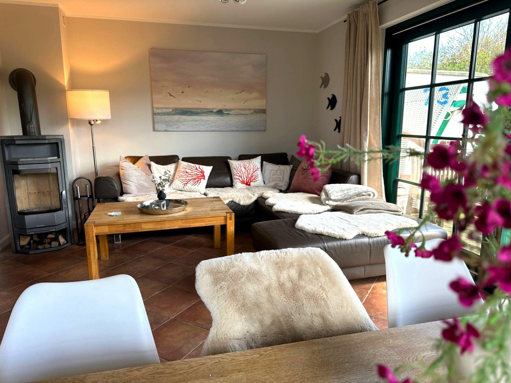 Vom Eingangsbereich aus führt eine Glastür ins Erdgeschoss, wo Sie den gemütlichen Wohn-, Küchen- und Essbereich vorfinden. Von dort aus gelangen Sie in den Garten mit Südterrasse und Blick auf das UNESCO-Naturschutzgebiet Zickersche Berge. Der offene Wohnraum ist mit einem hochwertigen Ledersofa ausgestattet. Der Kaminofen verbreitet eine gemütliche Wärme, besonders nach langen Spaziergängen in der kalten Jahreszeit.