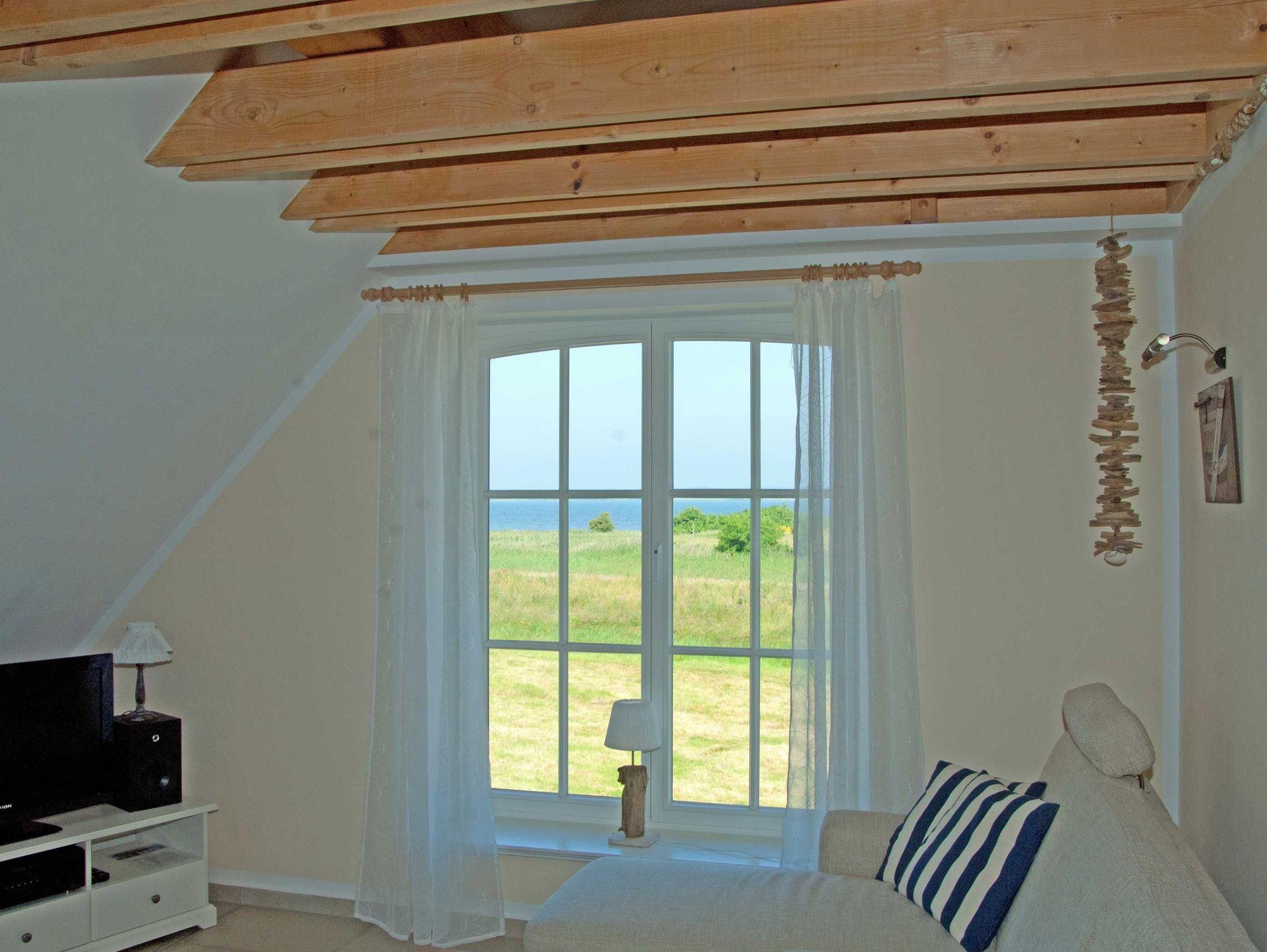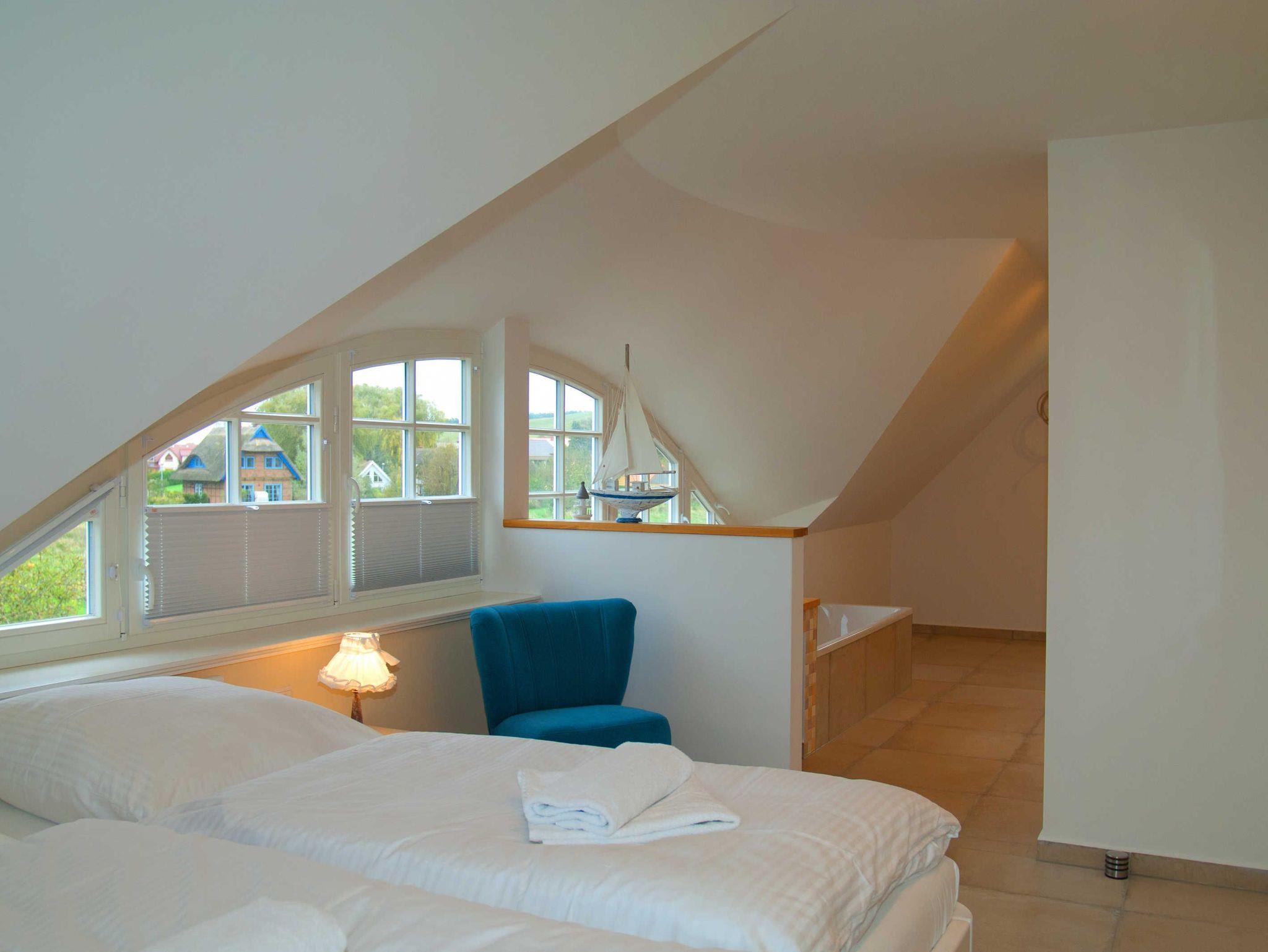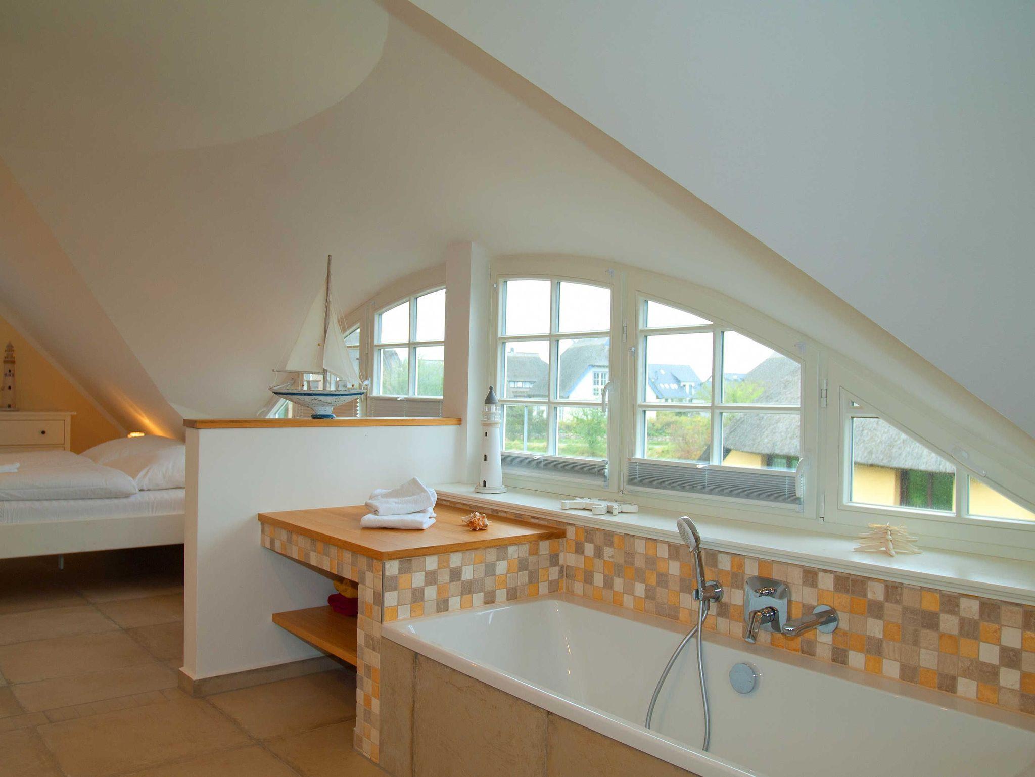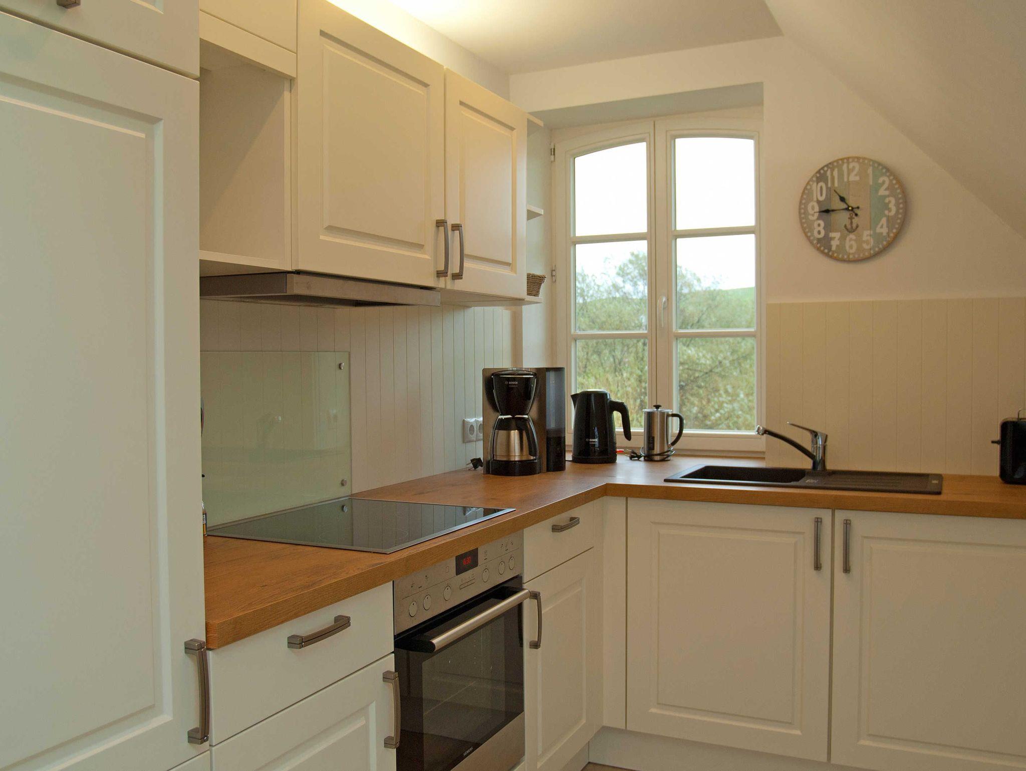 Die wunderschöne Küche im Landhaus Stil ist mit hochwertigen Markengeräten ausgestattet. Ein großer Esstisch bietet Platz für gemütliche Abende mit weitem Ausblick bis hin zur Insel Vilm. Die beiden Schlafbereiche sind mit Doppelbetten und Flachbild-TV ausgestattet. Den besonders gemütlichen Schlafbereich im Spitzboden erreicht man über eine Treppe vom Wohnzimmer. Die im Wohnbereich offene Zwischendecke mit freiliegenden Balken ist das Highlight dieser Wohnung. Zum luxuriös ausgestattete Bad mit großer ebenerdiger Regendusche gehört eine große Badewanne und ausreichend Platz. Das nicht im Bad befindliche WC ist von beiden Schlafbereichen separat zugänglich.