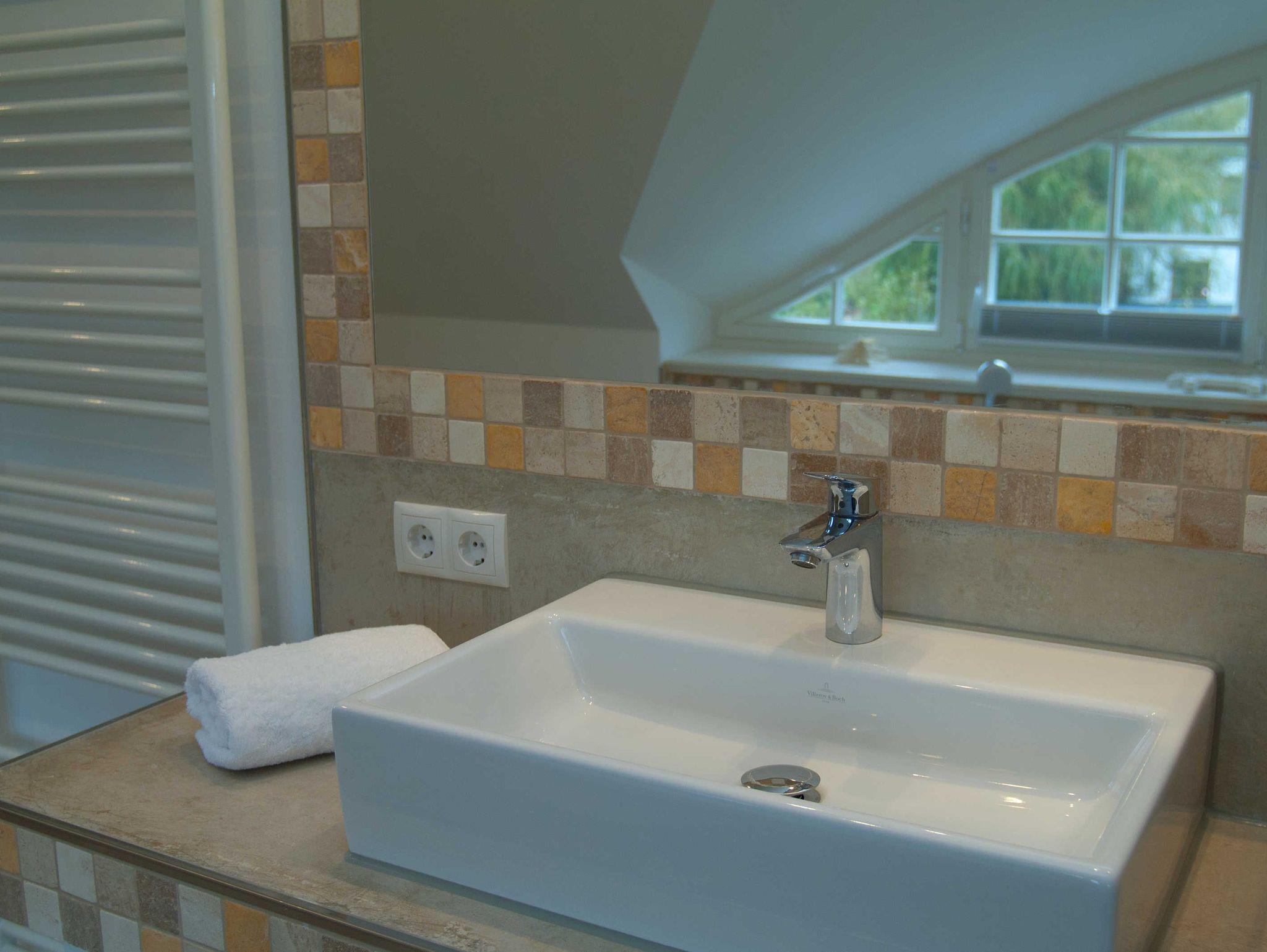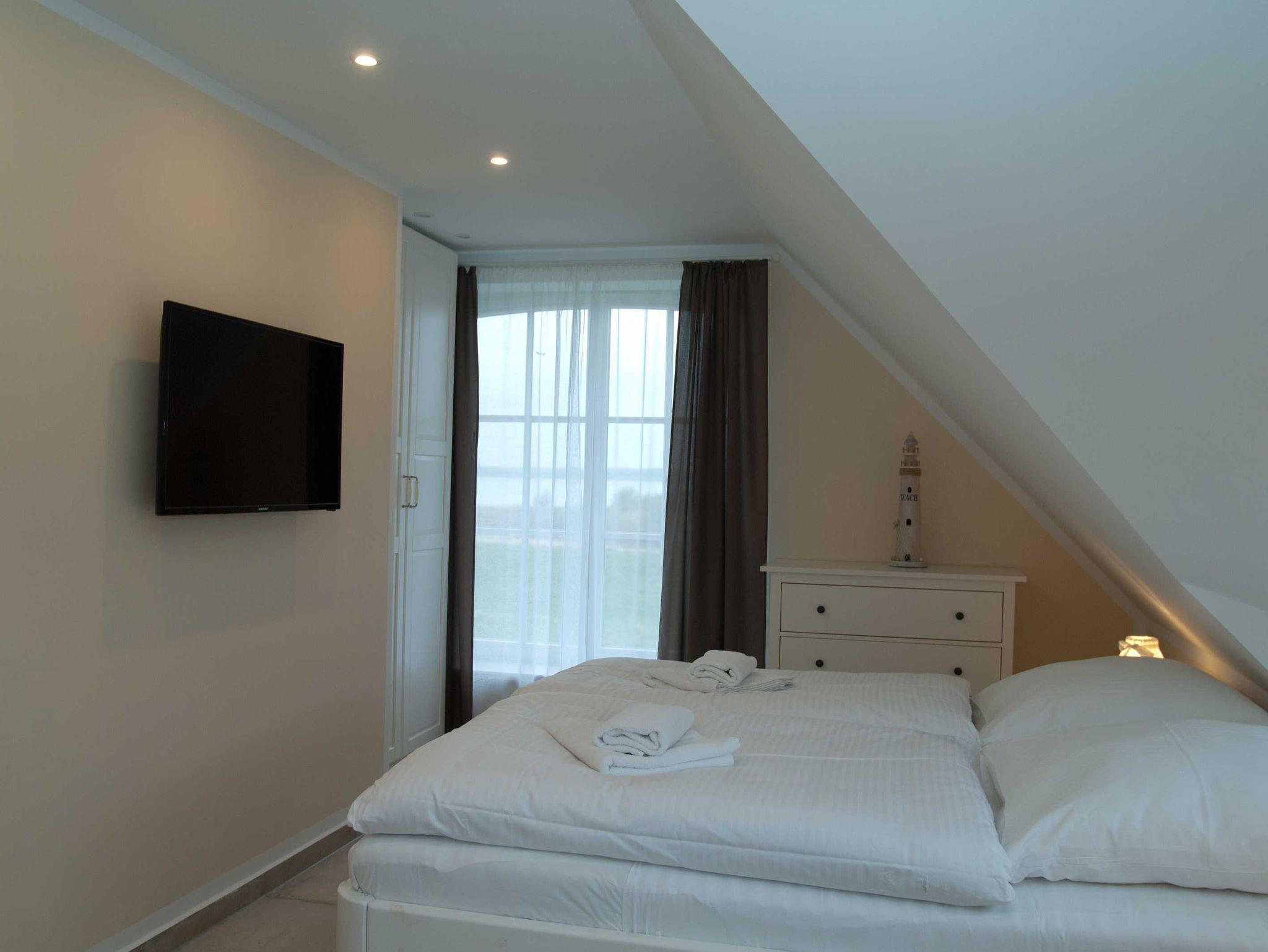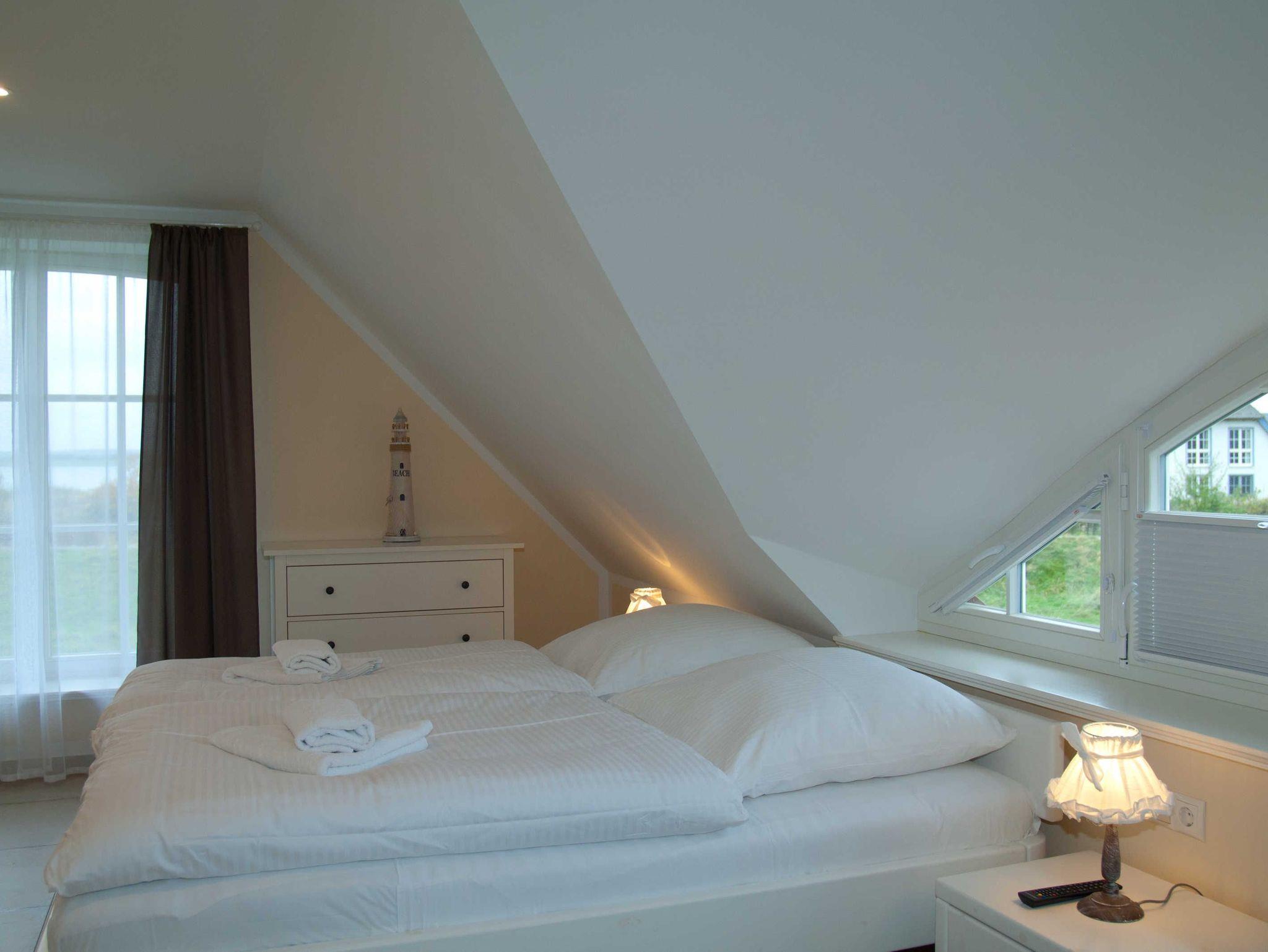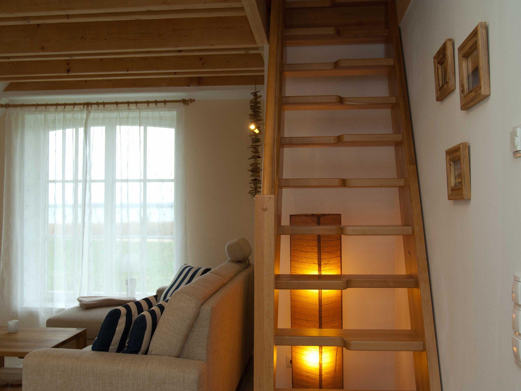 Die wunderschöne Küche im Landhaus Stil ist mit hochwertigen Markengeräten ausgestattet. Ein großer Esstisch bietet Platz für gemütliche Abende mit weitem Ausblick bis hin zur Insel Vilm. Die beiden Schlafbereiche sind mit Doppelbetten und Flachbild-TV ausgestattet. Den besonders gemütlichen Schlafbereich im Spitzboden erreicht man über eine Treppe vom Wohnzimmer. Die im Wohnbereich offene Zwischendecke mit freiliegenden Balken ist das Highlight dieser Wohnung. Zum luxuriös ausgestattete Bad mit großer ebenerdiger Regendusche gehört eine große Badewanne und ausreichend Platz. Das nicht im Bad befindliche WC ist von beiden Schlafbereichen separat zugänglich.