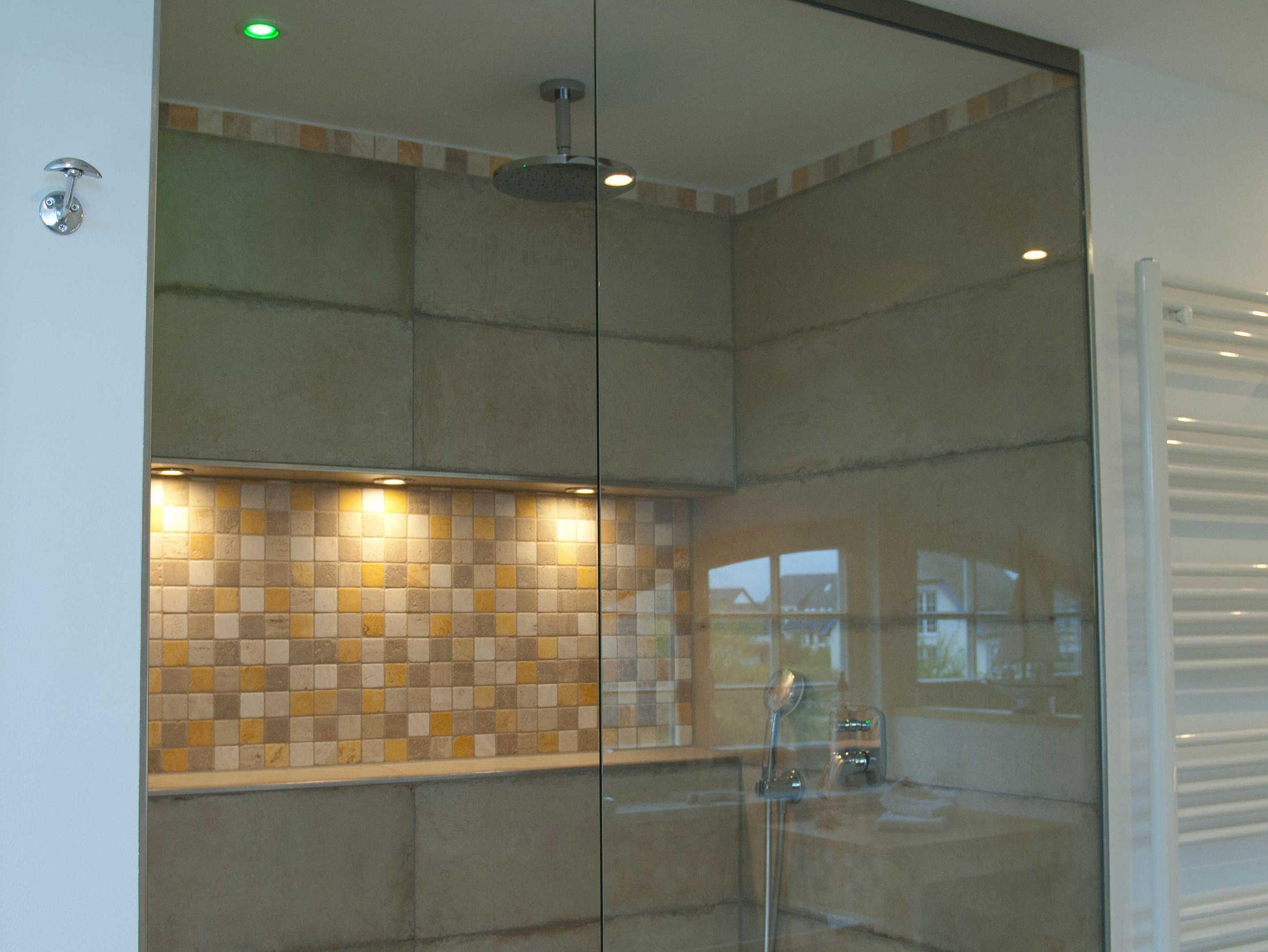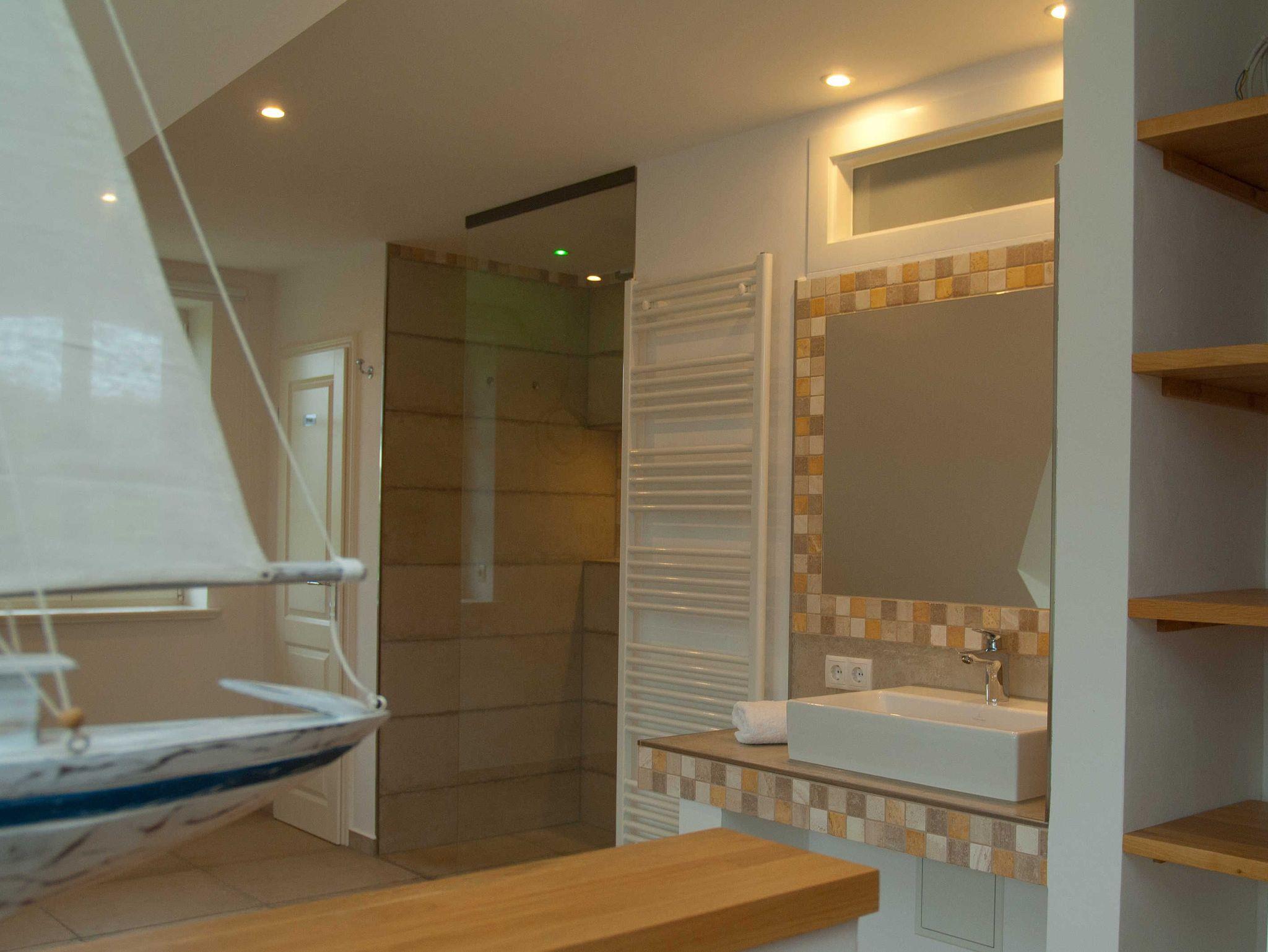 Der Badbereich mit Wellness-Regendusche bietet ausreichend Platz zum Relaxen.