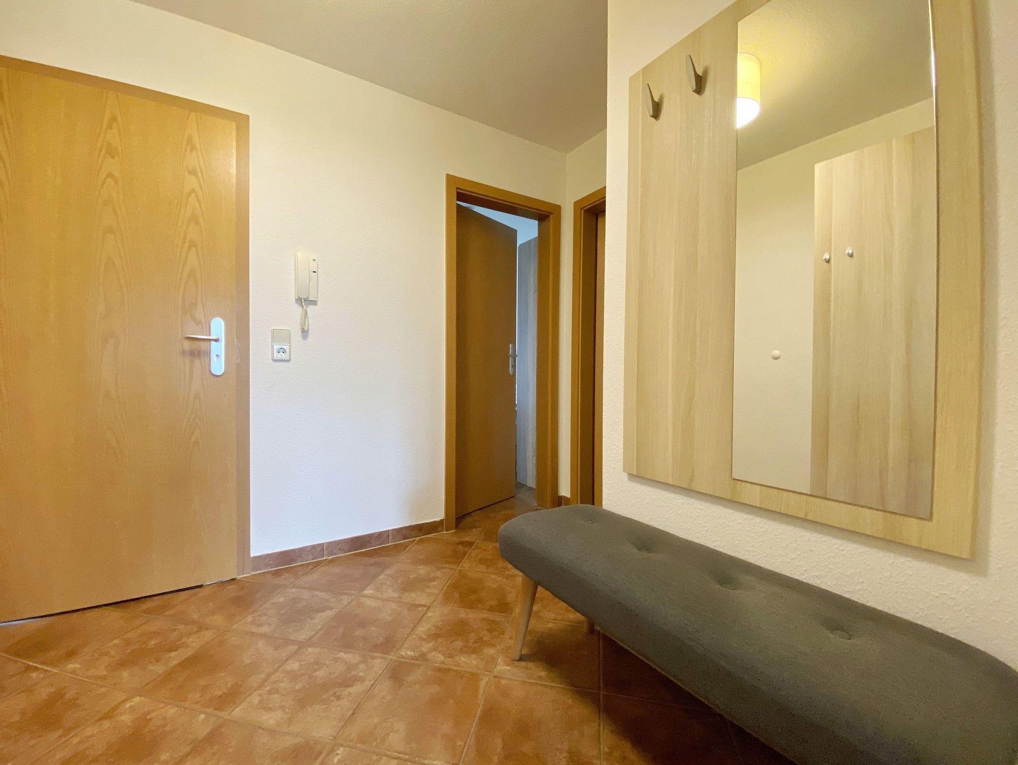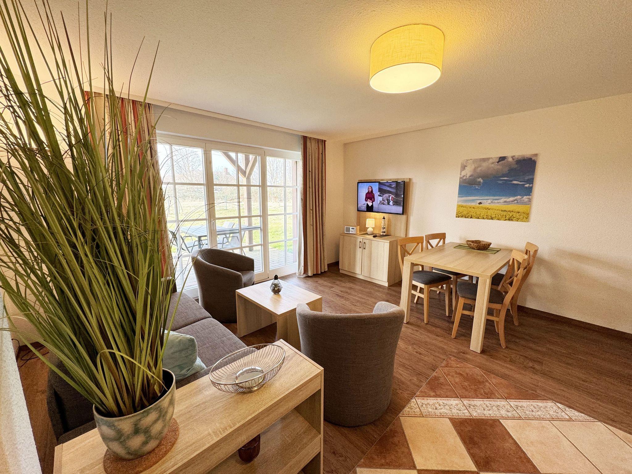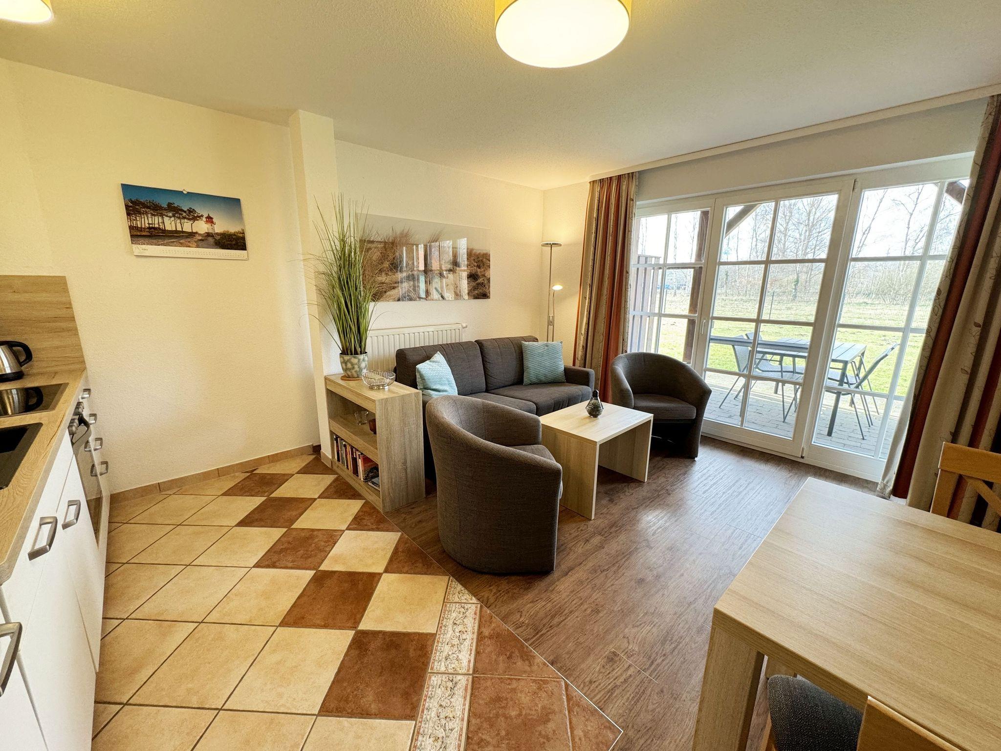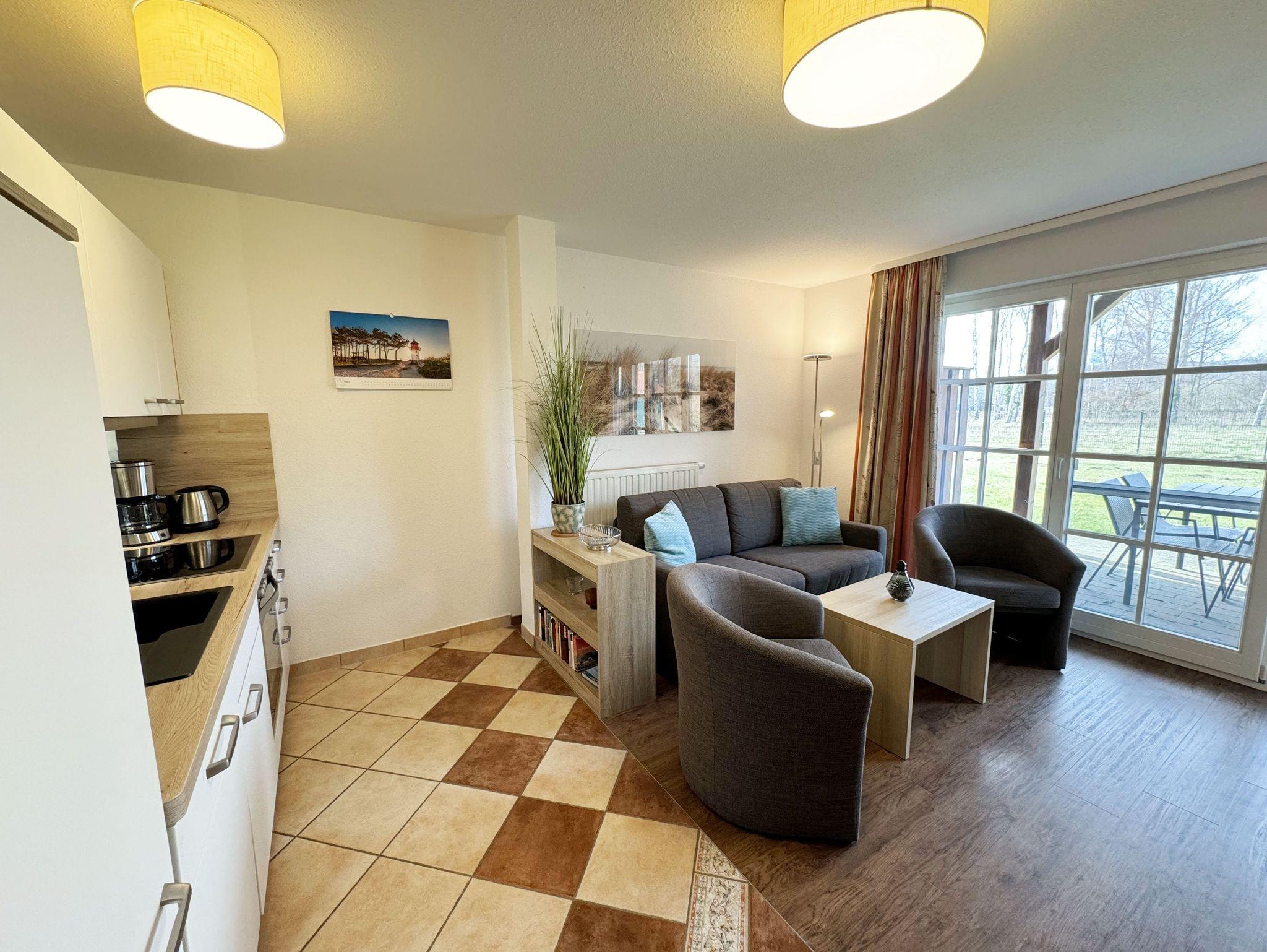 Die Zwei-Zimmer-Wohnung Nr. 3 befindet sich im Erdgeschoss. Die Terrassenwohnung ist eine Nichtraucherwohnung. Sie wohnen hier auf insgesamt 43 qm mit max. 4 Personen. Sie verfügt über einen modernen, separaten Schlafraum mit einem Doppelbett mit Komfortmatratzen (2 x 0,90 m x 2,00 m), Nachttischkonsolen, Kleiderschrank und ist mit Vinylboden ausgelegt worden. Im Flur finden Sie einen weiteren großen Kleiderschrank, eine Garderobe und einen Ganzkörperspiegel. Der Wohn- und Essbereich ist gemütlich und modern eingerichtet. Neben einem Schlafsofa (Aufbettungsmöglichkeit für die 3./4. Person,1,60m x 2,00m) und 2 Sessel finden Sie hier auch einen Couchtisch, Smart-TV, DAB-Radio, sowie einen Essplatz mit vier Stühlen. Die Küchenzeile ist komplett neu eingerichtet mit Spülmaschine, Ceran-Kochfeld, Backofen, Kühlschrank mit 3 ***Gefrierfach, Mikrowelle, Toaster, Wasserkocher, Kaffeemaschine sowie diverse Küchenutensilien, die Sie zur Selbstverpflegung benötigen. Vom Wohnbereich mit großzügiger Fensterfront gelangen Sie auf die bestuhlte und überdachte Terrasse. Genießen Sie bei einem Frühstück oder abends bei einem Glas Wein den Blick ins Grüne. Das geflieste Badezimmer verfügt über eine Dusche, einen Fön, einen Kosmetikspiegel, einen Waschtisch und ein WC. Insektenschutzgitter sind am Fenster bzw. Terassentür vorhanden. Haustiere sind nicht erlaubt. Die Internetnutzung (WLAN) ist für Sie inklusive. Ein eigener PKW-Stellplatz (Nr.03) ist ebenfalls inklusive und steht Ihnen direkt vor dem Haus zur Verfügung. Auf dem Grundstück können Sie Ihre Fahrräder abstellen und an Fahrradständern anschließen. Die Erstausstattung eines Wäschepaketes (komplette Bettwäsche, 1 Duschhandtuch, 1 kleines Handtuch) können Sie bis 14 Tage gegen einen Aufpreis dazu buchen oder durch eigene Ergänzen. Ab 2 gebuchten Paketen erhalten Sie einmalig 1 Geschirrhandtuch und 1 Duschvorleger hinzu.