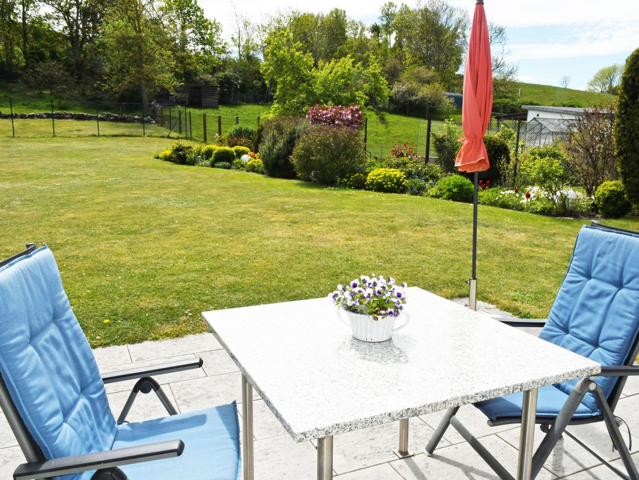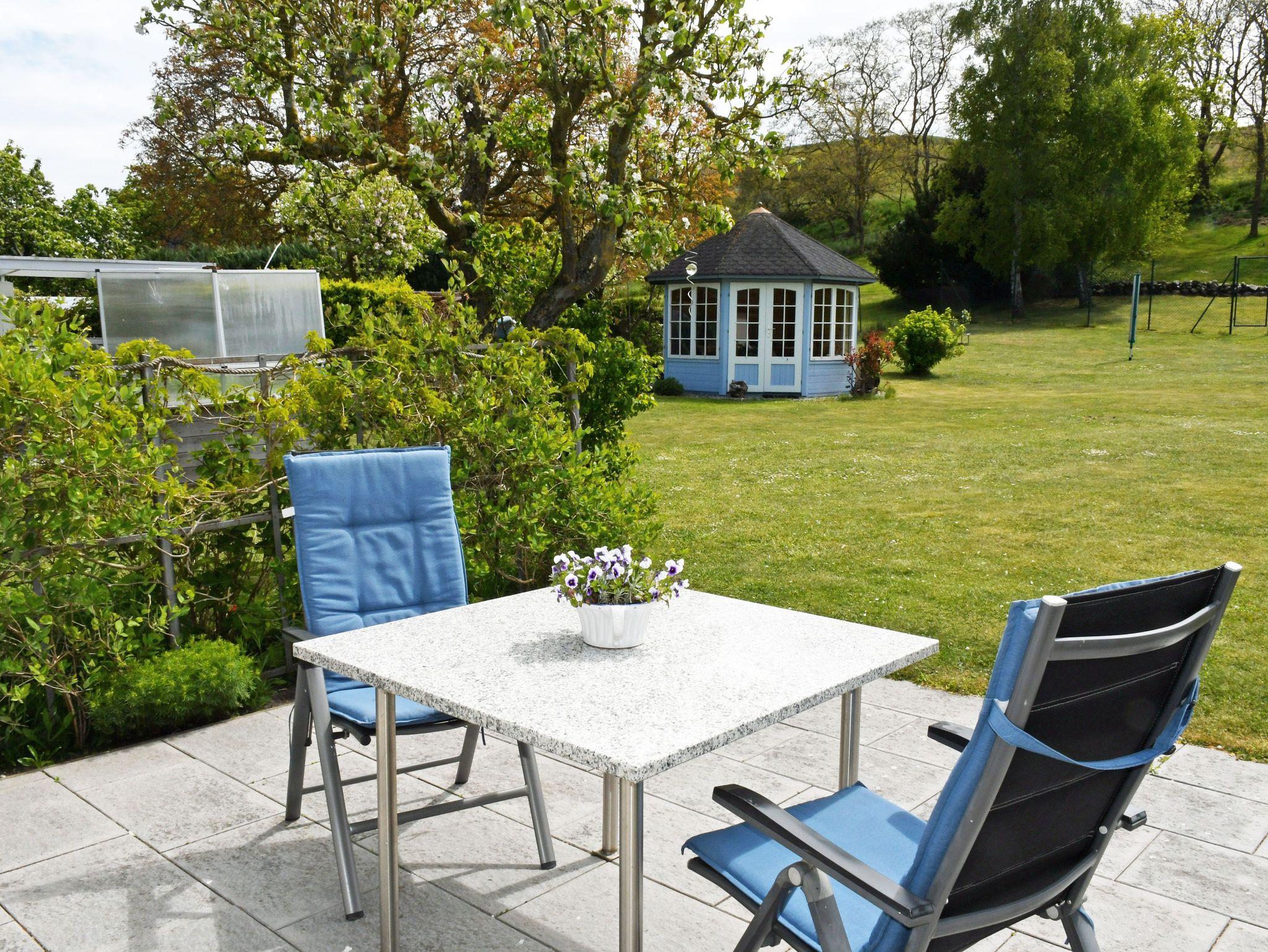 Zum Ferienhaus gehören eine schöne Sonnenterrasse mit Sitzgelegenheiten und ein großer Naturgarten mit Liegewiese, in dem Sie die Seele baumeln lassen können. Am nahe gelegenen Hafen erhalten Sie fangfrischen Fisch oder gehen an Bord eines Ausflugsschiffes. Abends sitzen Sie gemütlich auf der blauen Bank vor dem Haus und erleben spektakuläre Sonnenuntergänge. Parklätze sind auf dem Grundstück ausreichend vorhanden.