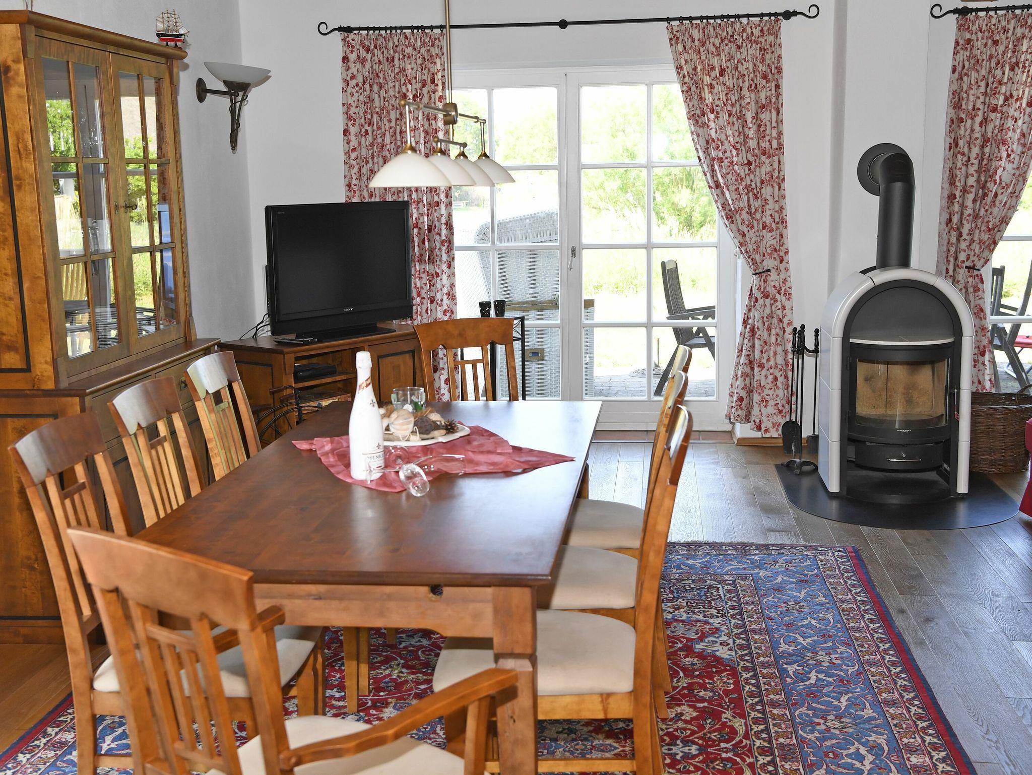 Das Haus verfügt über ein Wohn-/Esszimmer mit einem Esstisch für 6 Personen, einer Sitzecke mit Kaminofen, TV mit DVD - Player und Stereoanlage, eine Küche mit Backofen, Kühlschrank, 4 Platten-Induktionsherd, Mikrowelle und Geschirrspüler sowie zwei Abstellräume mit Waschmaschine und Bügelutensilien.