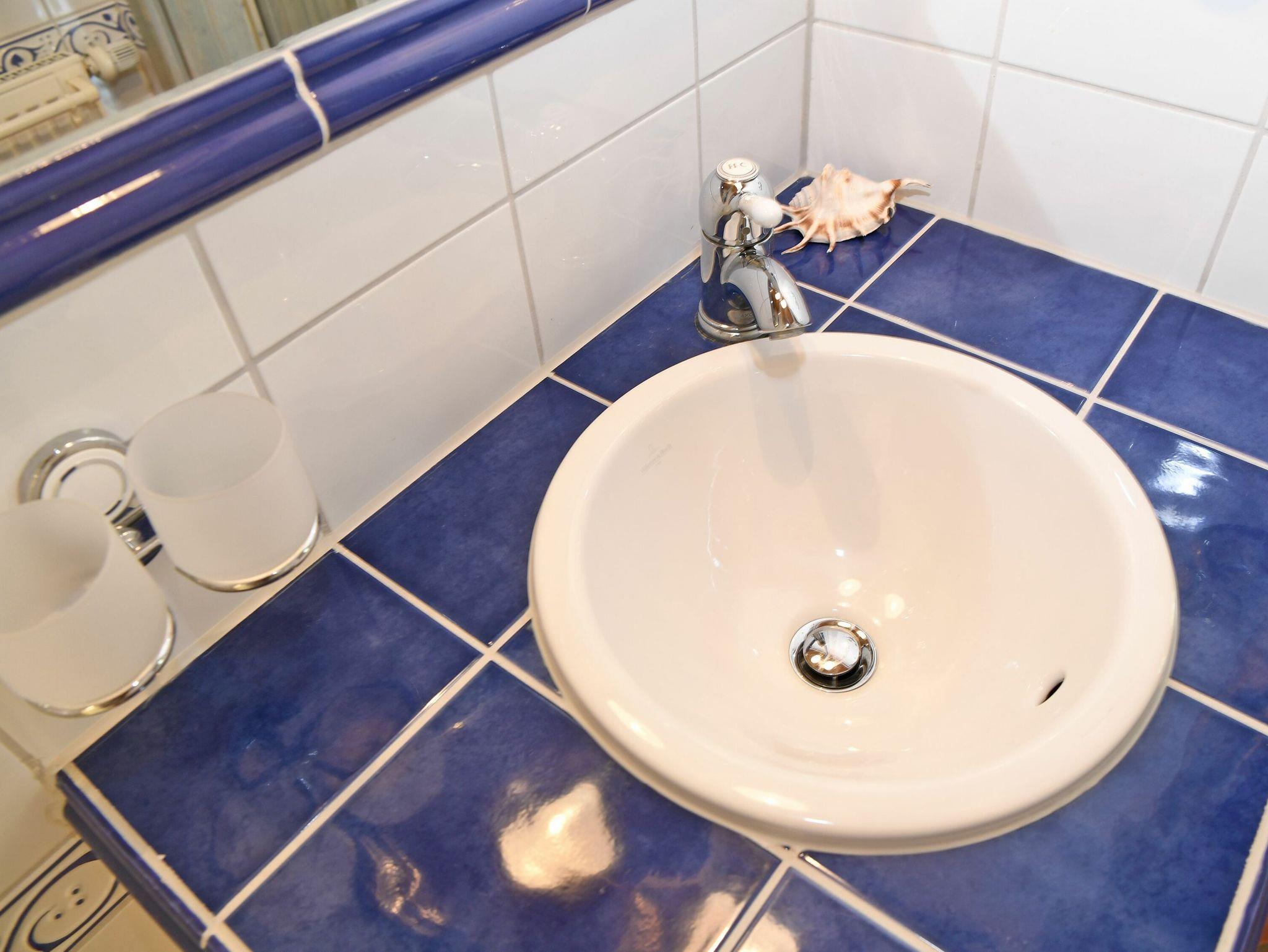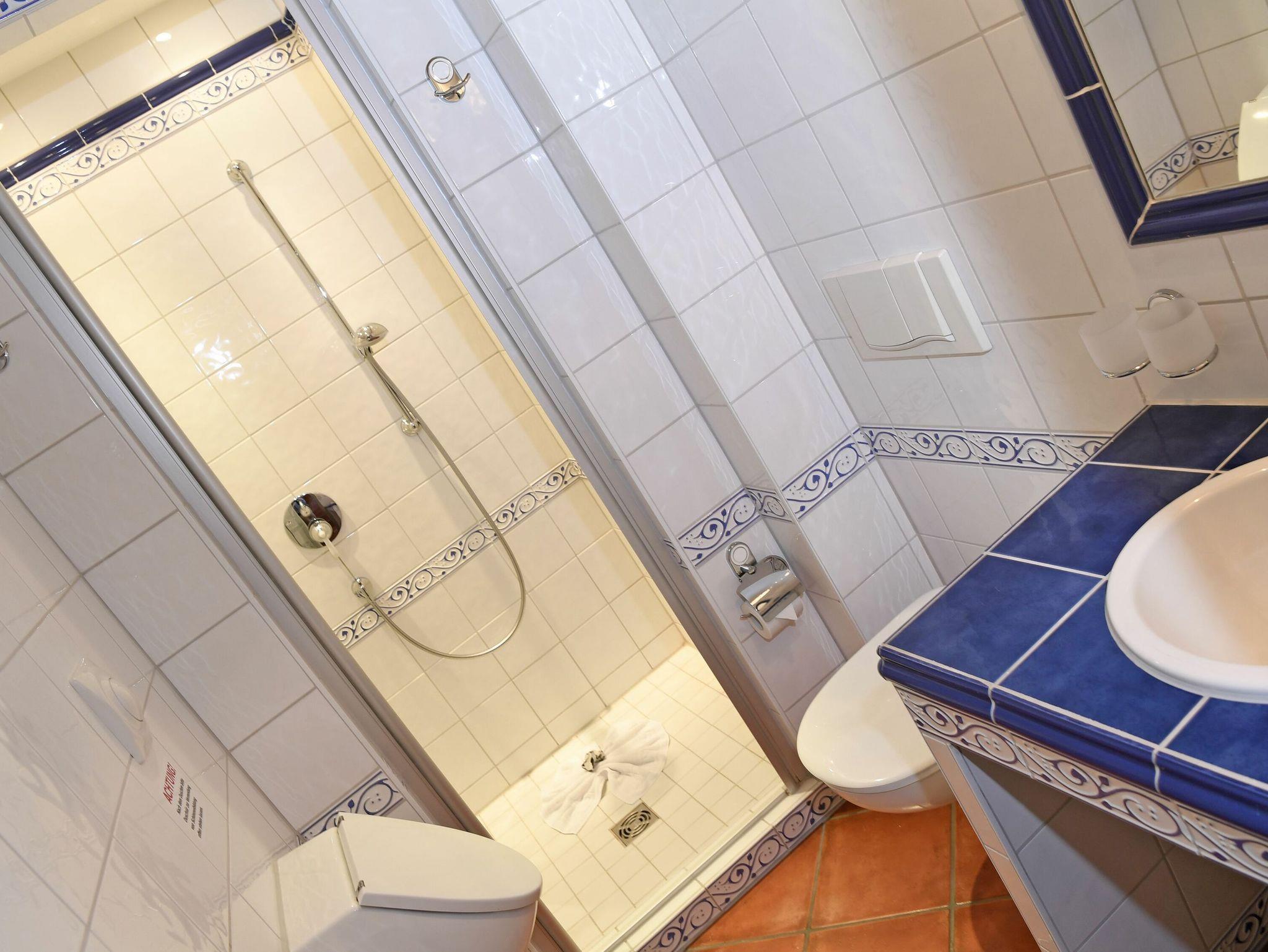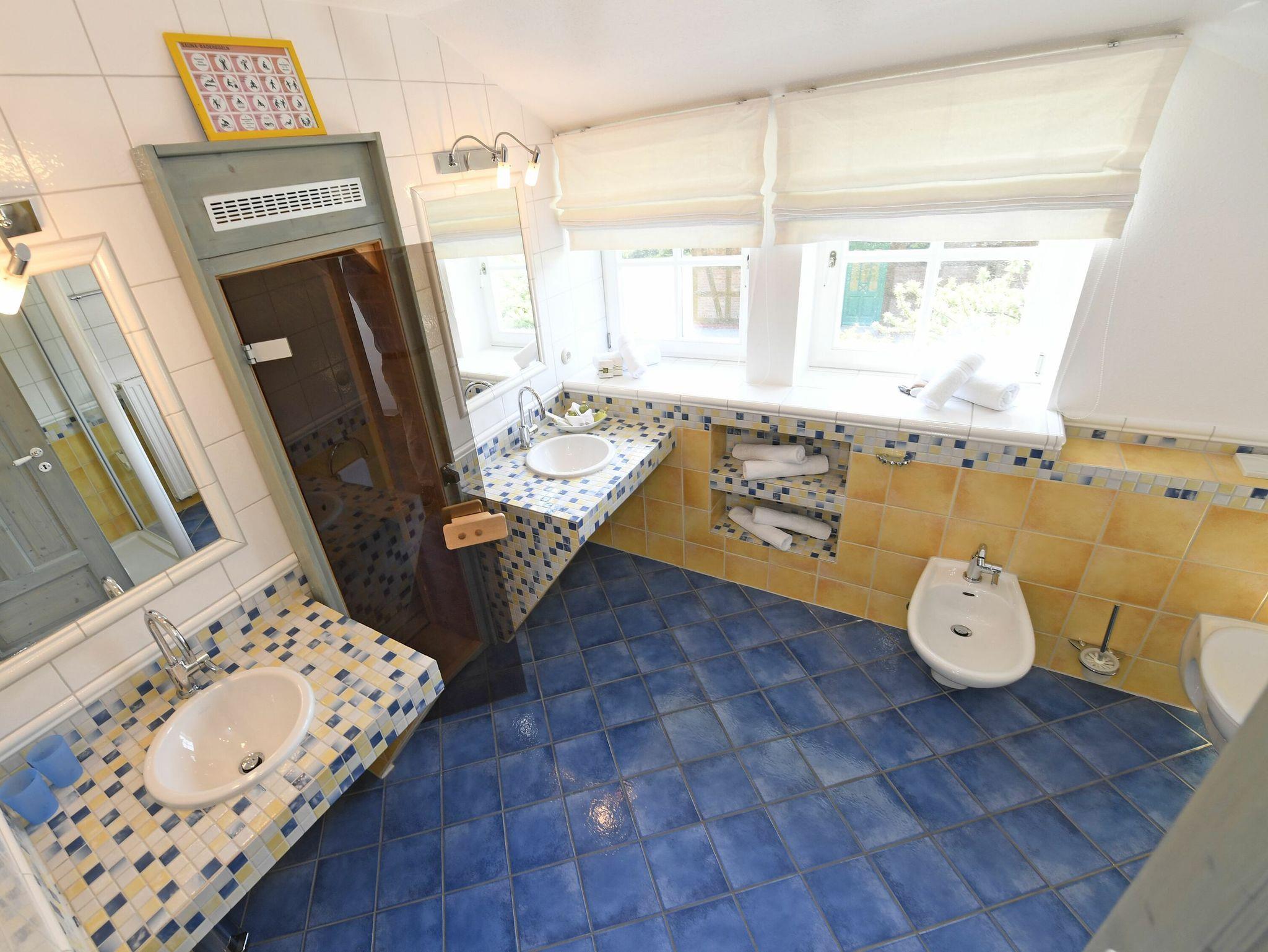 Im Erdgeschoss befindet sich außerdem ein Duschbad unter Balken. Im Obergeschoss des Hauses finden Sie ein weiteres Badezimmer mit Dusche, Waschbecken und einer Sauna sowie drei geräumige Schlafzimmer mit je einem Doppelbett.