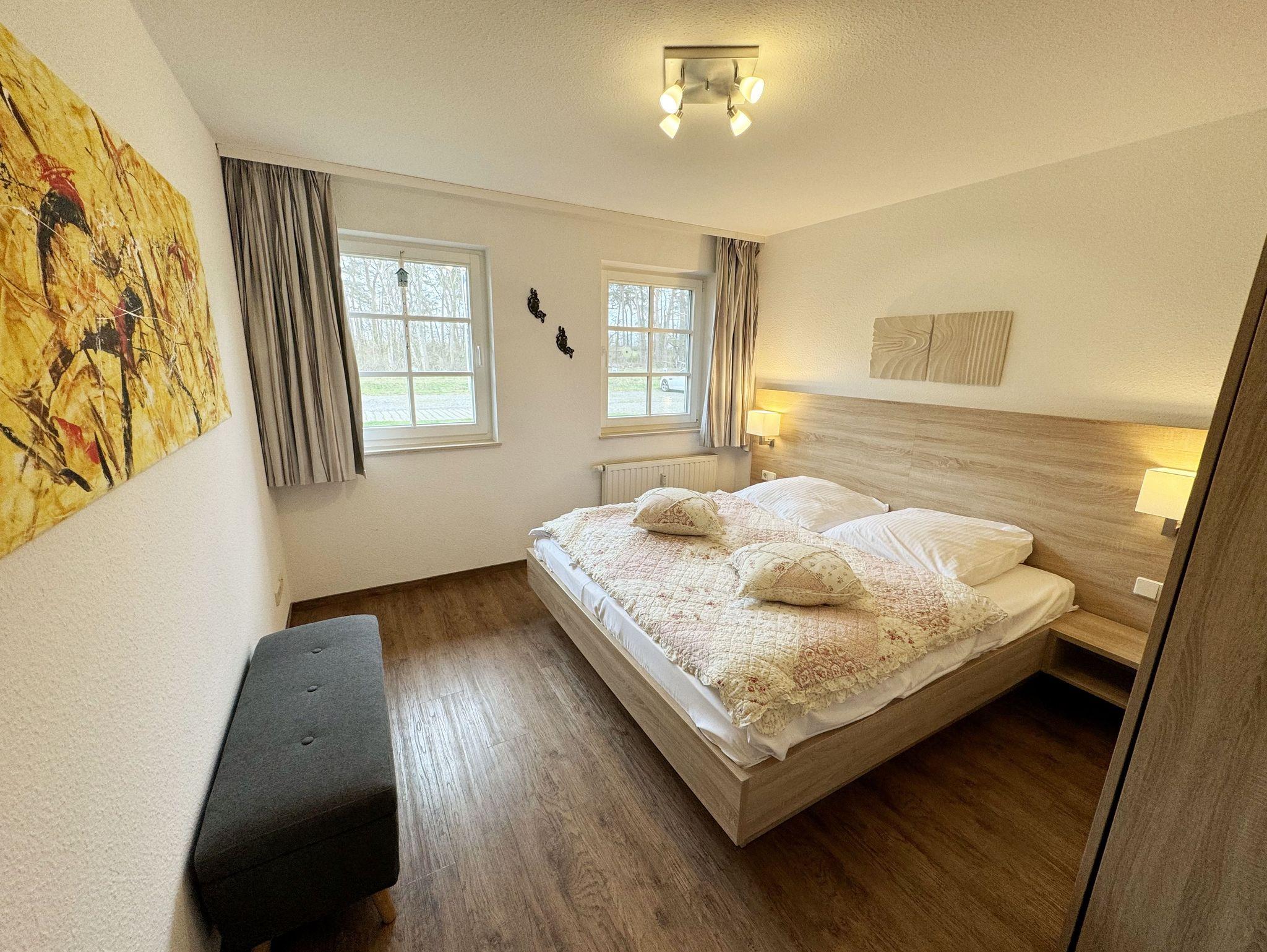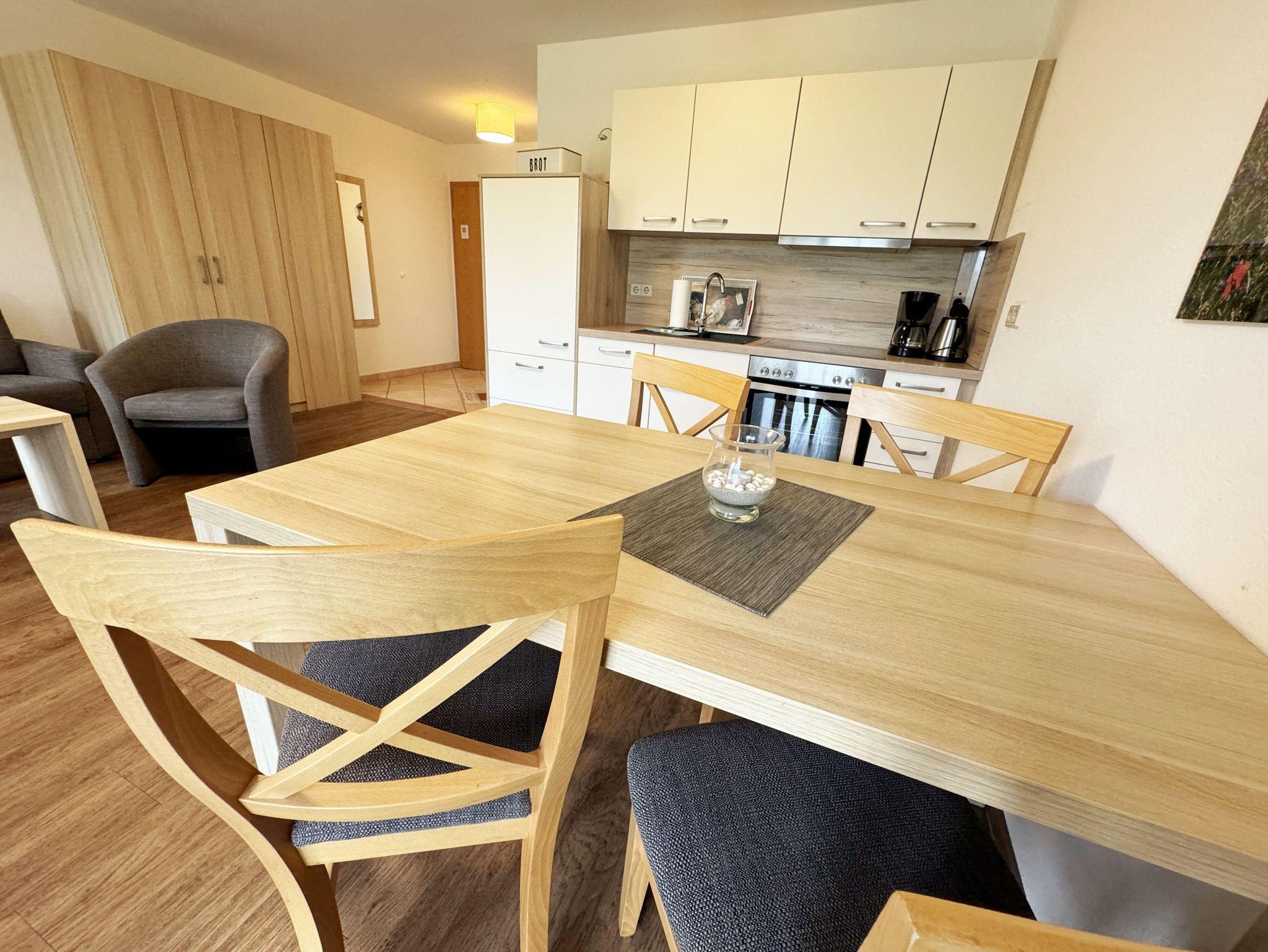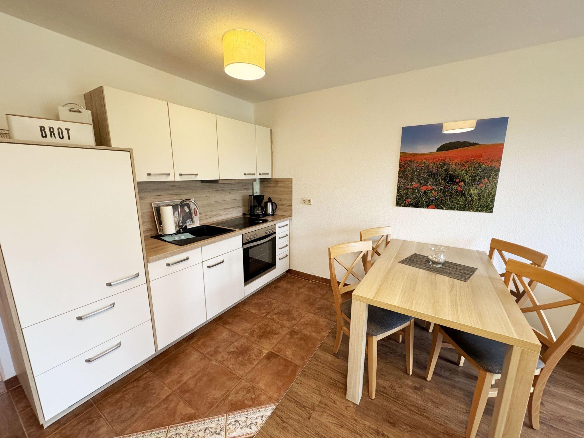 Die Zwei-Zimmer-Ferienwohnung Nr. 5 befindet sich im Erdgeschoss. Die Terrassenwohnung ist eine Nichtraucherwohnung. Sie wohnen hier auf insgesamt 48 qm mit max. 4 Personen. Sie verfügt über einen modernen Schlafraum mit einem Doppelbett mit Komfortmatratzen (2 x 0,90 m x 2,00 m), Nachttischkonsolen, Kleiderschrank und ist mit Vinylboden ausgelegt worden. Der Wohn- und Essbereich ist gemütlich eingerichtet. Neben einem Schlafsofa (Aufbettungsmöglichkeit für die 3./4. Person, 1,50m x 1,90m) finden Sie hier auch einen Couchtisch, Flachbild-TV sowie einen Essplatz mit vier Stühlen. Die Küchenzeile ist komplett eingerichtet mit Spülmaschine, Ceran-Kochfeld, Backofen, Kühlschrank mit 3 ***Gefrierfach, Toaster, Wasserkocher, Kaffeemaschine sowie diverse Küchenutensilien, die Sie zur Selbstverpflegung benötigen. Vom Wohnbereich gelangen Sie auf die bestuhlte und überdachte Terrasse. Das geflieste Badezimmer verfügt über eine Dusche, einen Waschtisch und ein WC. Haustiere sind nicht erlaubt. Die Internetnutzung (WLAN) ist für Sie inklusive. Ein PKW-Stellplatz Nr. 05 steht Ihnen vor dem Haus zur Verfügung. Auf dem Grundstück können Sie Ihre Fahrräder abstellen. Die Erstausstattung eines Wäschepaketes (komplette Bettwäsche, 1 Duschhandtuch, 1 kleines Handtuch) können Sie bis 14 Tage vor Anreise gegen einen Aufpreis dazu buchen oder durch eigene ergänzen. Ab 2 gebuchten Paketen erhalten Sie einmalig 1 Geschirrhandtuch und 1 Duschvorleger hinzu.