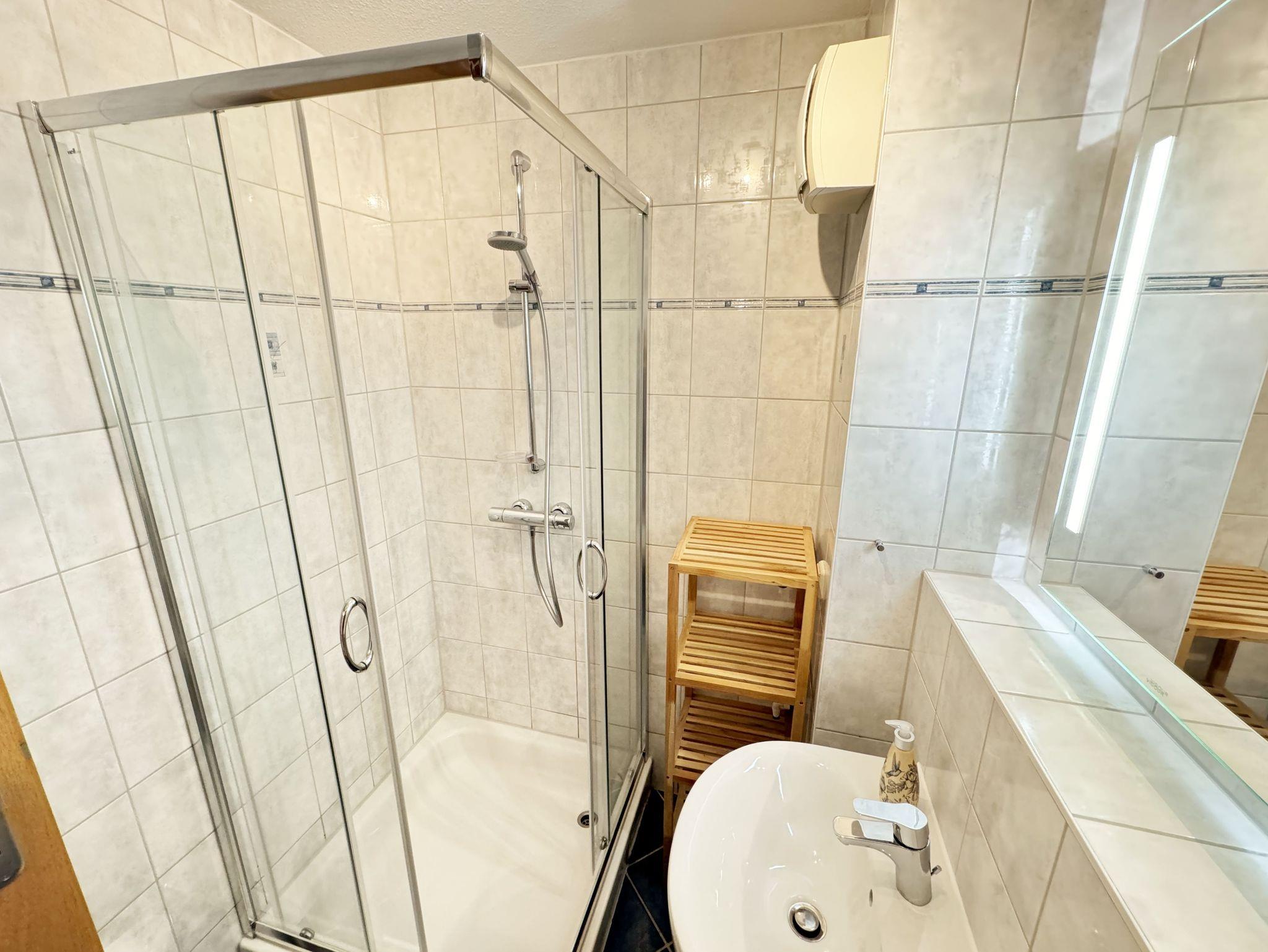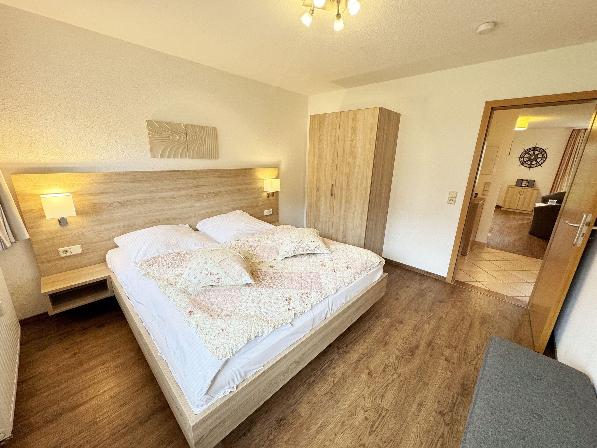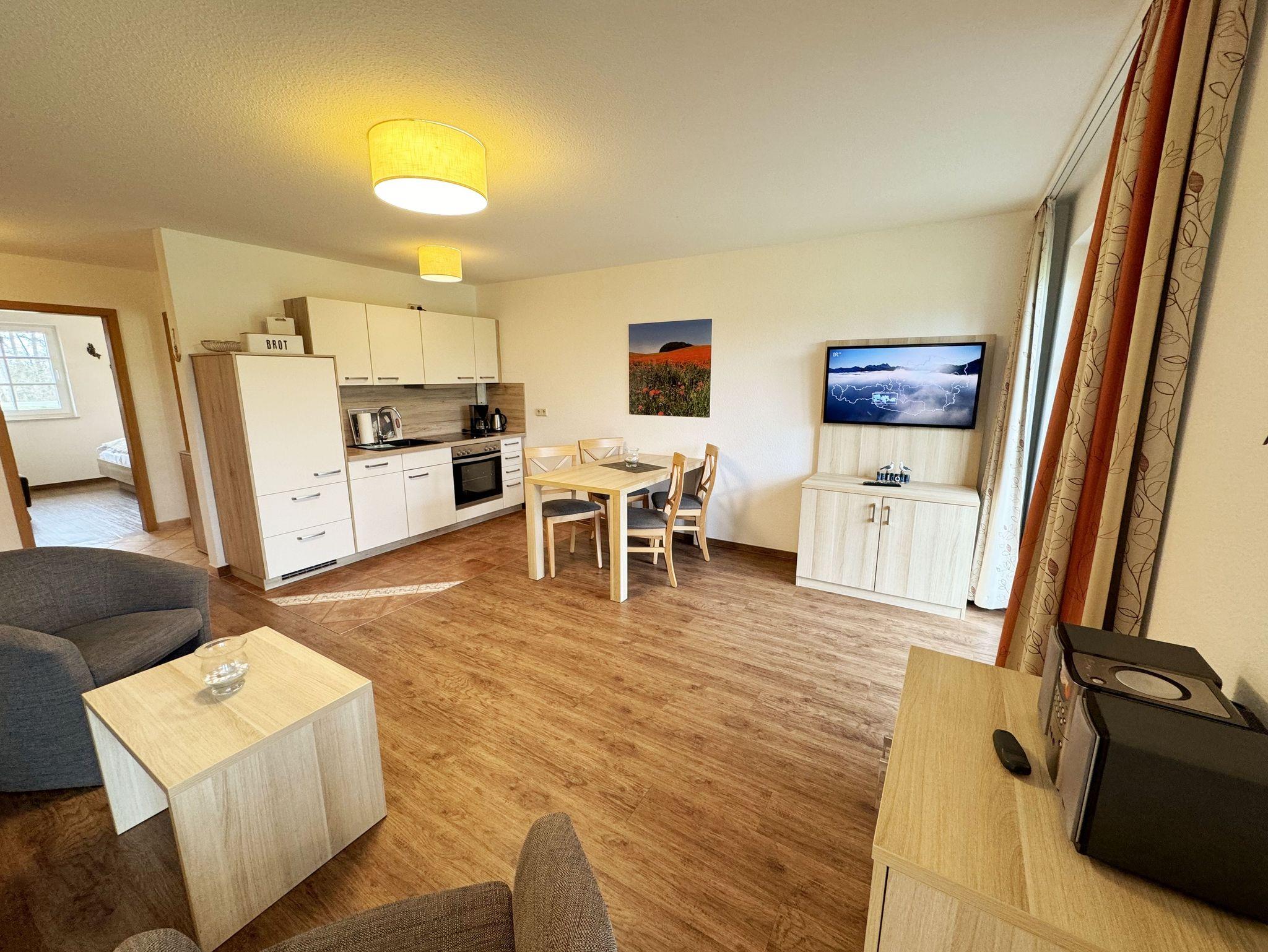 Die Zwei-Zimmer-Ferienwohnung Nr. 5 befindet sich im Erdgeschoss. Die Terrassenwohnung ist eine Nichtraucherwohnung. Sie wohnen hier auf insgesamt 48 qm mit max. 4 Personen. Sie verfügt über einen modernen Schlafraum mit einem Doppelbett mit Komfortmatratzen (2 x 0,90 m x 2,00 m), Nachttischkonsolen, Kleiderschrank und ist mit Vinylboden ausgelegt worden. Der Wohn- und Essbereich ist gemütlich eingerichtet. Neben einem Schlafsofa (Aufbettungsmöglichkeit für die 3./4. Person, 1,50m x 1,90m) finden Sie hier auch einen Couchtisch, Flachbild-TV sowie einen Essplatz mit vier Stühlen. Die Küchenzeile ist komplett eingerichtet mit Spülmaschine, Ceran-Kochfeld, Backofen, Kühlschrank mit 3 ***Gefrierfach, Toaster, Wasserkocher, Kaffeemaschine sowie diverse Küchenutensilien, die Sie zur Selbstverpflegung benötigen. Vom Wohnbereich gelangen Sie auf die bestuhlte und überdachte Terrasse. Das geflieste Badezimmer verfügt über eine Dusche, einen Waschtisch und ein WC. Haustiere sind nicht erlaubt. Die Internetnutzung (WLAN) ist für Sie inklusive. Ein PKW-Stellplatz Nr. 05 steht Ihnen vor dem Haus zur Verfügung. Auf dem Grundstück können Sie Ihre Fahrräder abstellen. Die Erstausstattung eines Wäschepaketes (komplette Bettwäsche, 1 Duschhandtuch, 1 kleines Handtuch) können Sie bis 14 Tage vor Anreise gegen einen Aufpreis dazu buchen oder durch eigene ergänzen. Ab 2 gebuchten Paketen erhalten Sie einmalig 1 Geschirrhandtuch und 1 Duschvorleger hinzu.