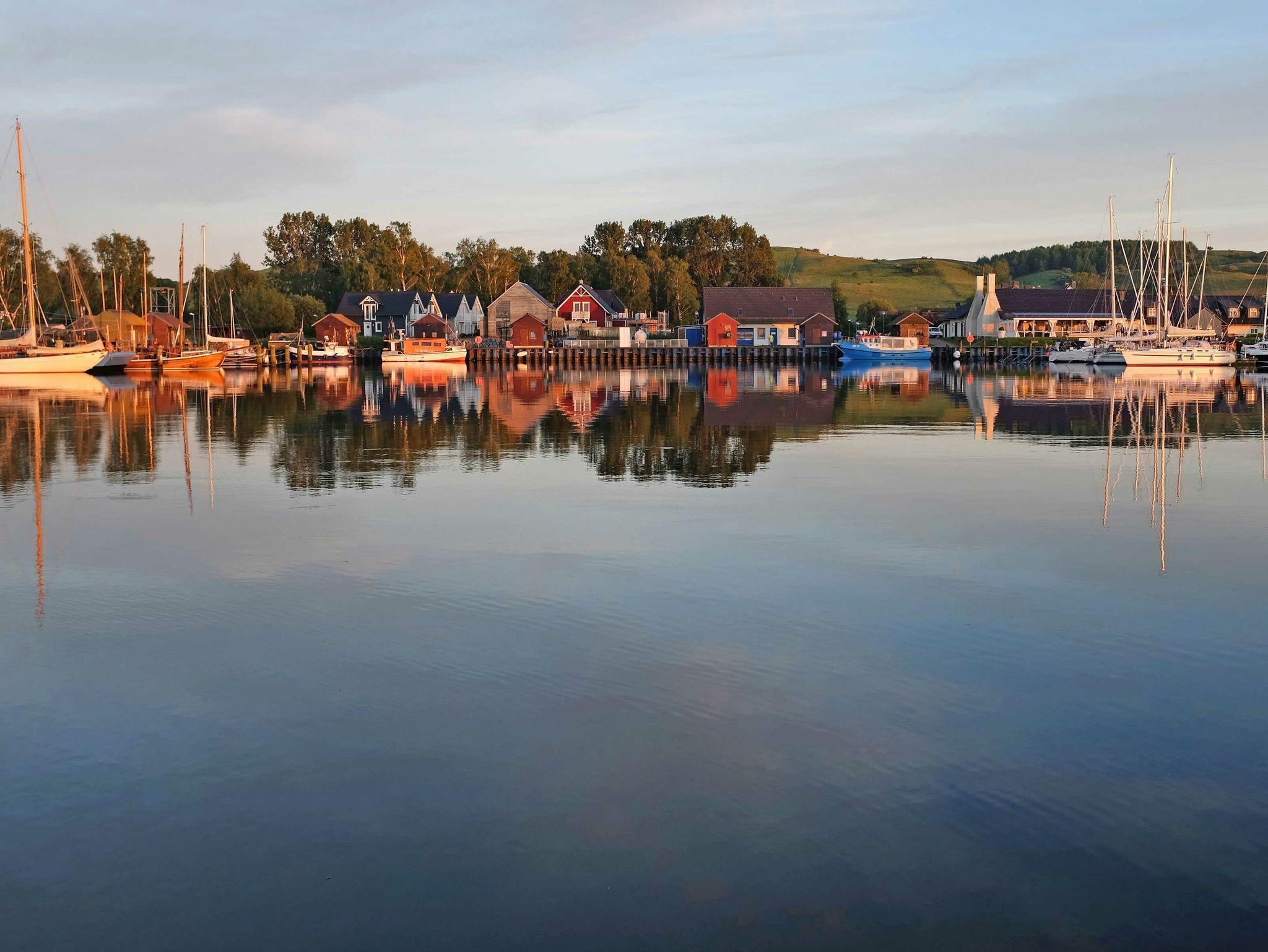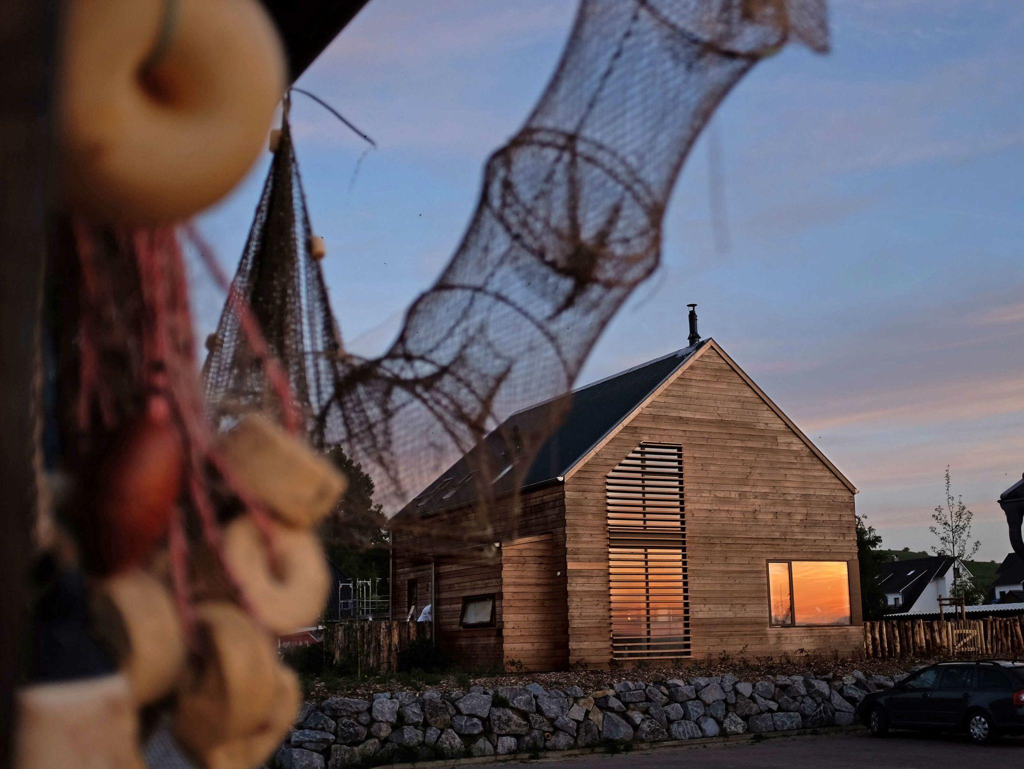 Mit Wasser direkt vor dem Bug, könnte das Haus auf der Halbinsel Mönchgut am Südostzipfel von Rügen nicht besser gelegen sein. Der freie Blick öffnet sich Richtung Südwesten auf die Hagensche Wiek bis zum Jagdschloss Granitz auf dem Tempelberg. Nach Achtern wird das Ferienhaus von den Zickerschen Alpen eingerahmt. Diese mehr als 60 Meter hohe, sanft geschwungene Hügellandschaft gehört zum Biosphärenreservat Südost-Rügen, wird ökologisch korrekt von Schafen beweidet und ist ein Paradies für Wanderer und Spaziergänger. Nur hundert Meter vom Haus entfernt findet sich der Boddenstrand, ein beliebtes Revier für Kite-Surfer. Bis zum feinsandigen Strand, der zwischen Lobbe und dem Seebad Thiessow auf einer Länge von fünf Kilometern sanft in die glasklare Ostsee abfällt, sind es nur 1 800 Meter, zu Fuß oder mit dem Rad nur wenige Minuten. Auch das beliebte Seebad Sellin, mit zahlreichen Restaurants und traditionsreicher Bäderarchitektur liegt ganz in der Nähe.