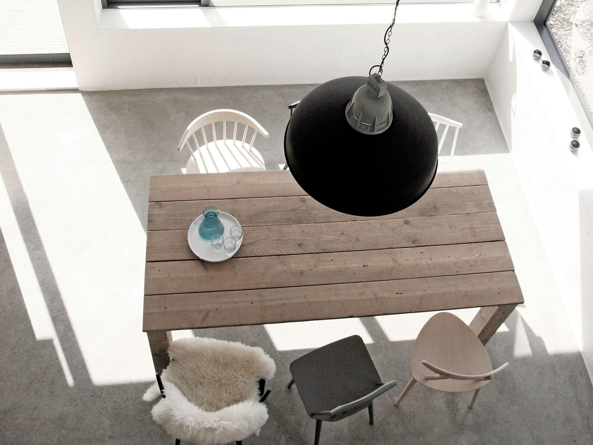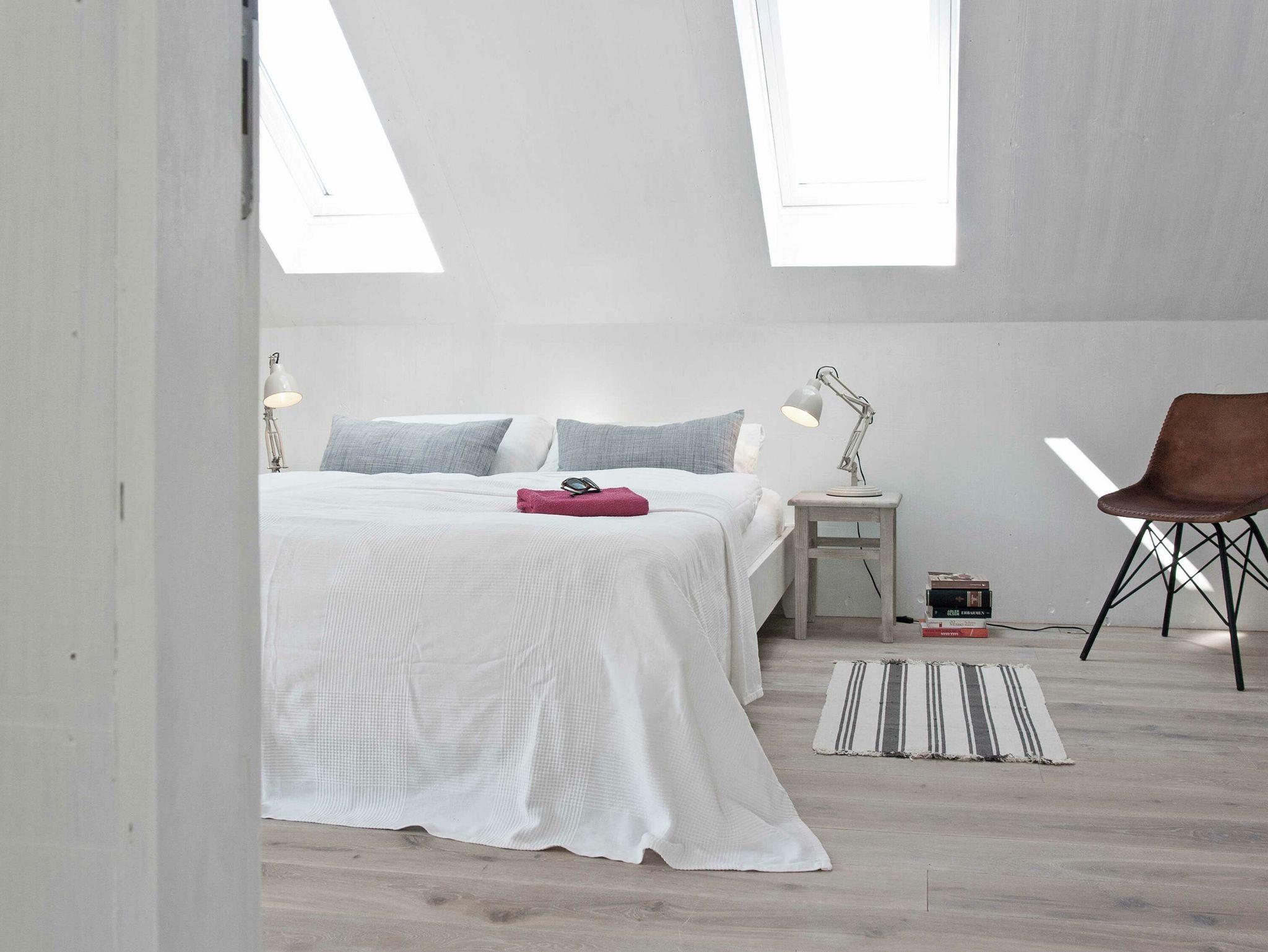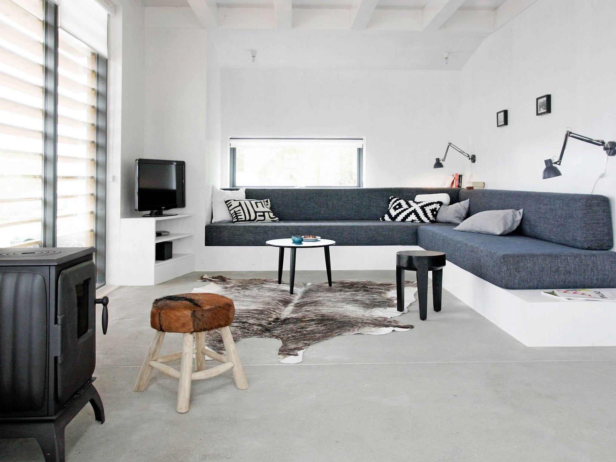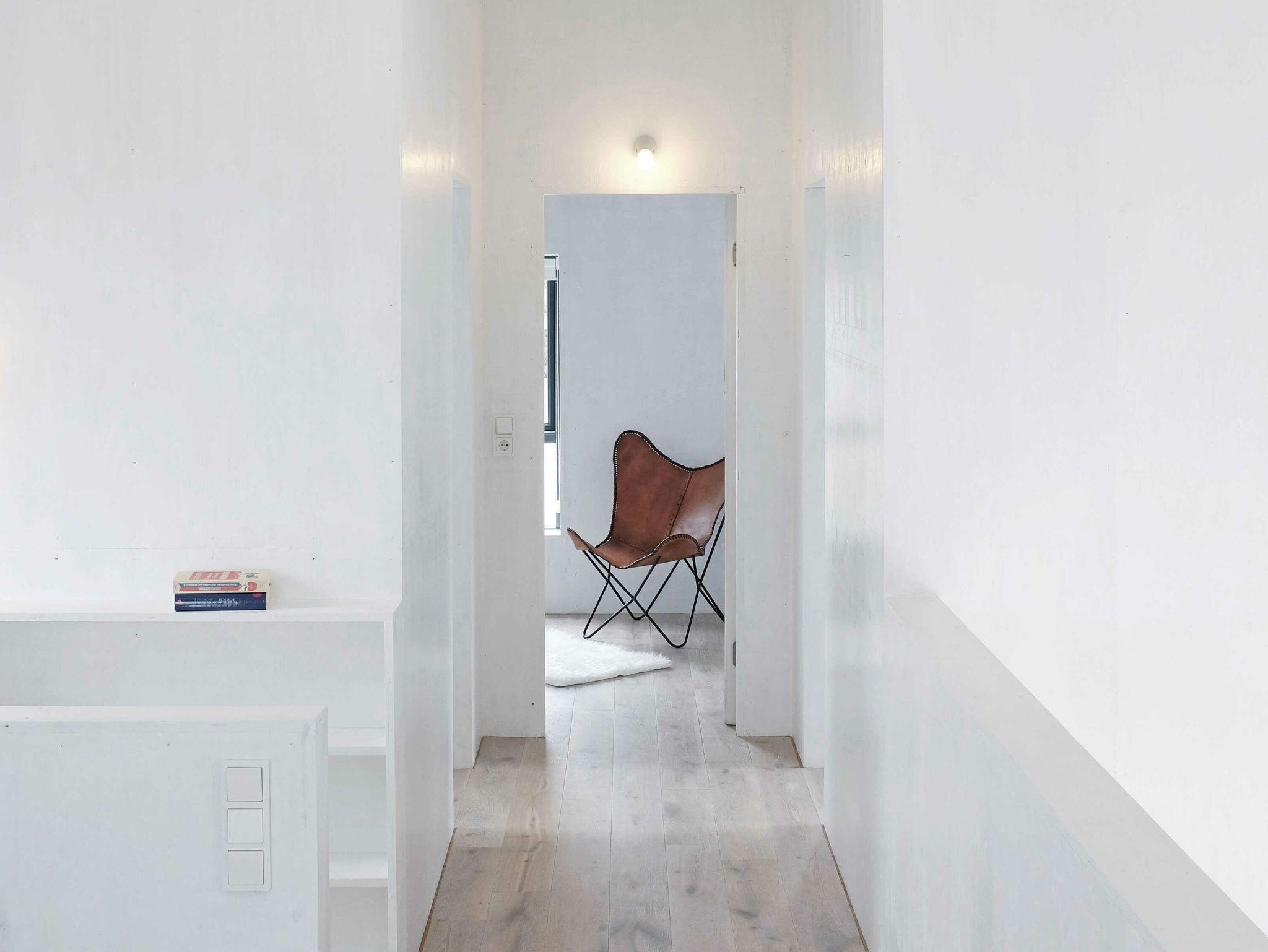 Die maßangefertigten dänischen Fenster mit großen Fronten und schlichten schiefergrauen Holzrahmen bilden einen interessanten Kontrast zu den weiß lackierten Seekieferplatten, mit denen die Innenräume verkleidet sind. Der Fußboden im Erdgeschoss besteht aus geschliffenem Sicht-Estrich, im oberen Stockwerk liegt Parkett aus gebürsteten, weiß gekalkten Eichendielen. Das gesamte Haus lässt sich über eine Fußbodenheizung angenehm temperieren und garantiert mit Kaminofen und Sauna das ganze Jahr über eine gemütliche Atmosphäre. Die Einrichtung besteht aus hochwertigen Designmöbeln, die dazu passende Farbpalette findet sich vor allem in den Tönen weiß, grau, mauve und petrol wieder.